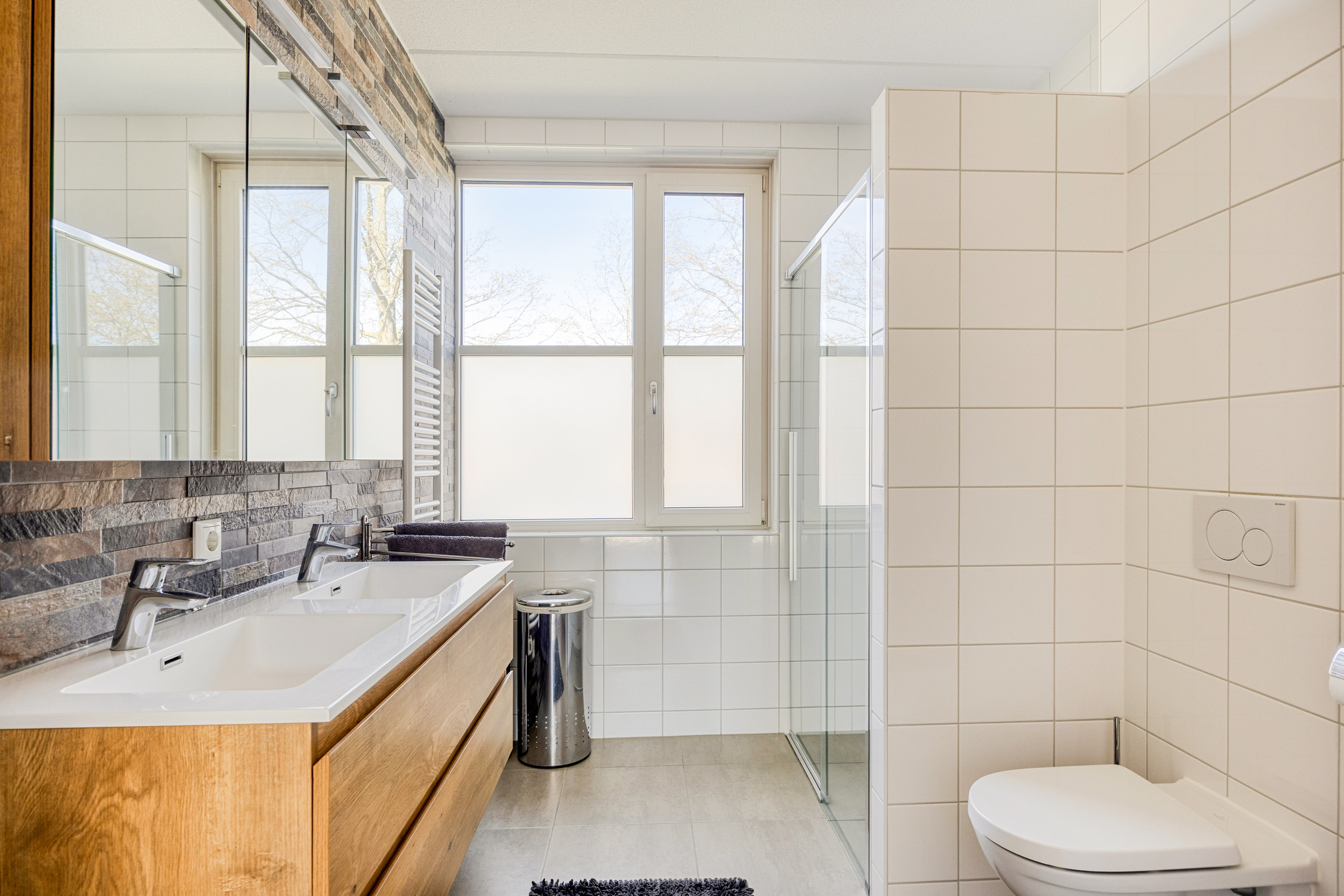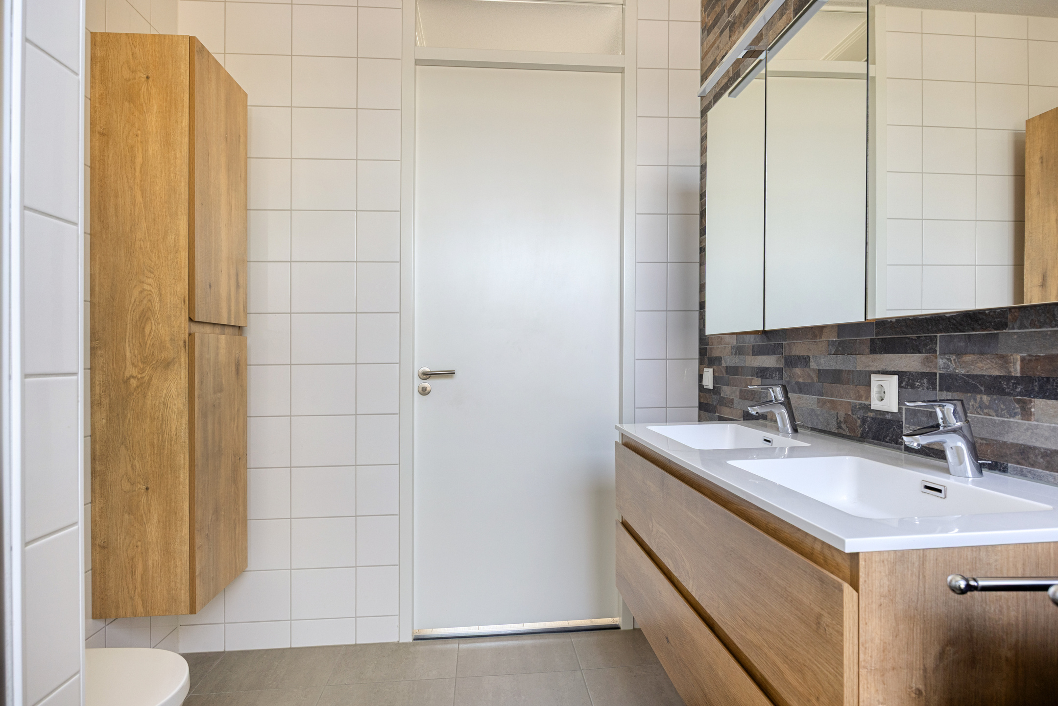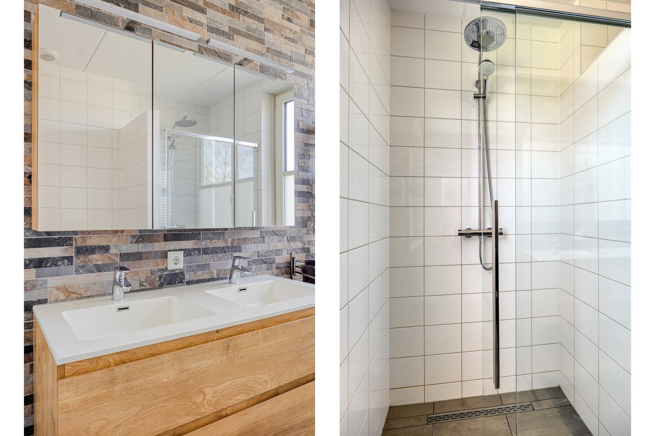 De moderne badkamer is voorzien van toilet, inloopdouche en dubbel wastafelmeubel.