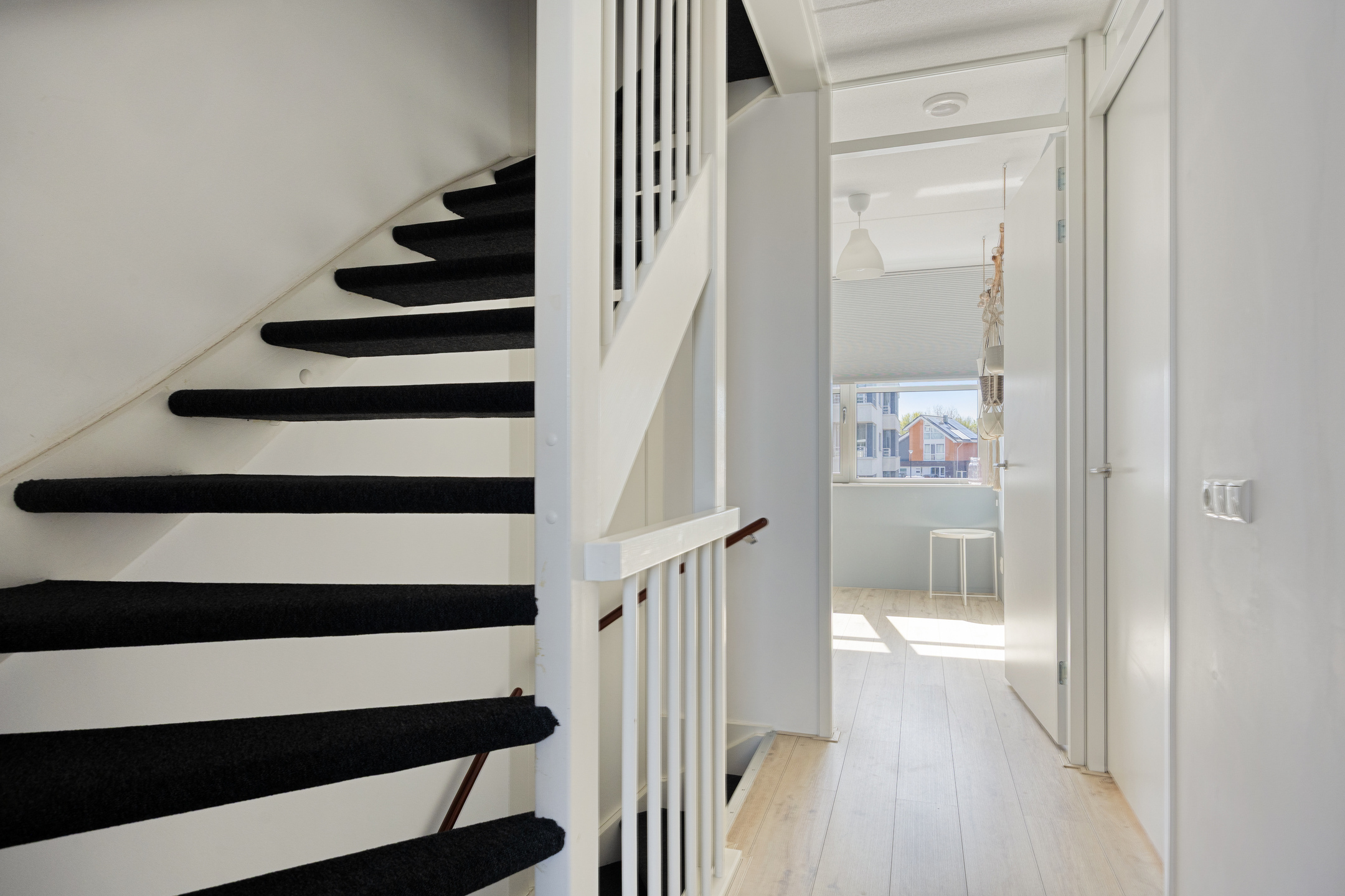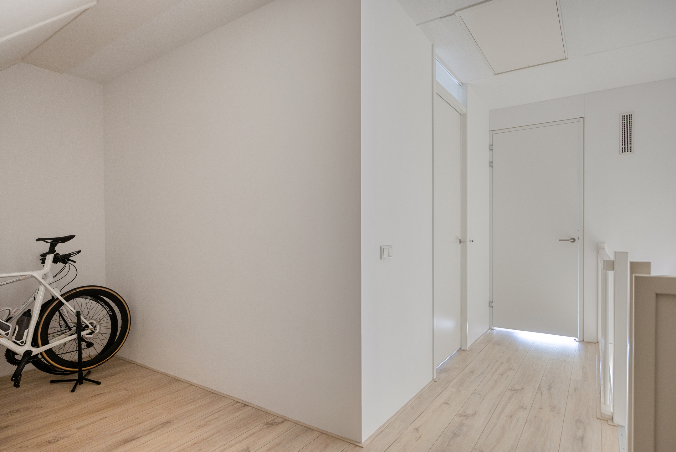 Overloop met toegang tot 3 slaapkamers, badkamer en trap naar de 2e verdieping. De gehele verdieping is v.v. vloerverwarming en laminaat.