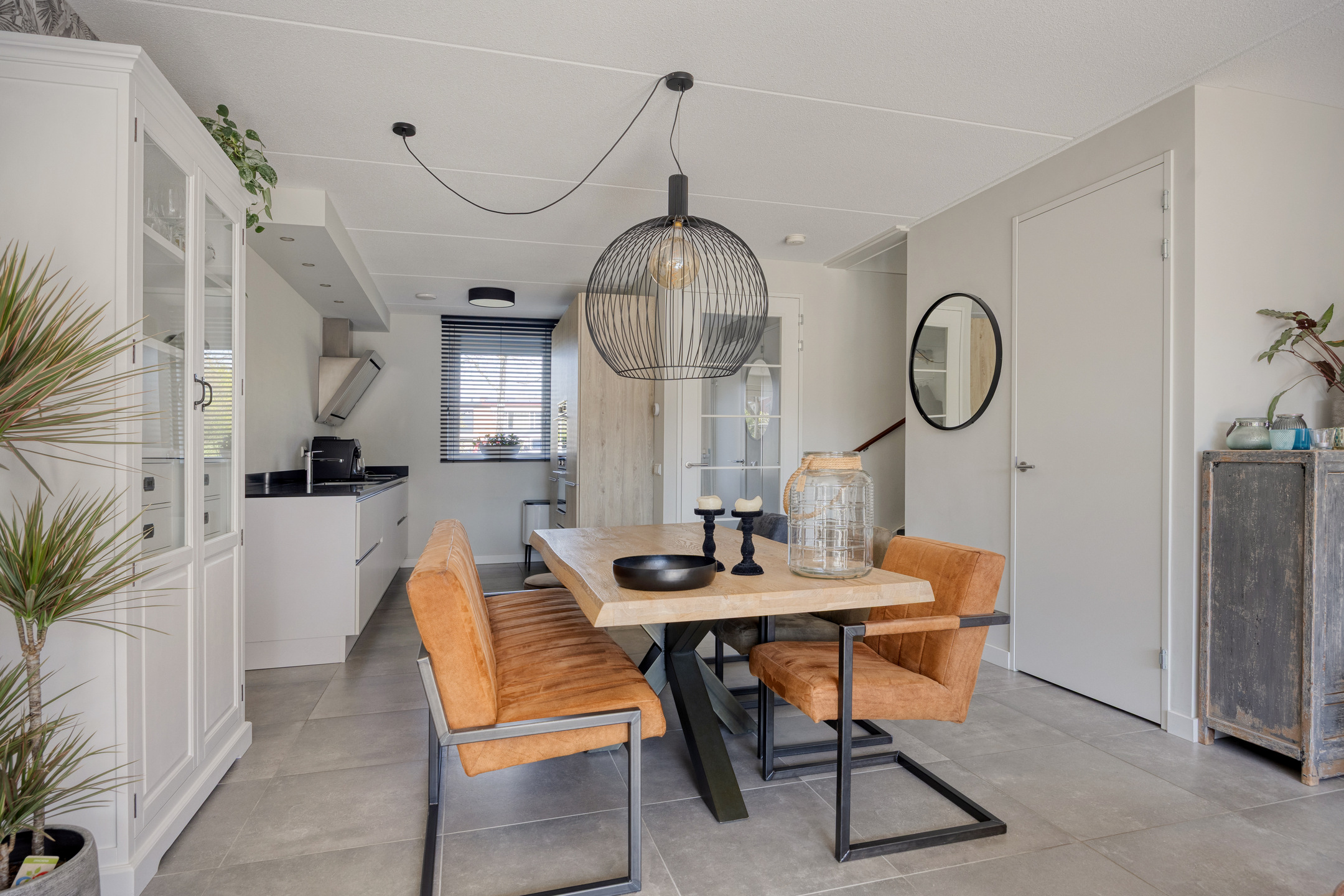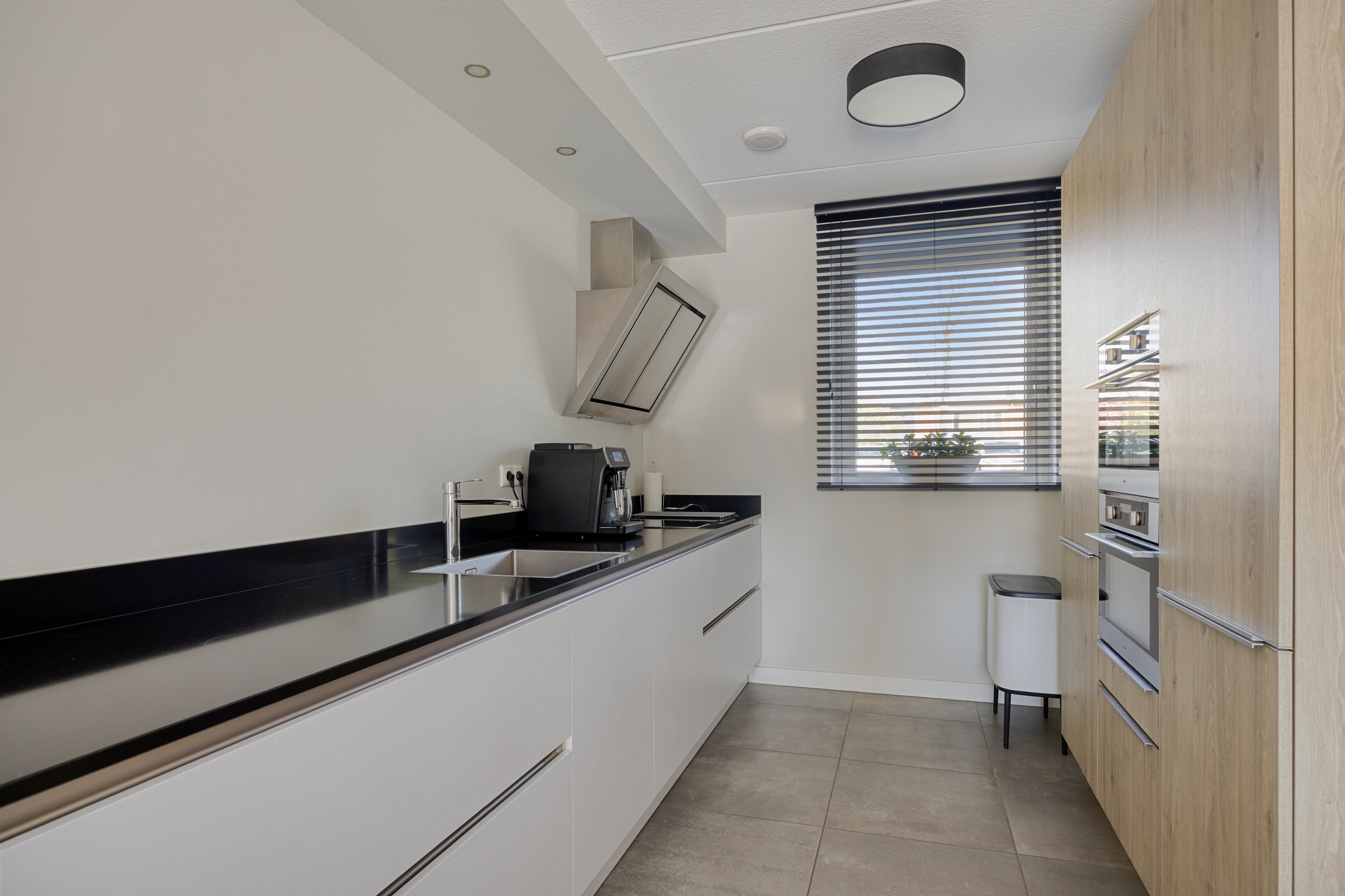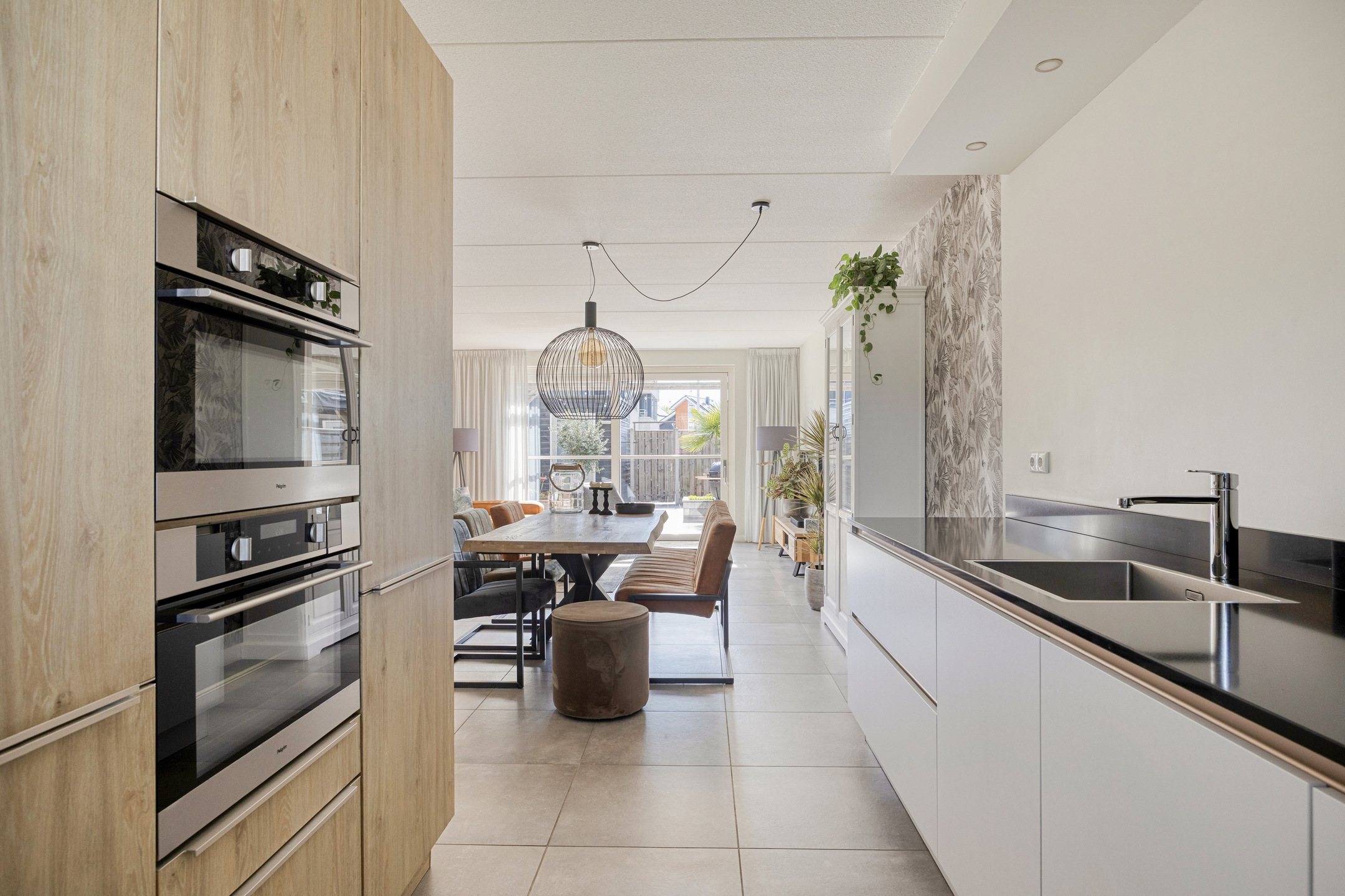 De open keuken met complete opstelling en kastenwand is gelegen aan de voorzijde van de woning. De keuken beschikt over een spoelunit, vaatwasser, inductiekookplaat, afzuigkap, koelkast, vriezer, combi-oven en stoomoven. Door de houtlook en de vele inbouwapparatuur geeft dat de keuken een warme uitstraling.