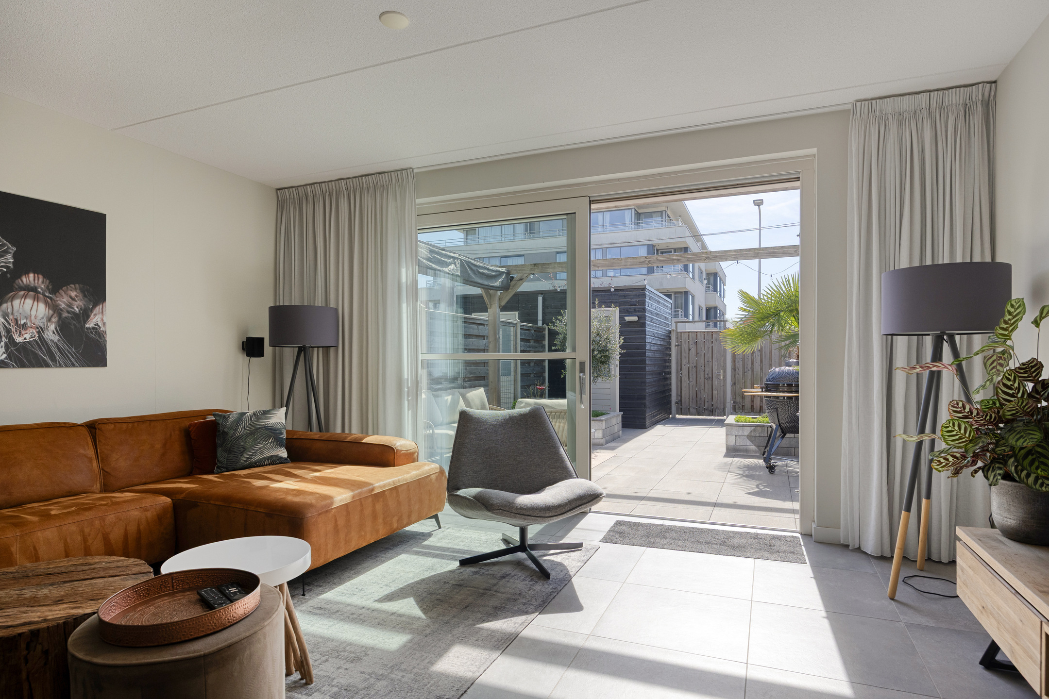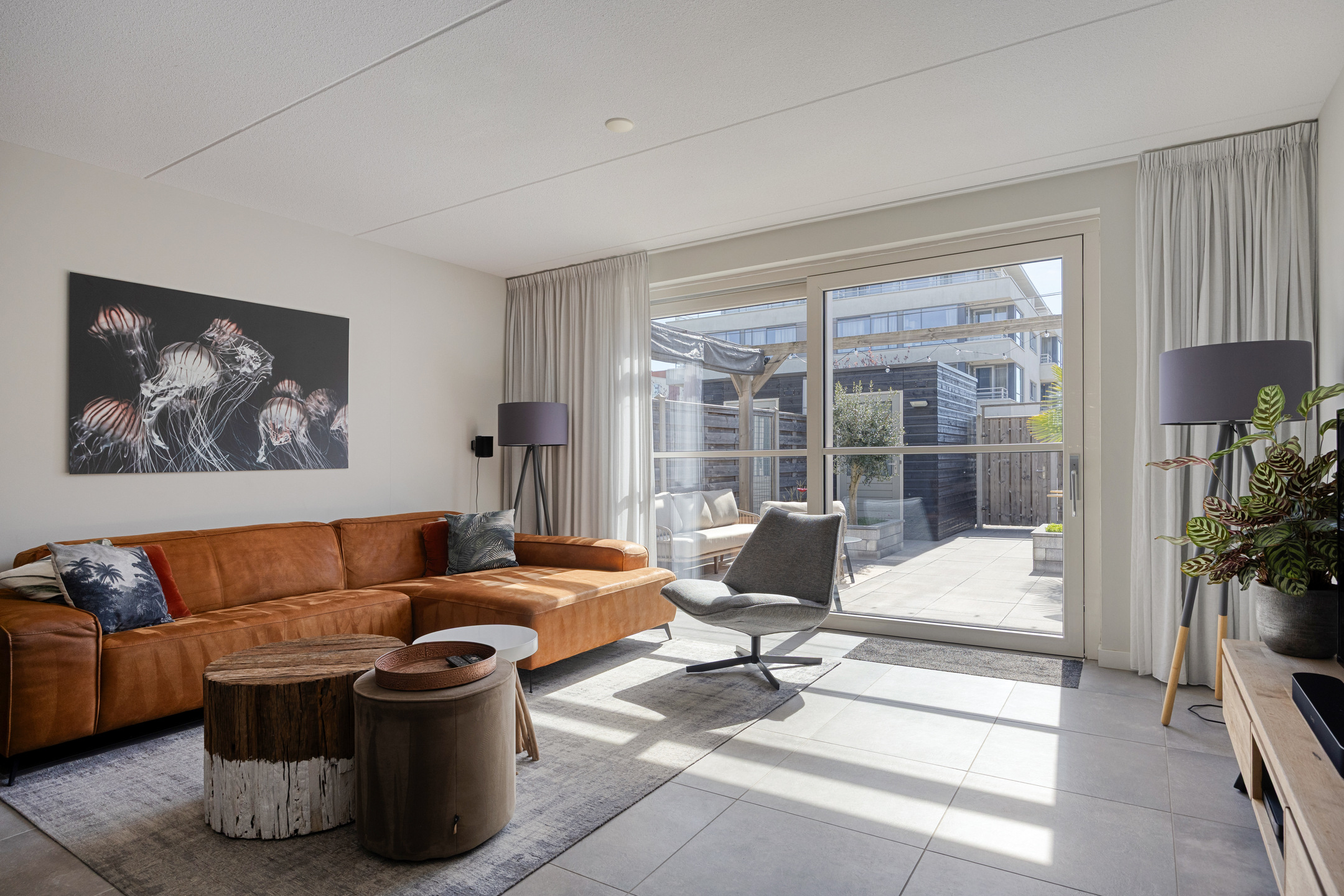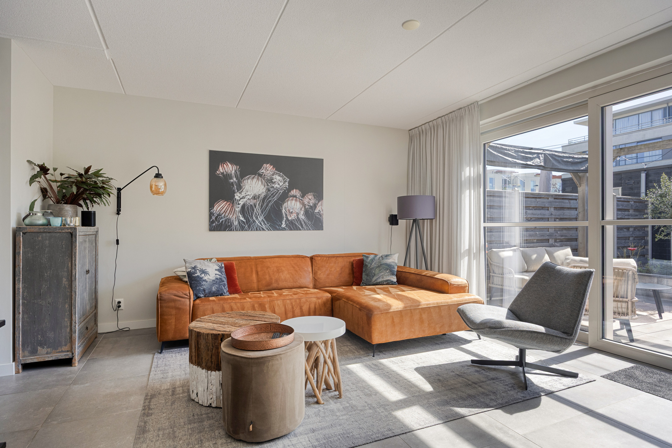 Sfeervolle en uitgebouwde woonkamer met schuifpui naar de tuin, plavuizenvloer, trap naar 1e verdieping en een trapkast. De vloer is voorzien van vloerverwarming (en koeling).