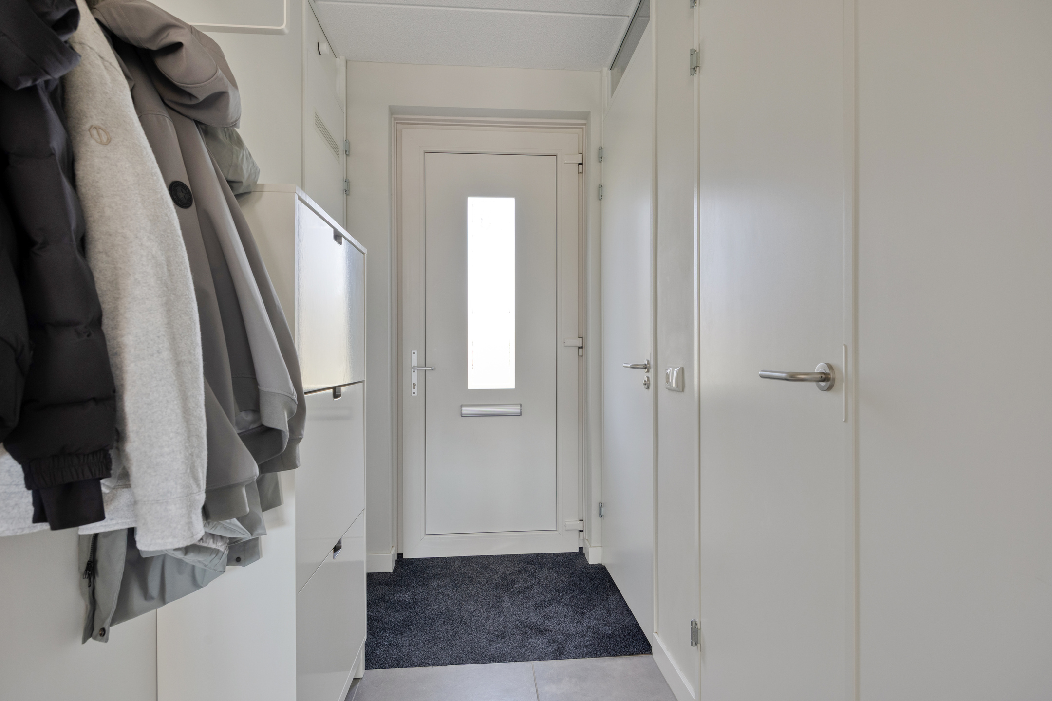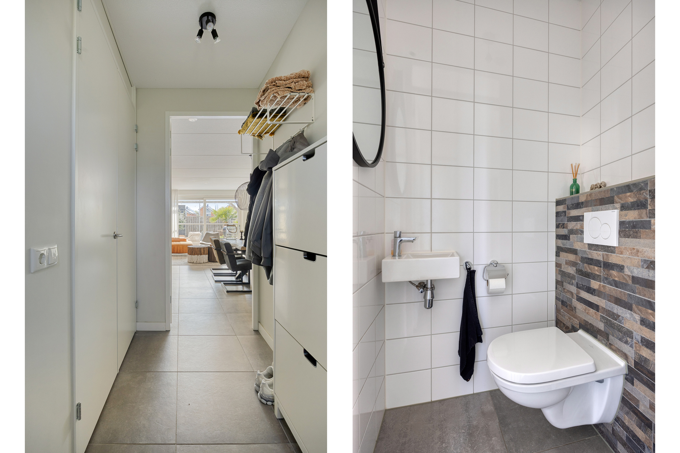 Entree/ hal met garderobe, toilet met fonteintje, kast met de warmtepomp en meterkast.