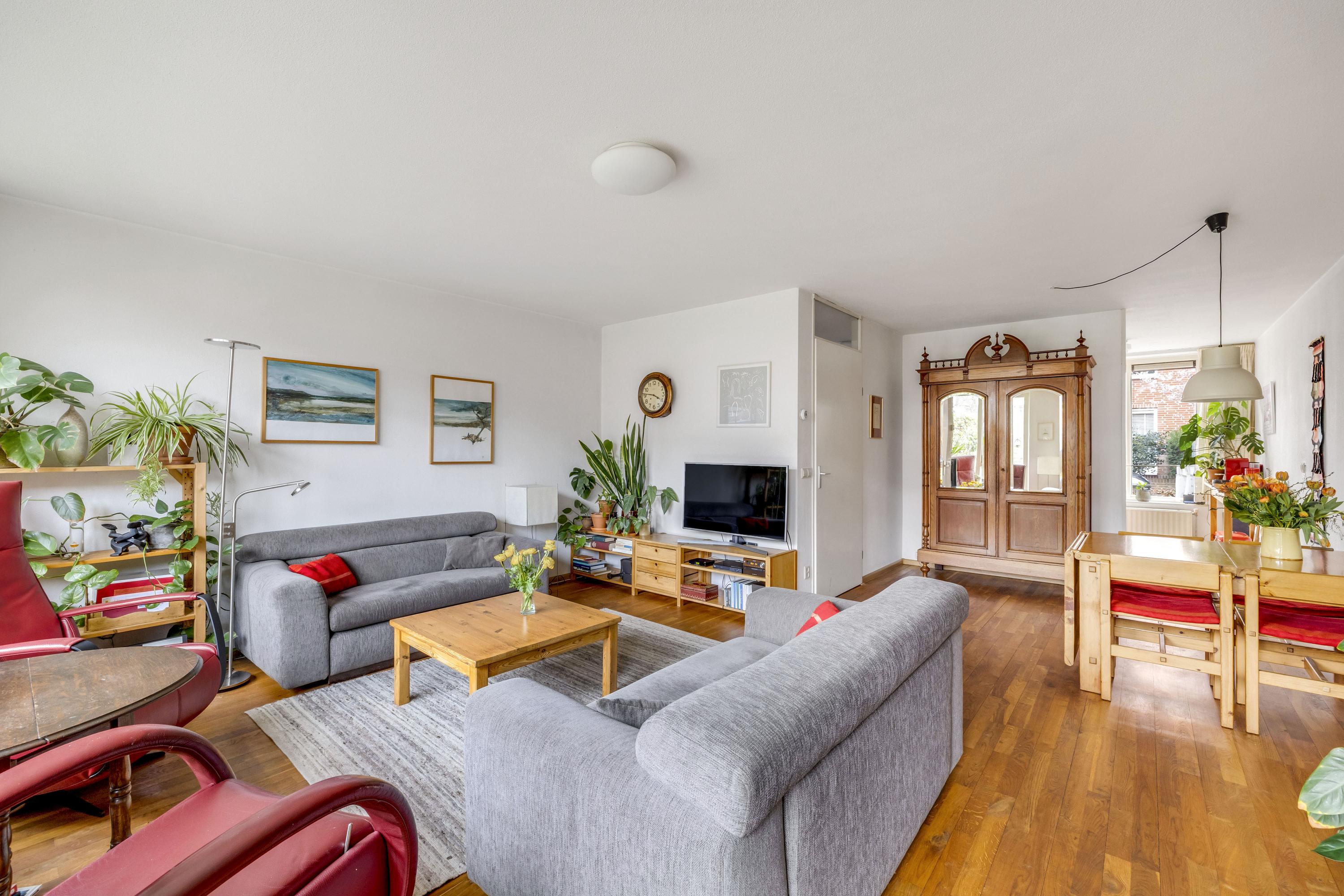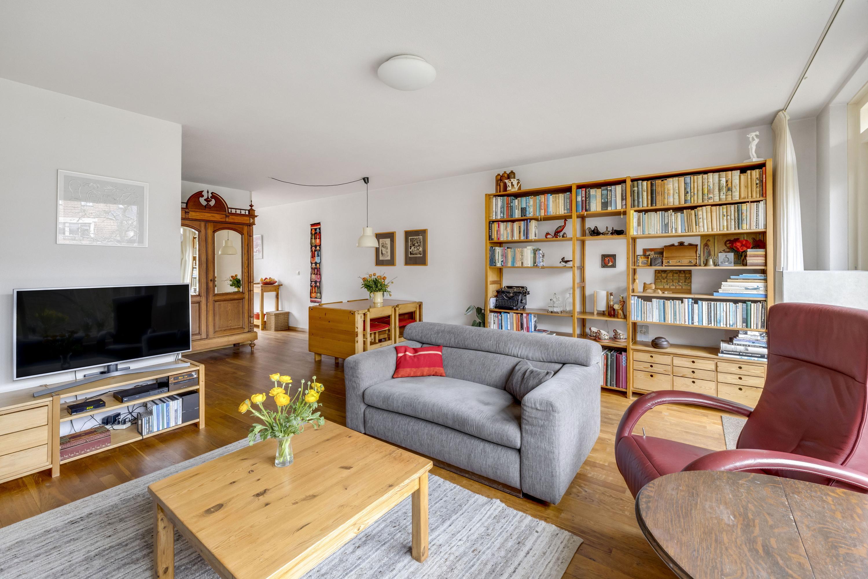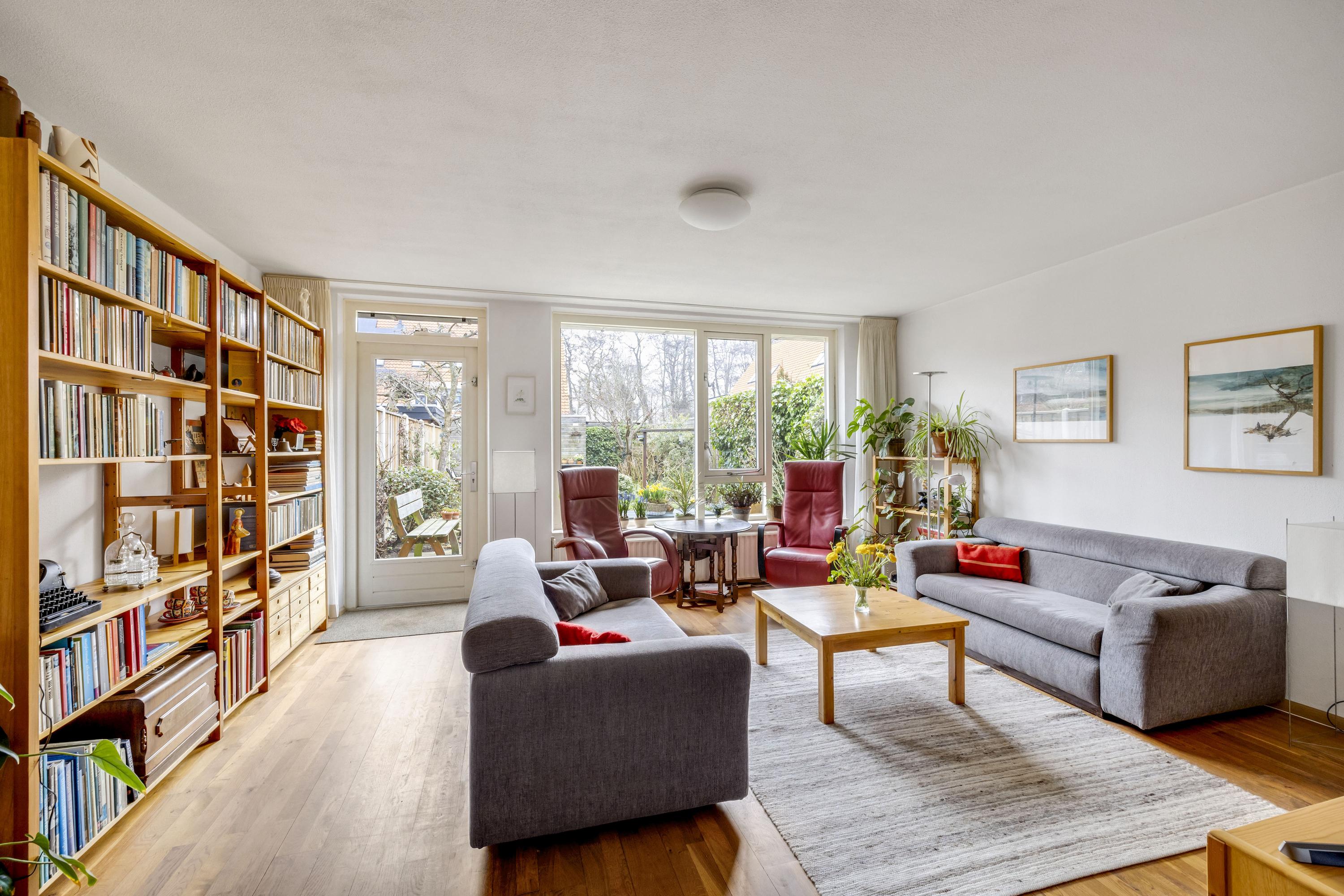 Royale lichte woonkamer gelegen aan de achterzijde van de woning met toegang tot de tuin. De vloer is v.v. een massief eiken plankenvloer.