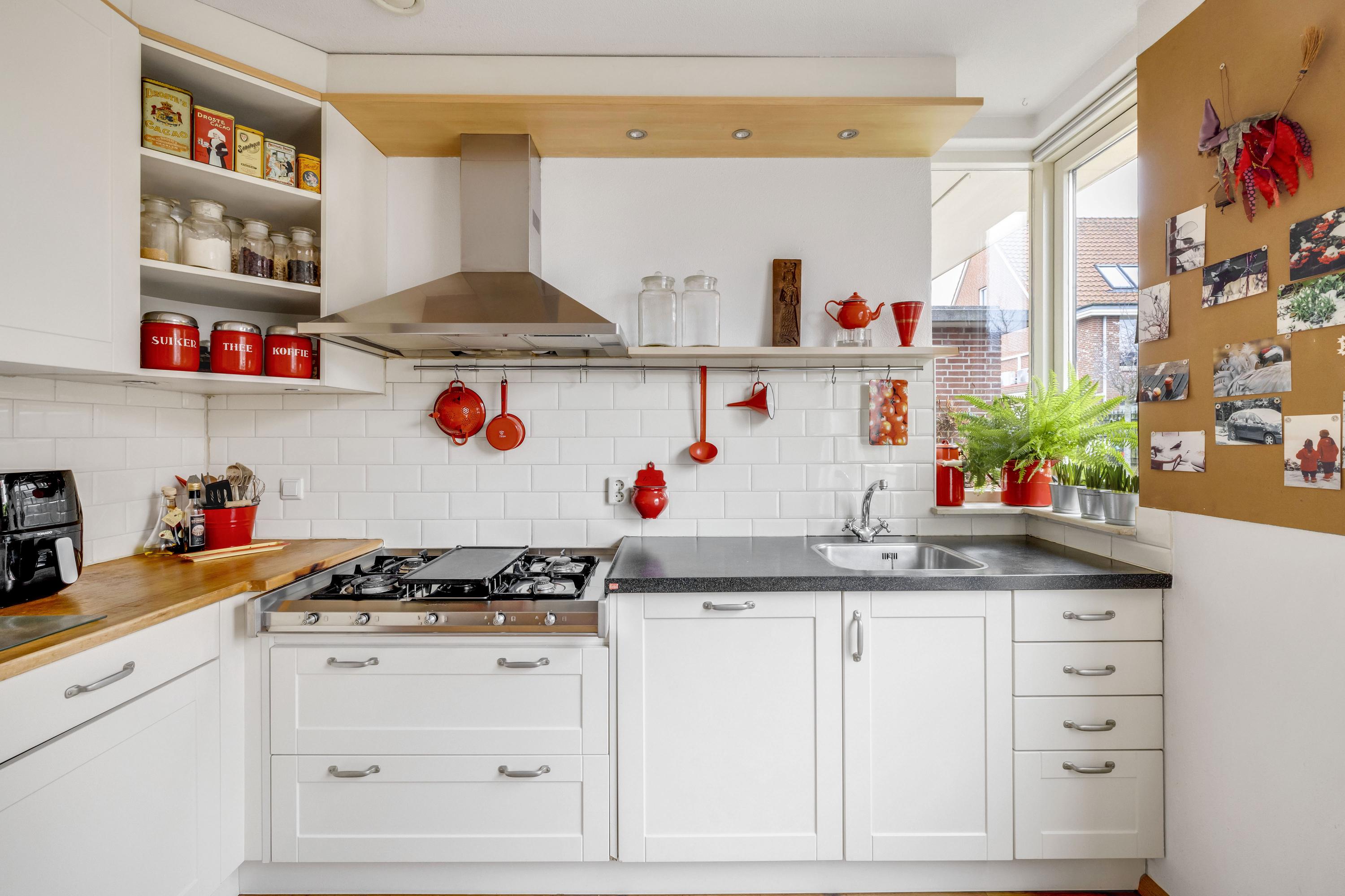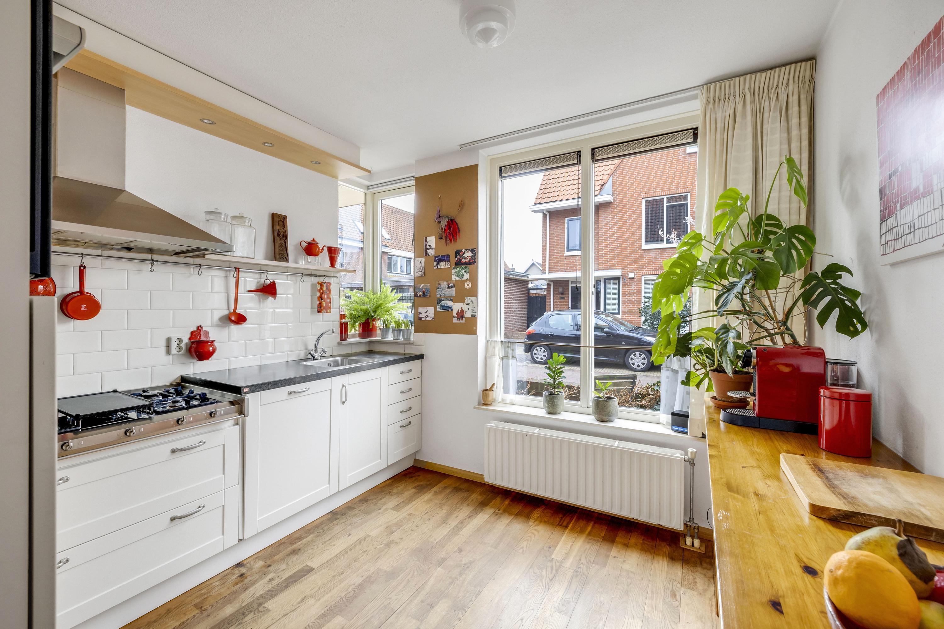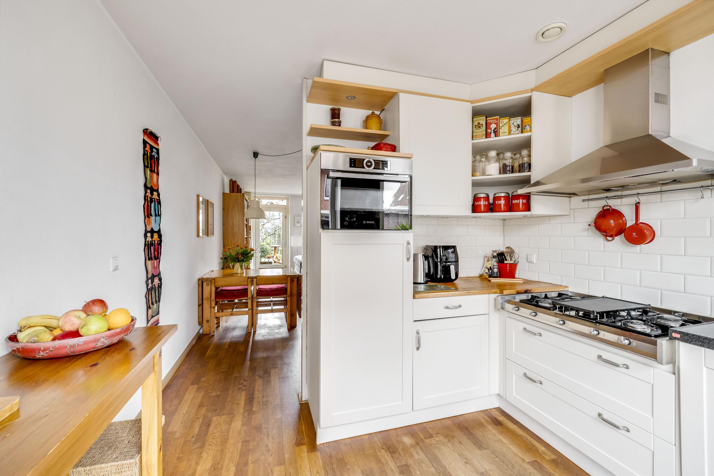 De open keuken bevindt zich aan de voorzijde van de woning. De hoekopstelling beschikt over een spoelunit, vaatwasser, 5-pits gaskookplaat, RVS afzuigkap, combi-oven en koelkast met vriesvak.