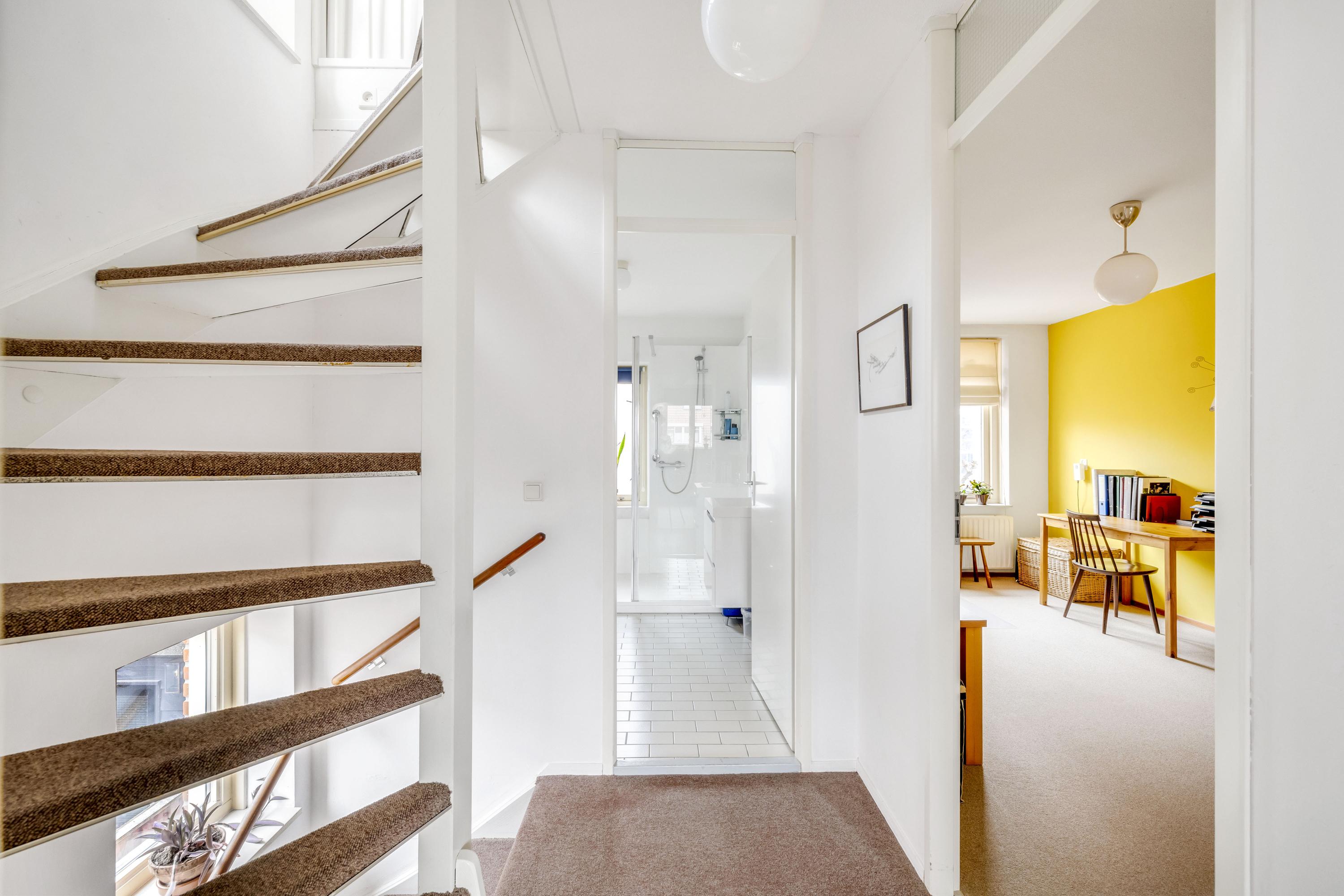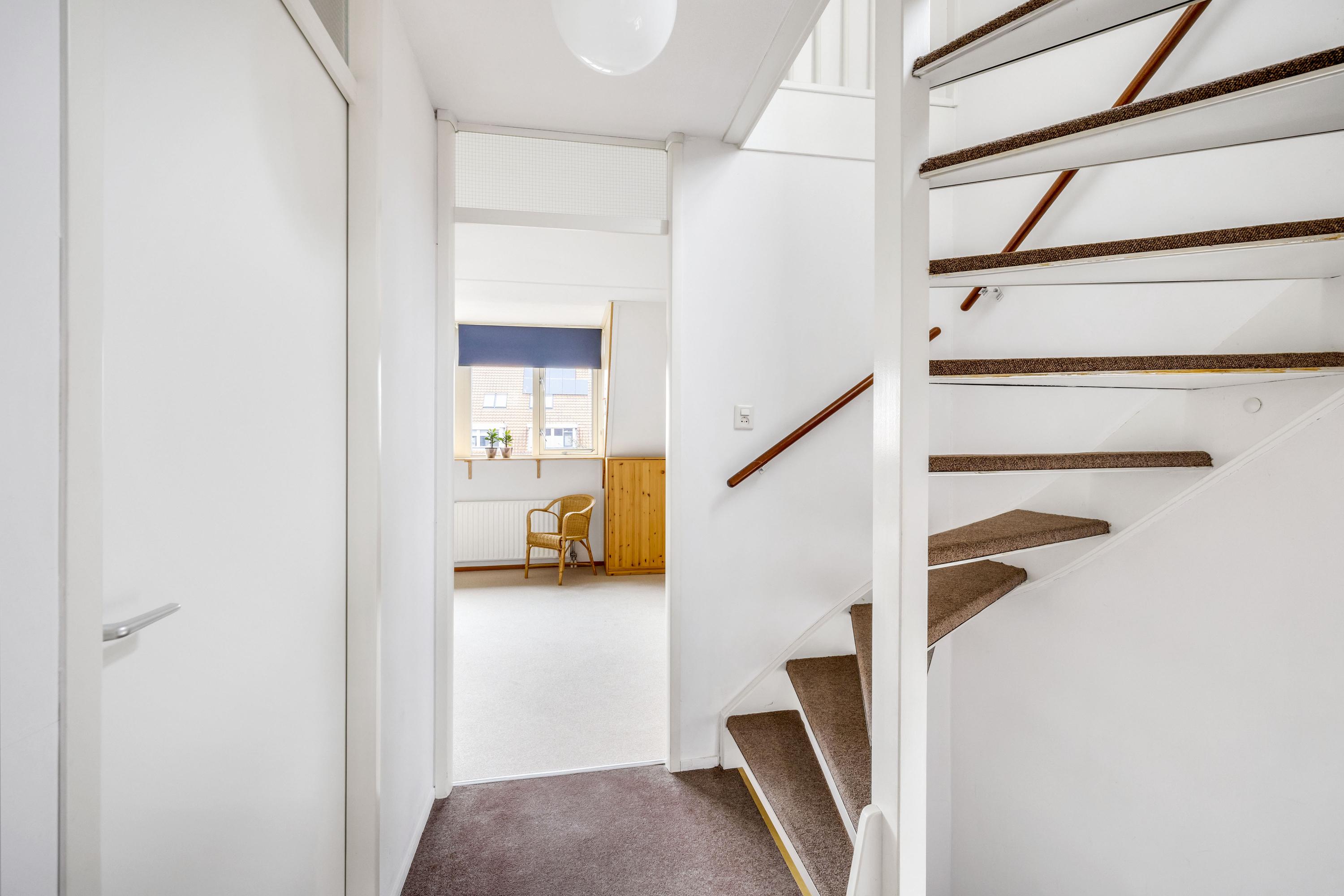 Overloop met zijraam, trapopgang naar 2e verdieping en toegang tot de slaapkamers. De gehele verdieping is v.v. tapijt.