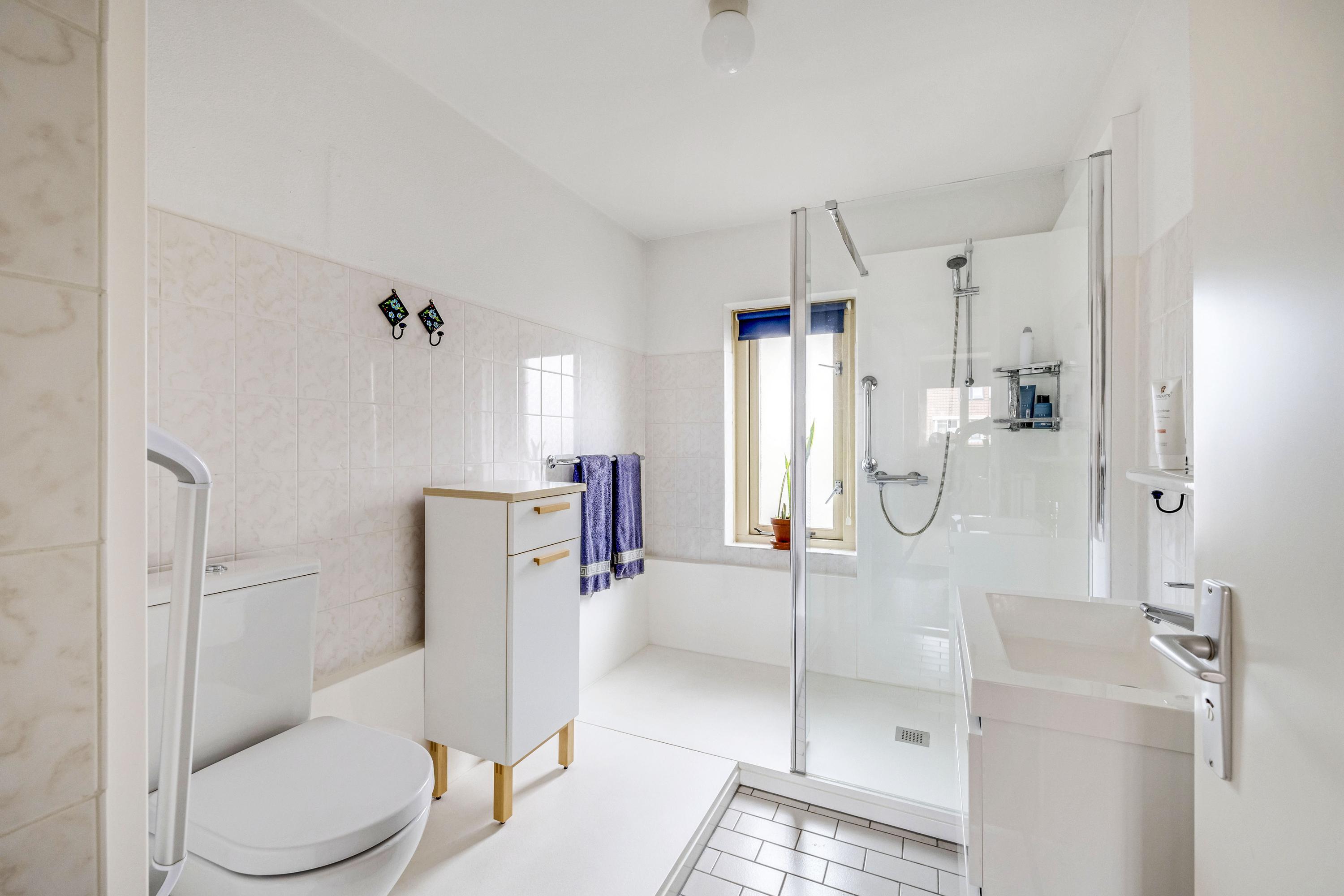 De badkamer beschikt over een inloopdouche, 2e toilet, wastafelmeubel en radiator.