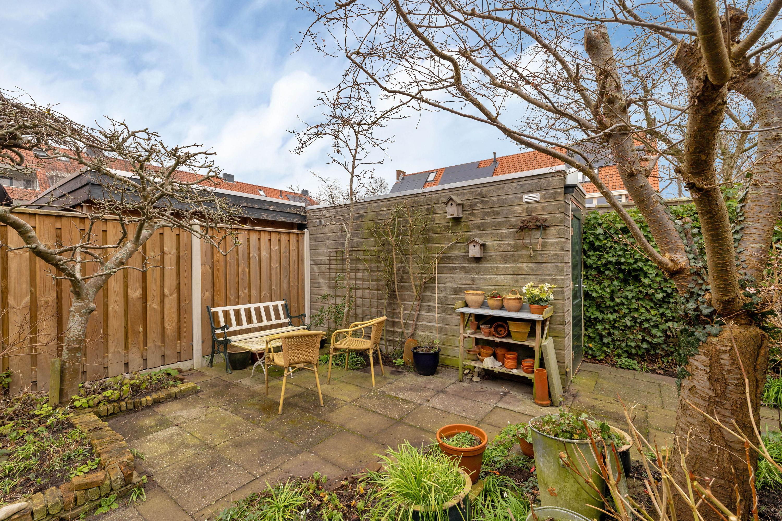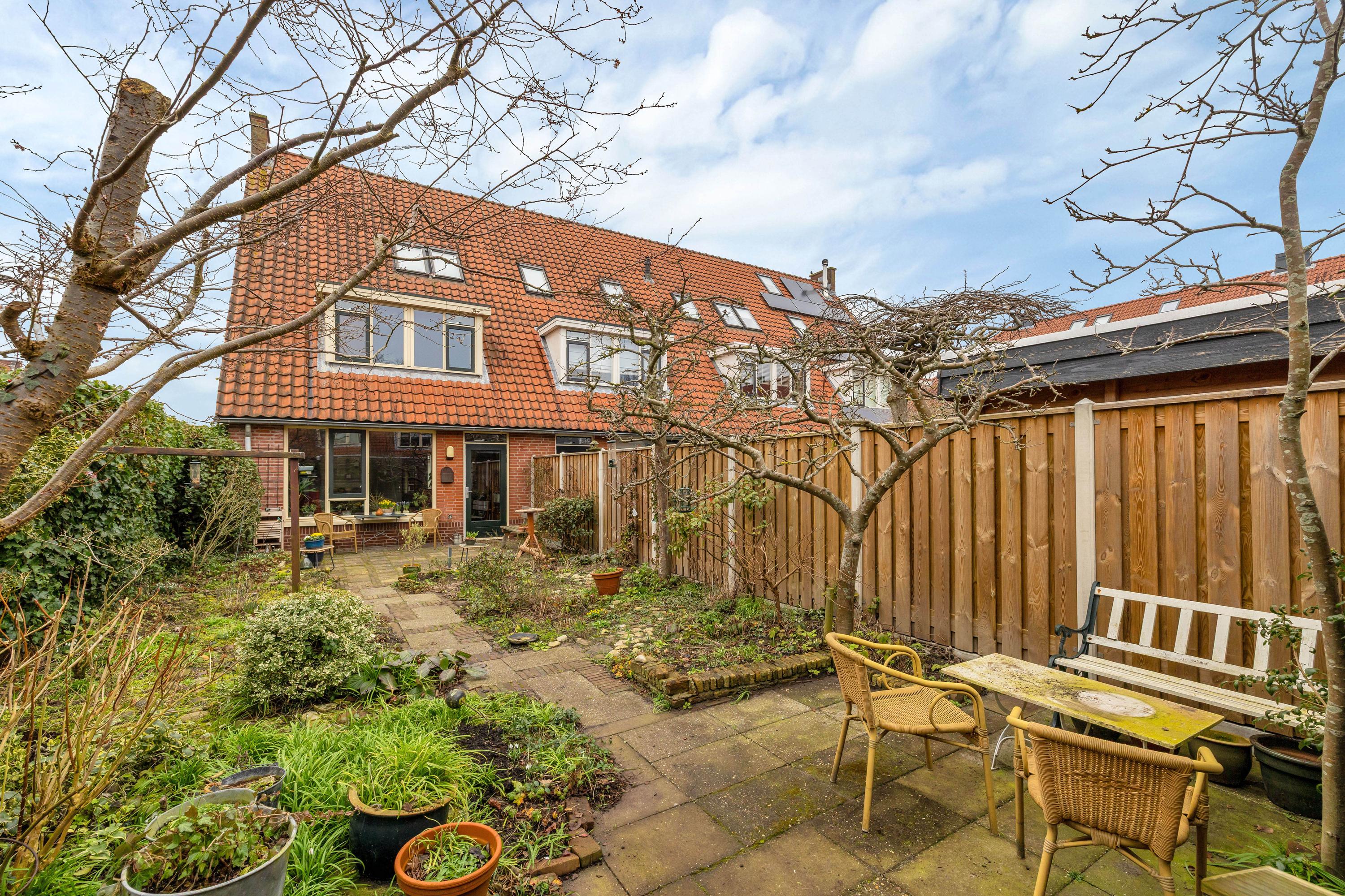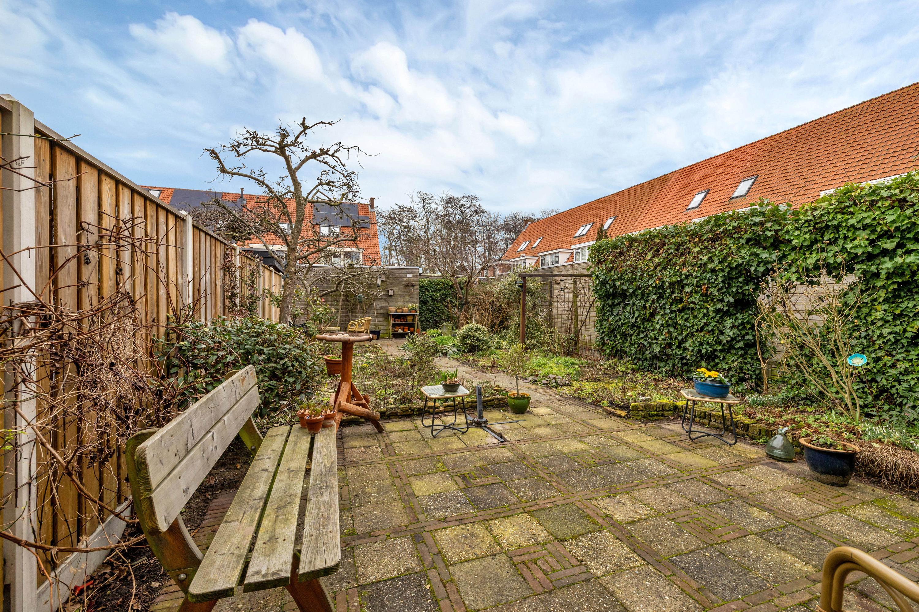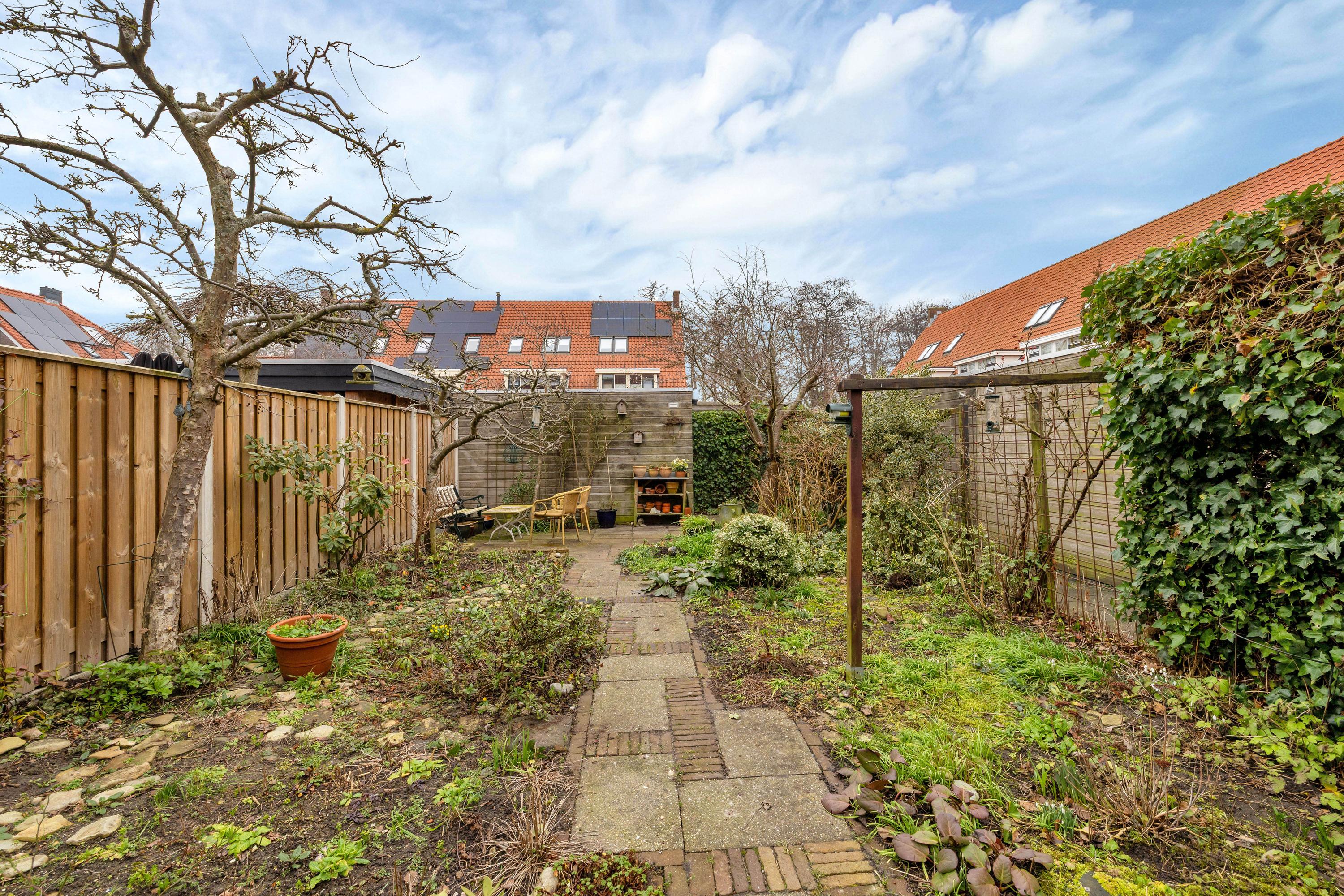 De zeer diepe tuin gelegen op het zuidoosten en beschikt over een terras, border met fruitboom en vrijstaande houten berging. De tuin beschikt over een zijpad en achterom.