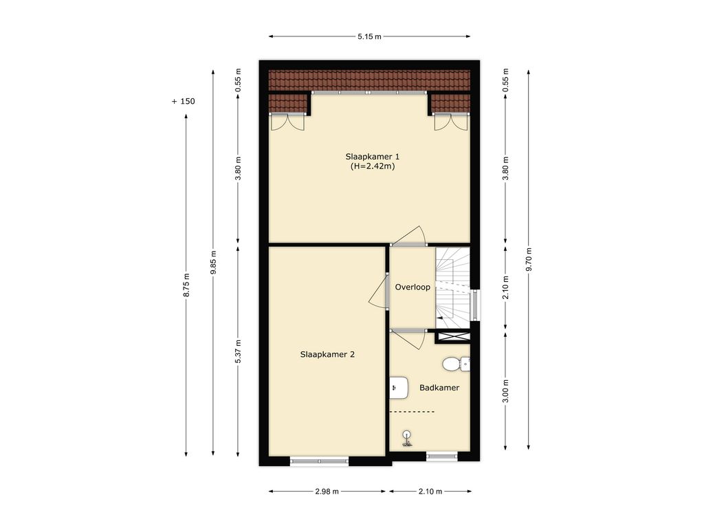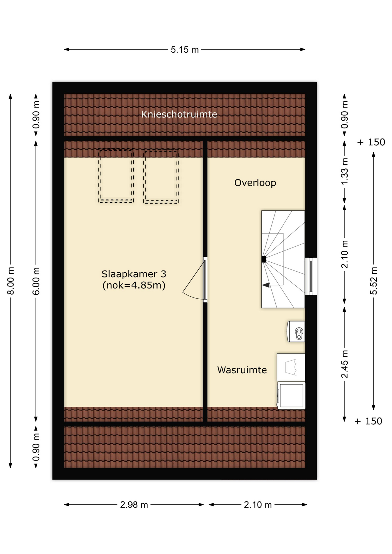 Ruime slaapkamer met aan de achterzijde 2 dakramen. Deze verdieping is voorzien van tapijt.