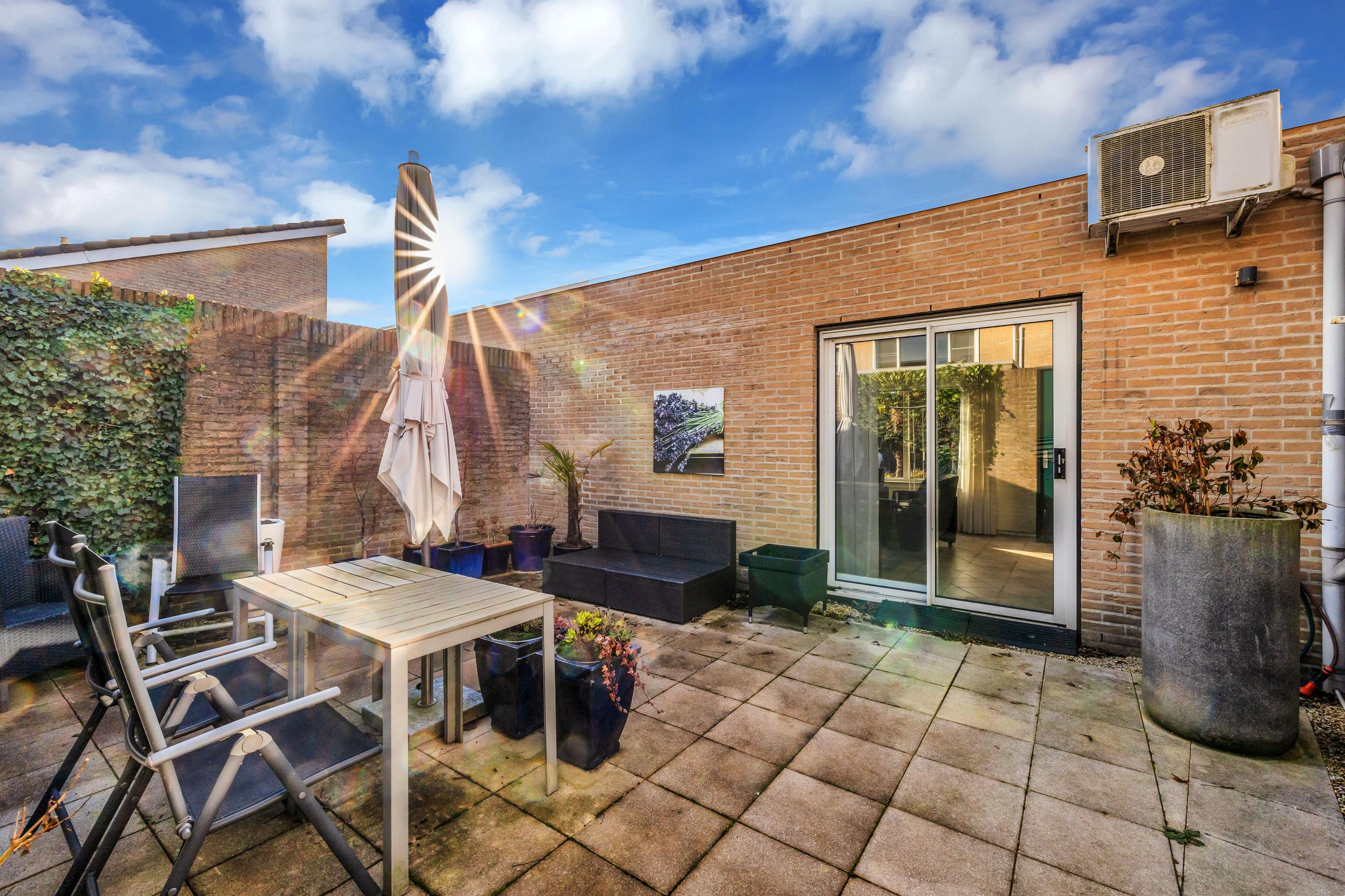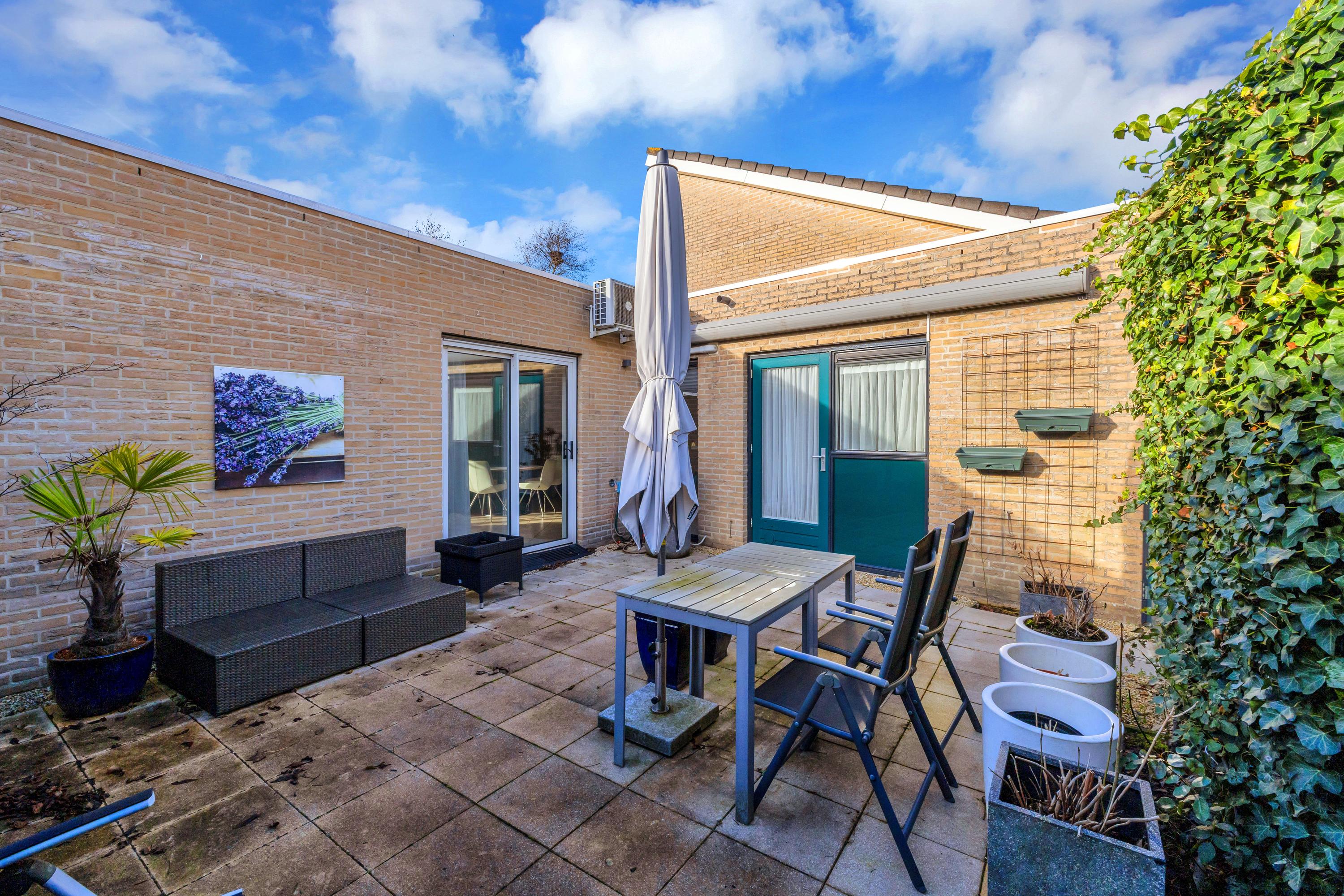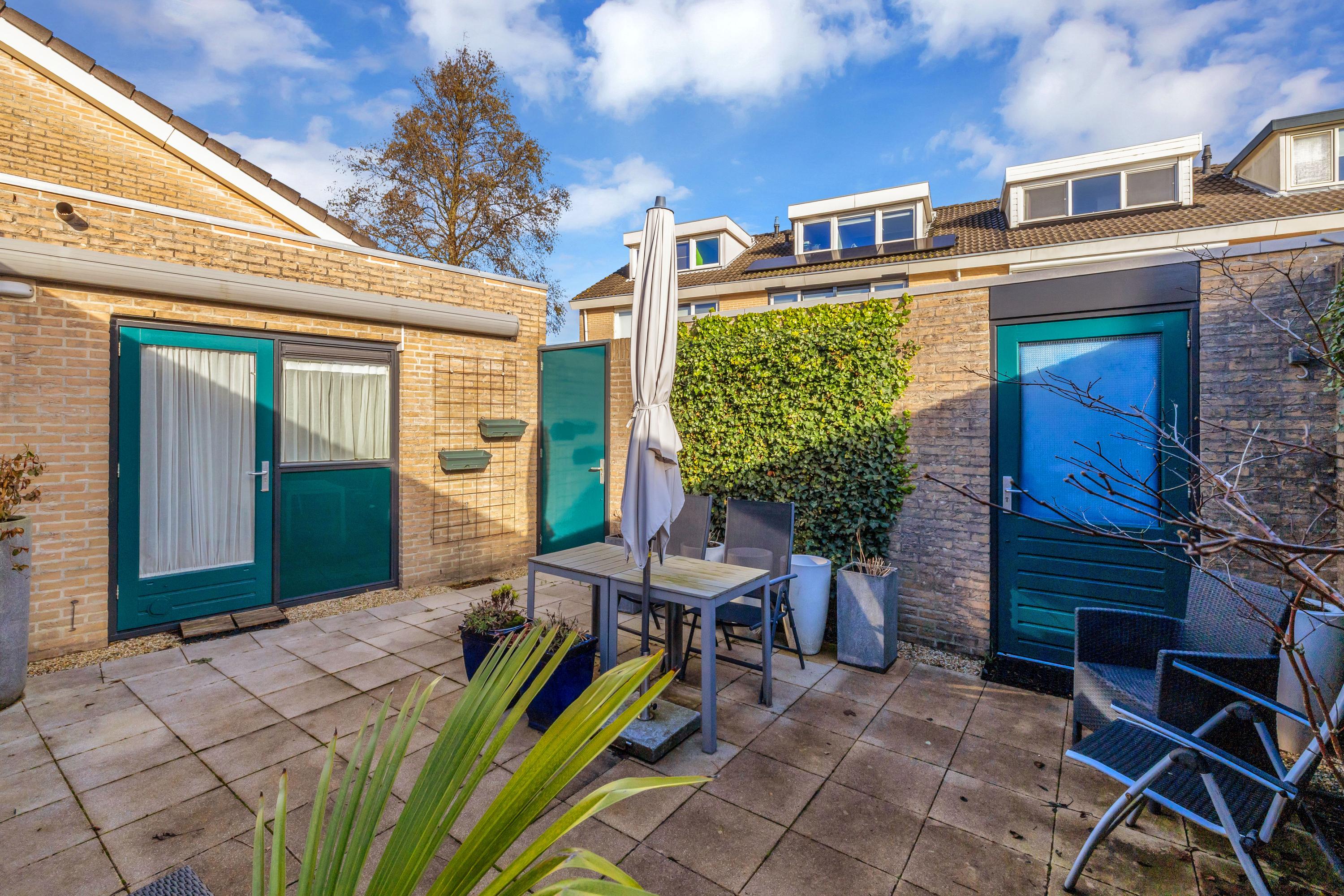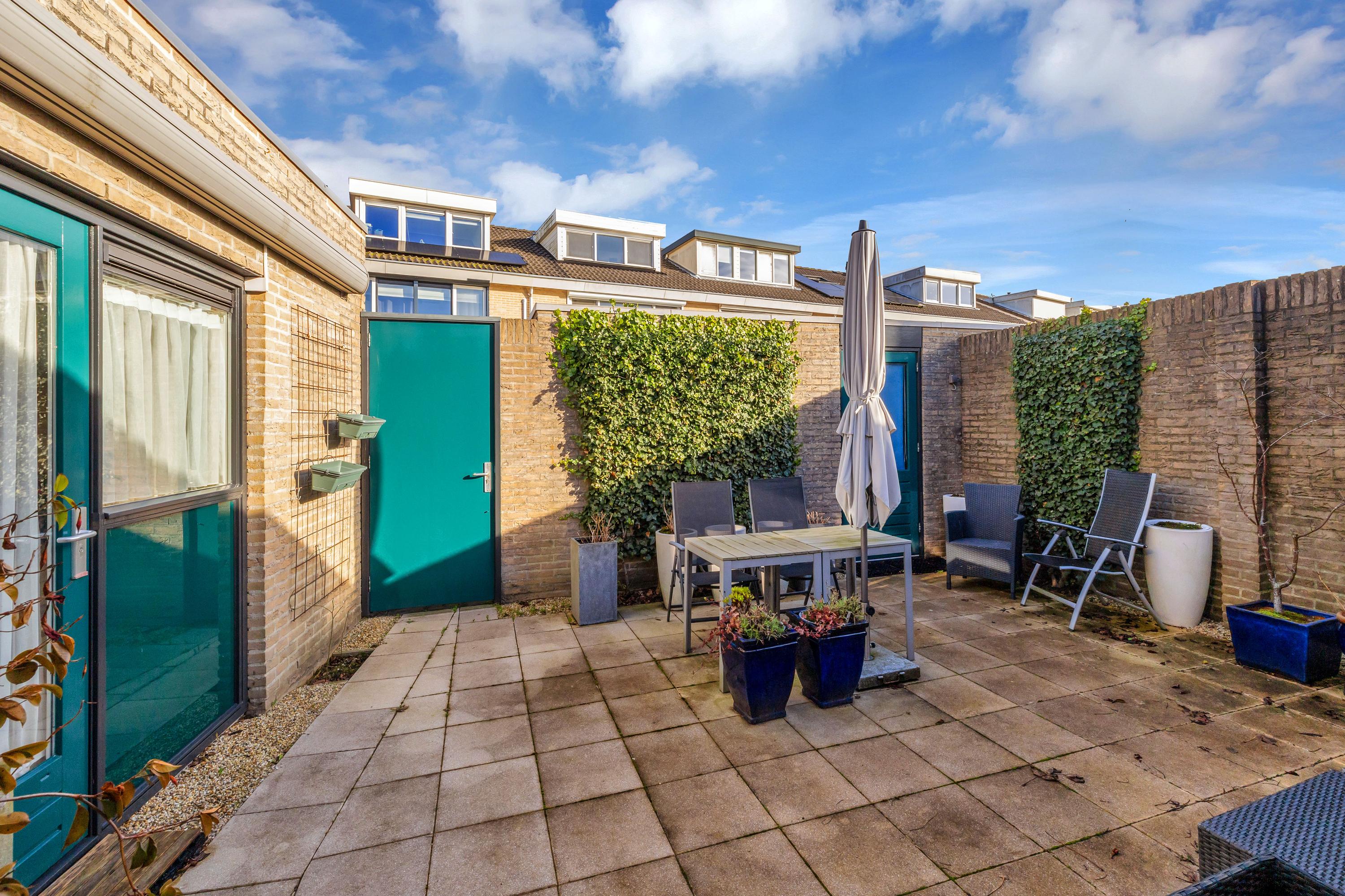 De beschutte achtertuin/ patiotuin met achterom is afgewerkt met sierbestrating en beschikt over een stenen berging. Aan de gevel van de slaapkamer is een groot zonnescherm geplaatst. Een heerlijk zonnig terras.