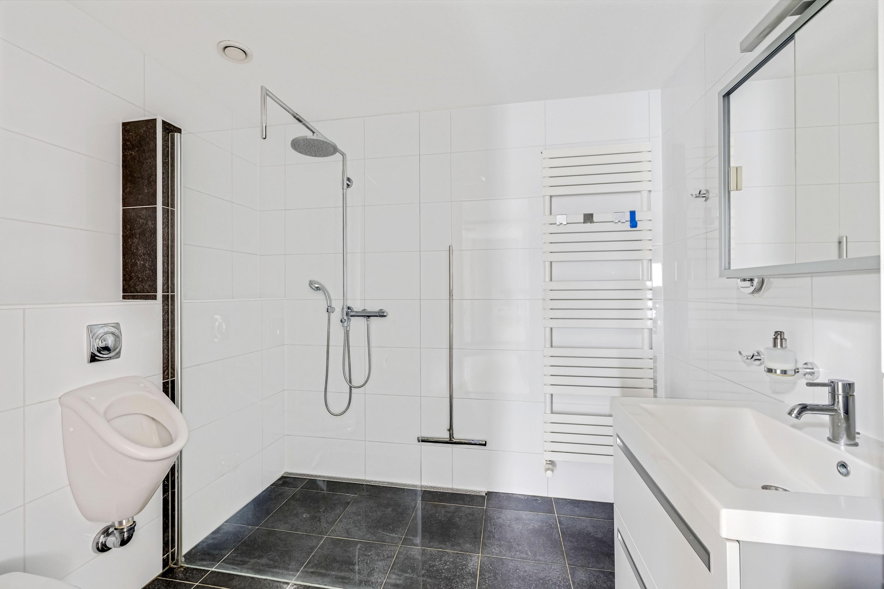 De moderne badkamer is keurig betegeld en voorzien van een inloopdouche met regendouche, wastafelmeubel, tweede toilet, urinoir, vloerverwarming en designradiator.