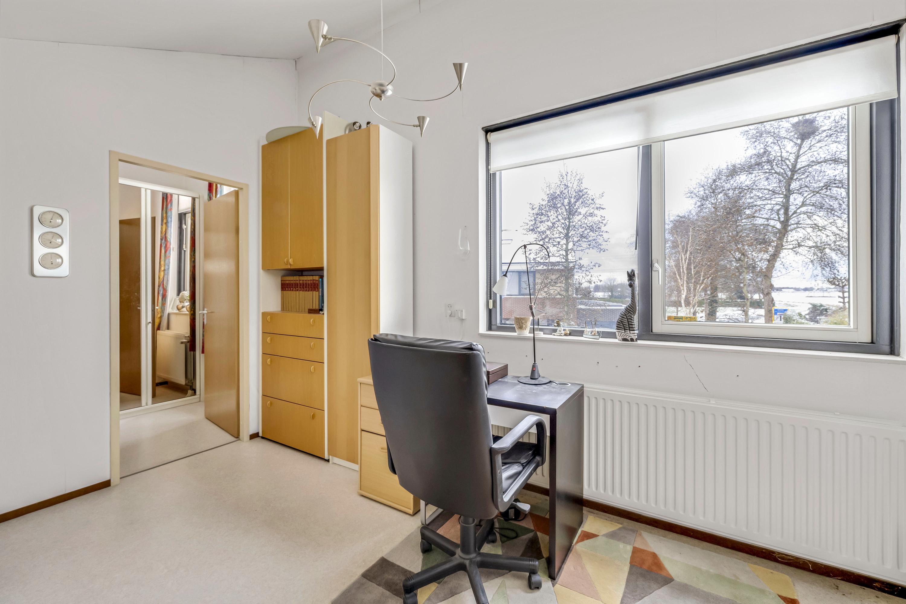 Grote voorzolder. De hobbyruimte met een raam in de voorgevel heeft zicht op de polder. Er is veel bergruimte achter de knieschotten. Deze ruimte kan zeker dienst doen als 3e slaapkamer. In de kast vindt u de opstelplaats van de cv-ketel (Intergas 2013). De vloer in deze kamer is afgewerkt met zeil.