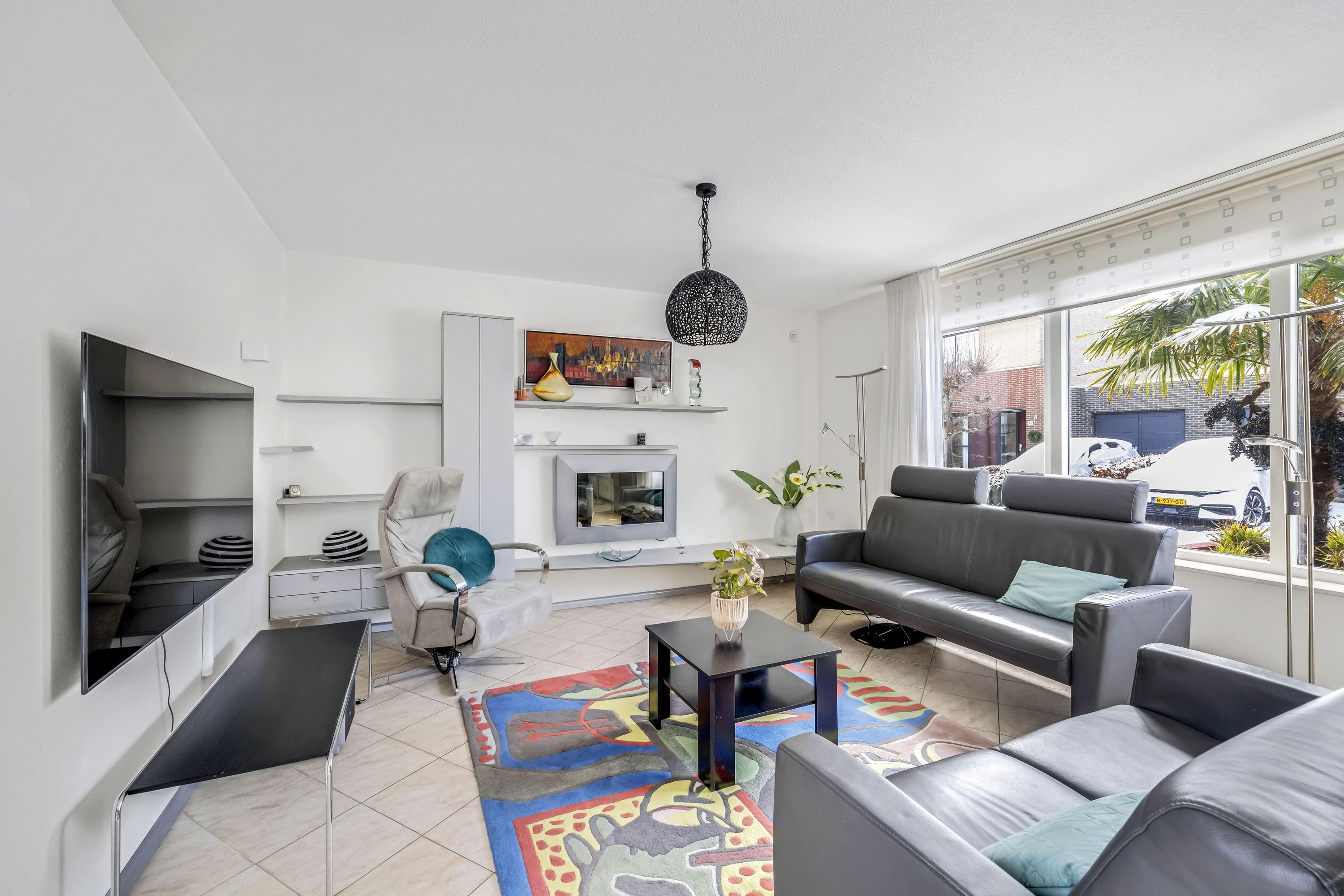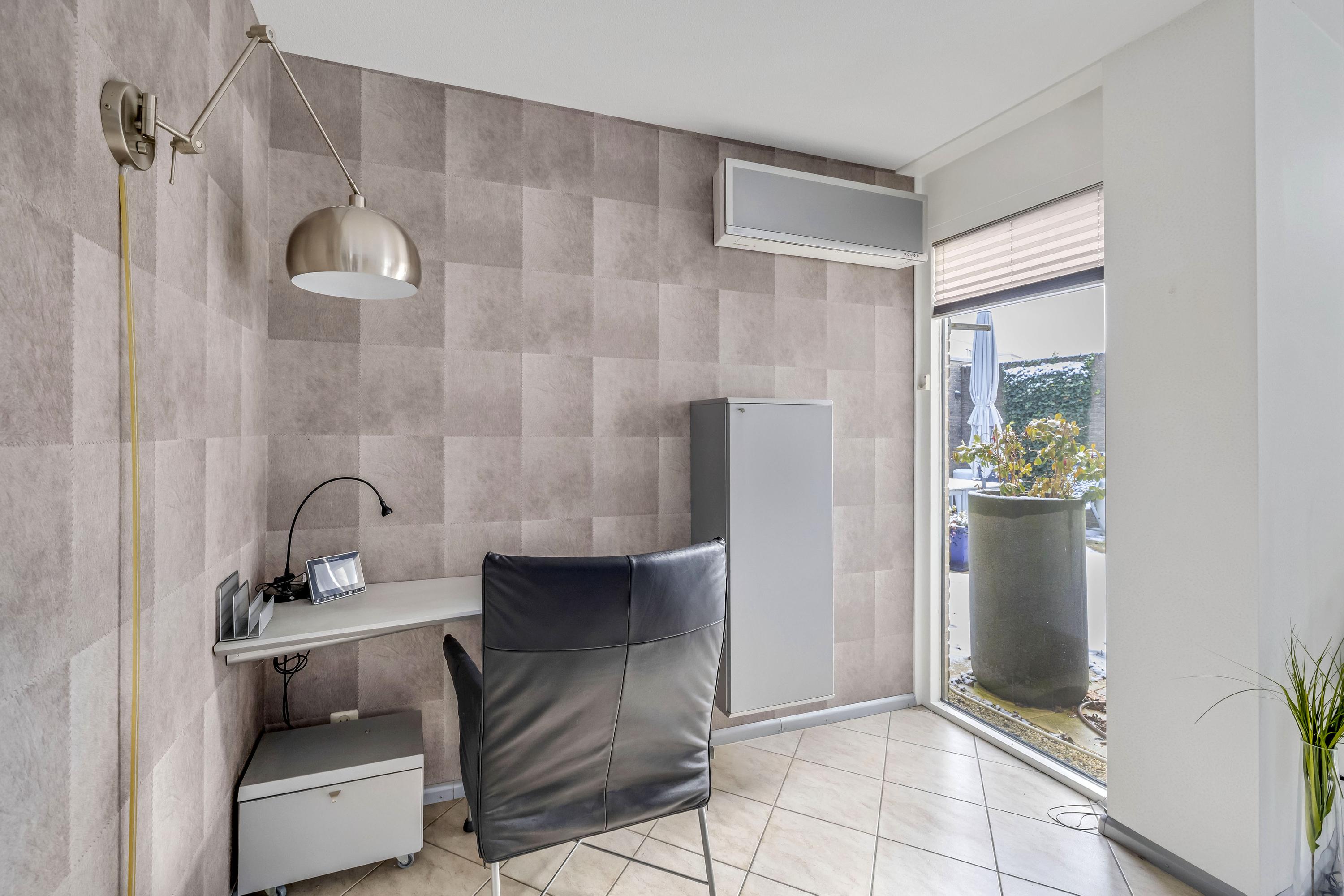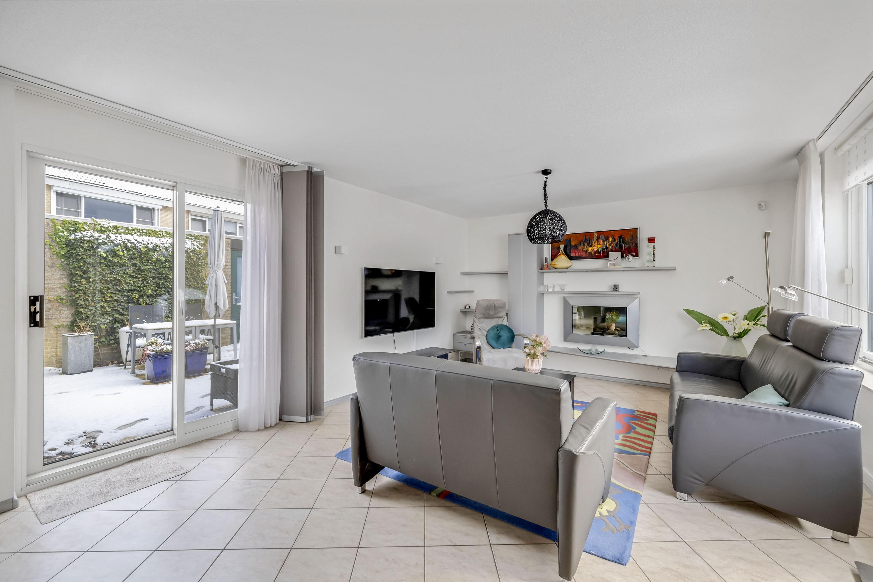 De royale woonkamer is heerlijk licht, mede door de grote raampartij aan de voorzijde van de woning. Middels de schuifpui aan de achterzijde heeft u toegang tot de achtertuin. Door de royale afmeting van de living is er voldoende plaats voor een grote eethoek en een aparte werkplek. Tevens is er een sfeervolle elektrische haard aanwezig en is er airconditioning geplaatst. De vloer beschikt over vloerverwarming.