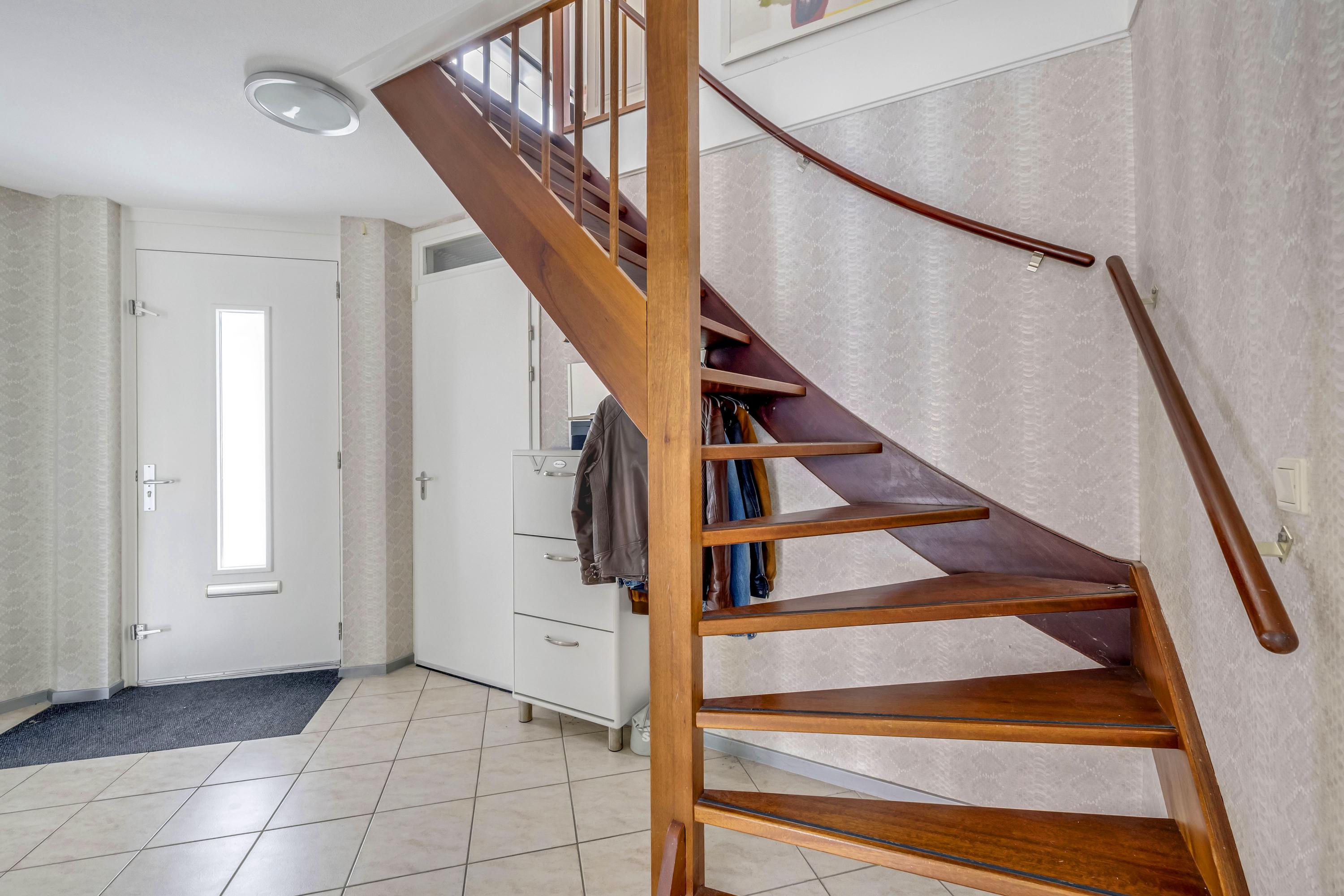 Entree/hal met garderobe, trapopgang en toilet met fonteintje. Via de hal heeft u toegang tot de slaapkamer, badkamer, garage en de woonkamer. Wij nemen u eerst graag mee naar de woonkamer.