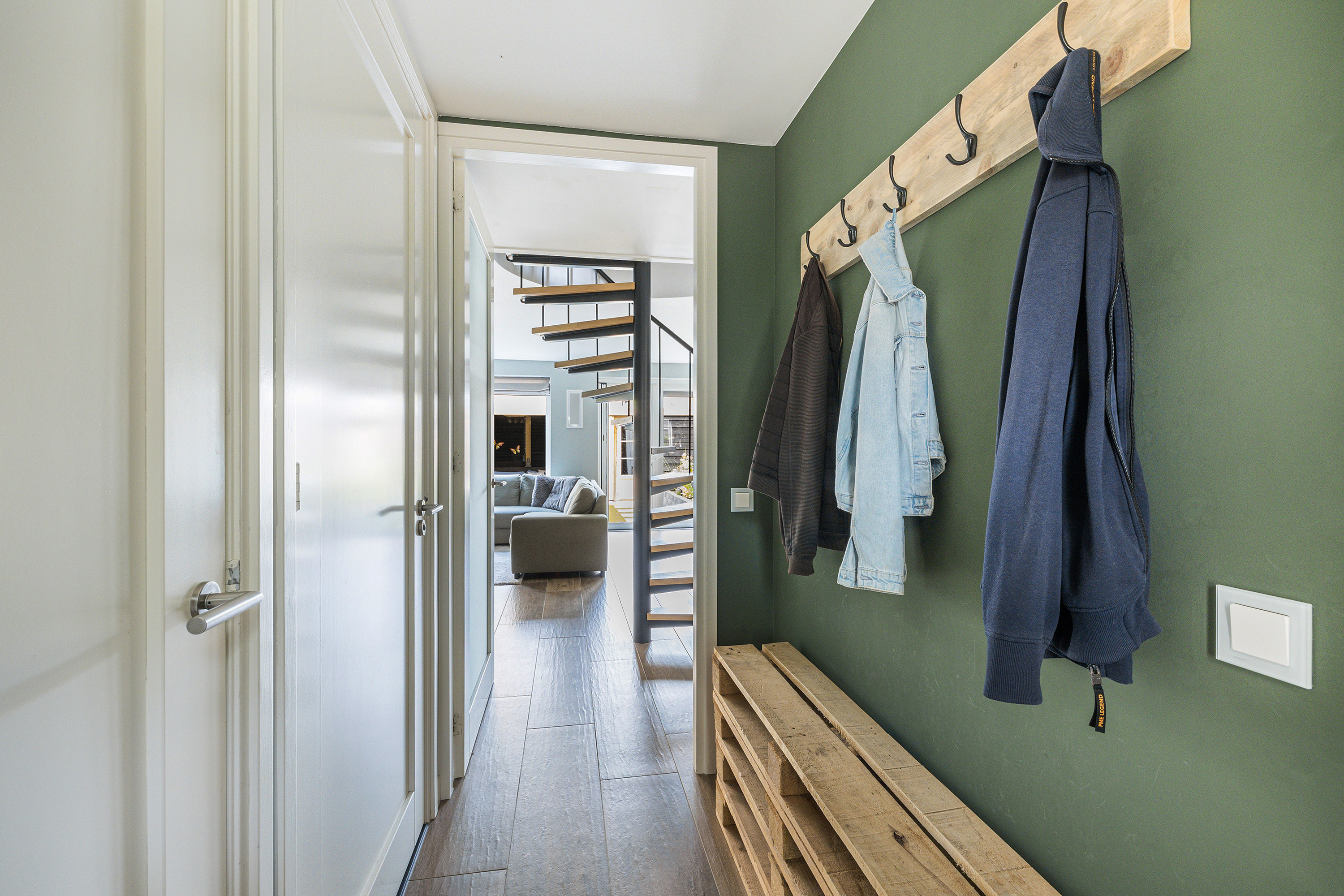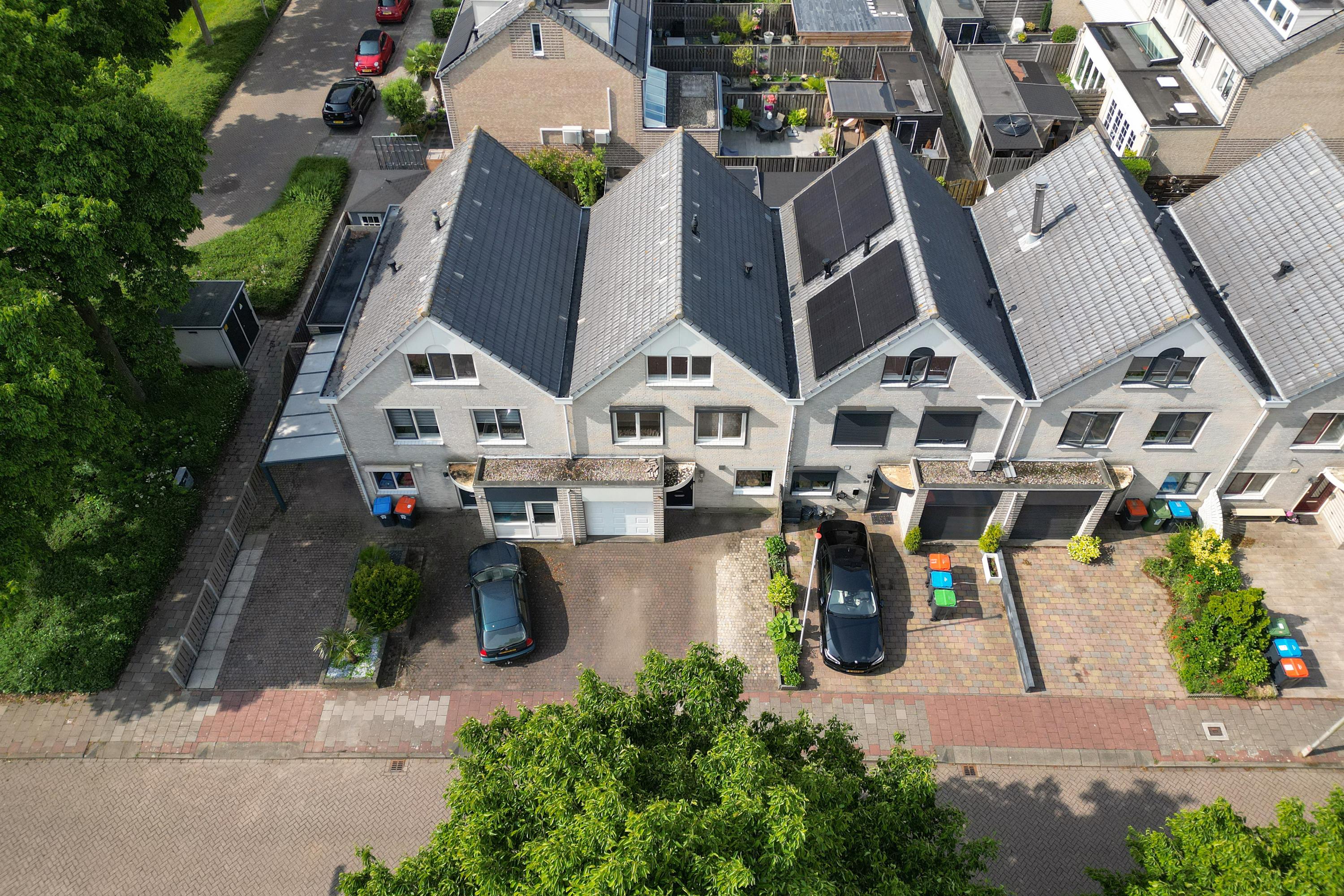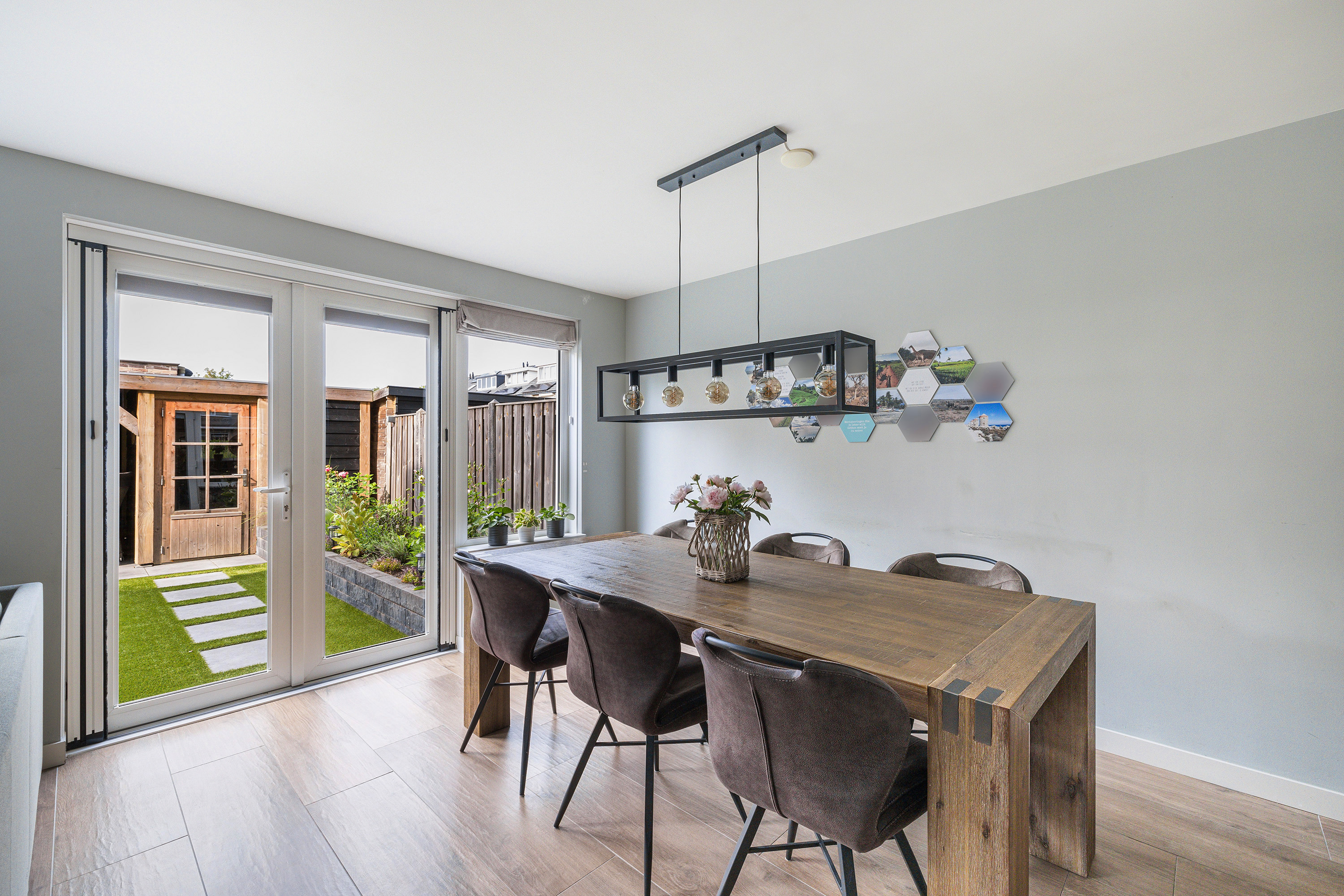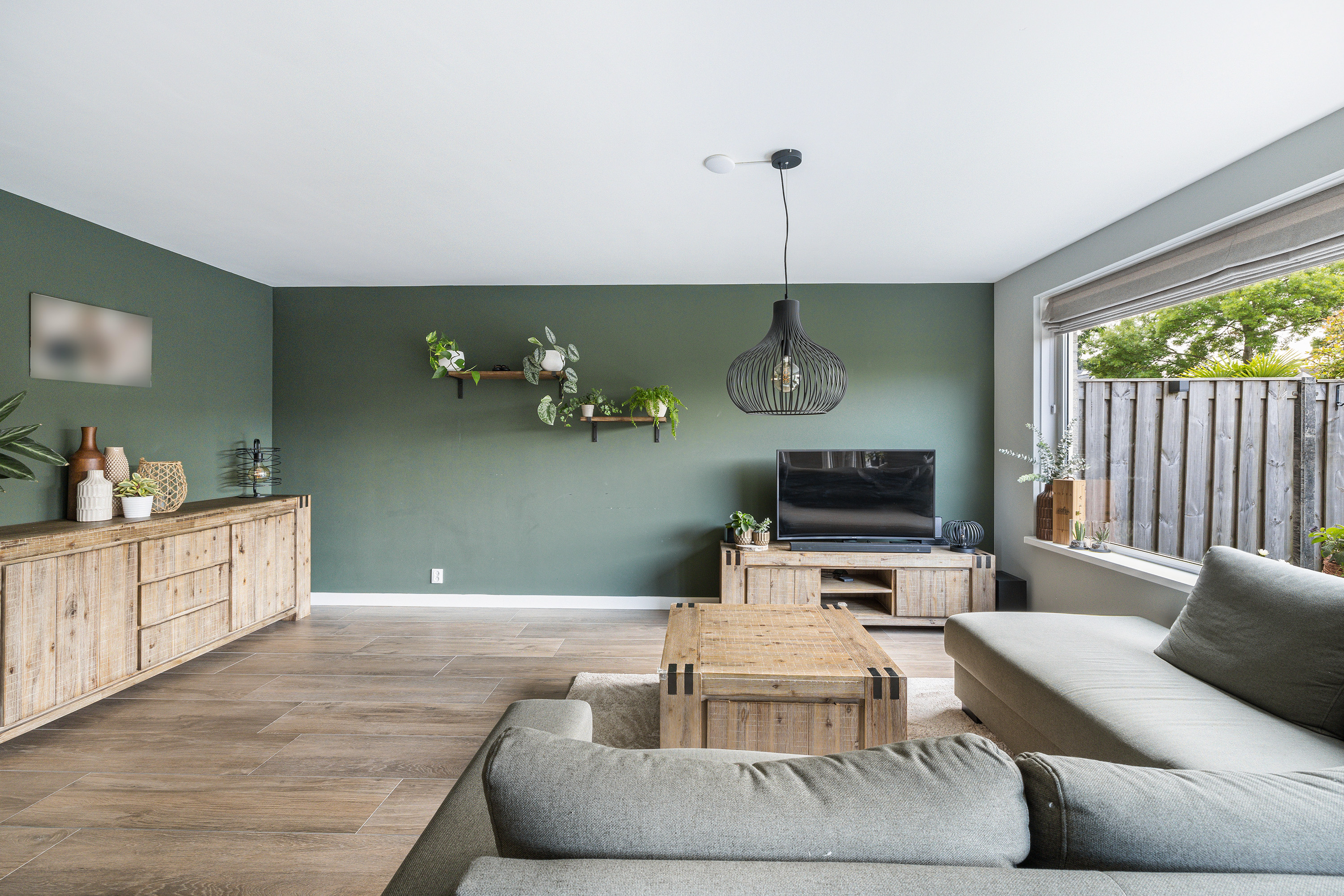 De inpandige garage is deels bij de woonkamer getrokken, waardoor binnen extra leefruimte is ontstaan. De garage is voorzien van een elektrische sectionaaldeur en verwarming.