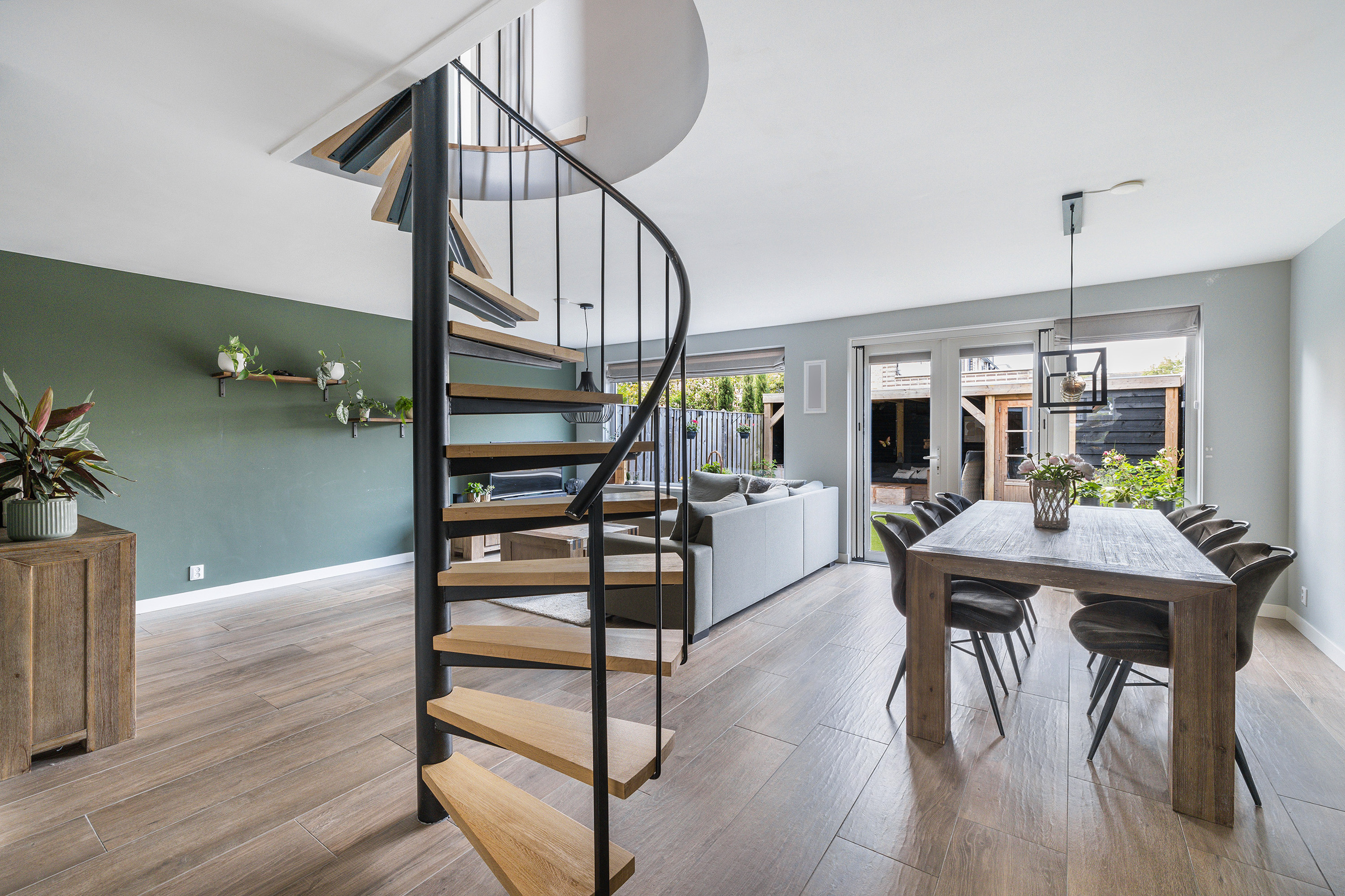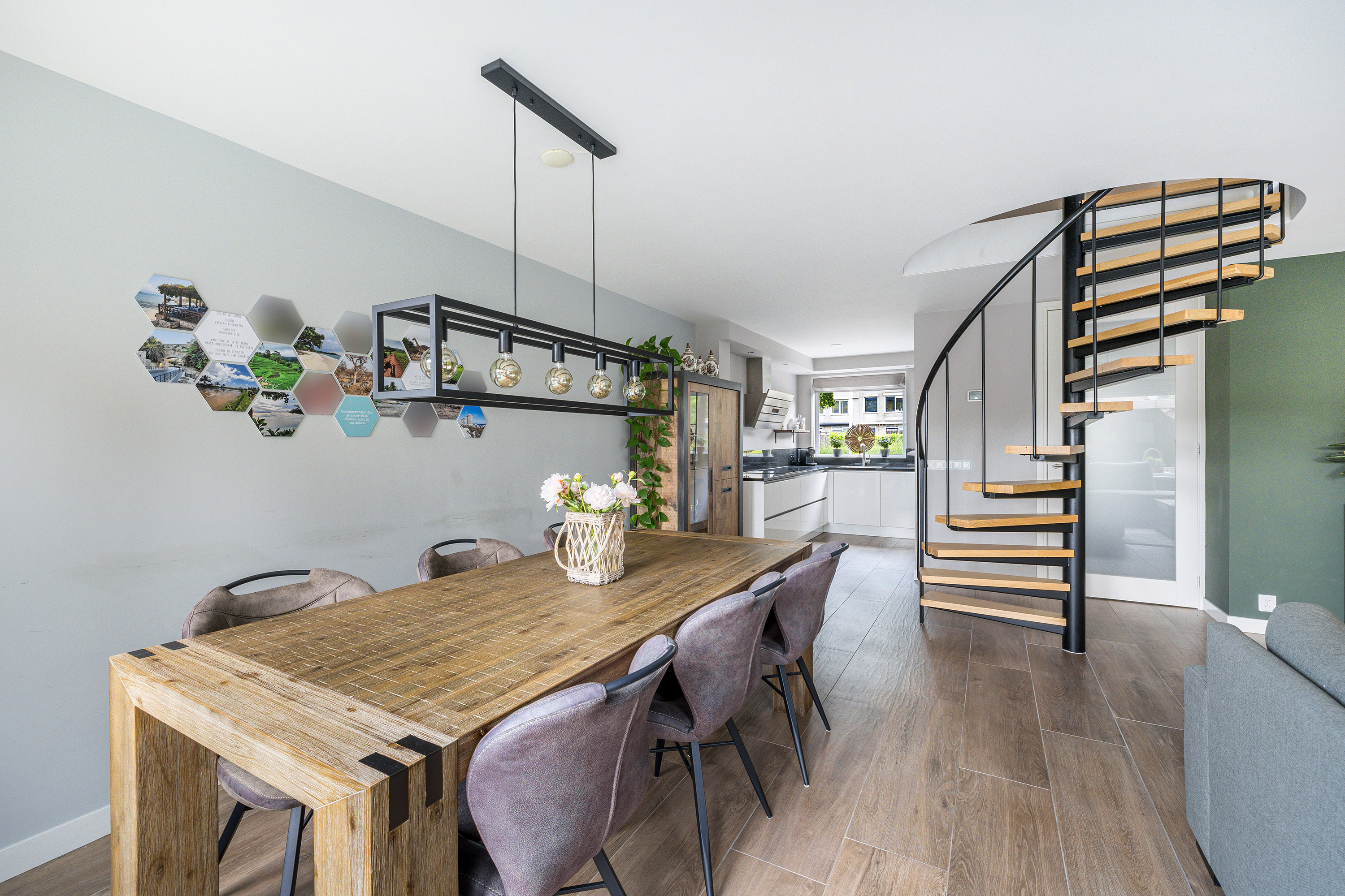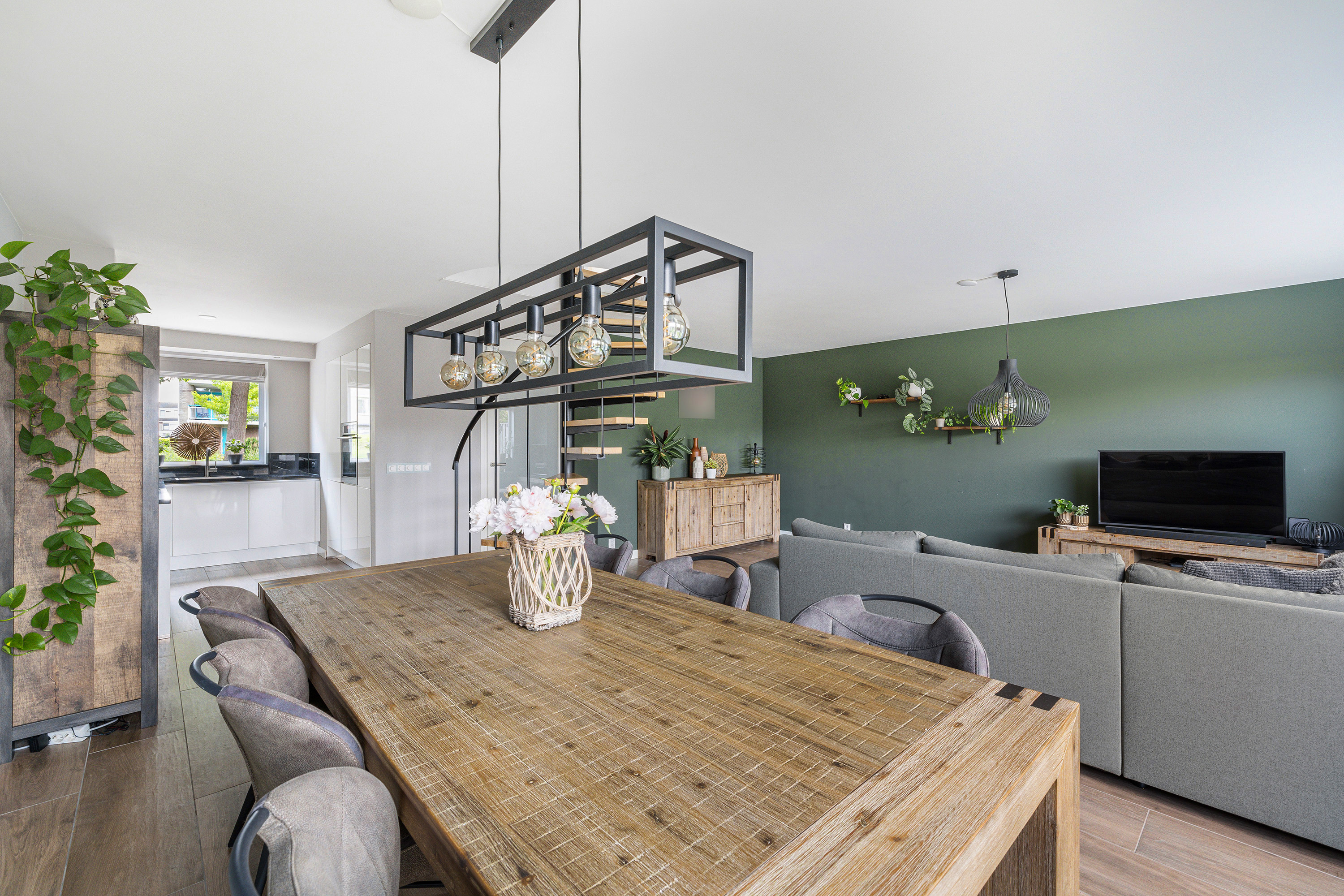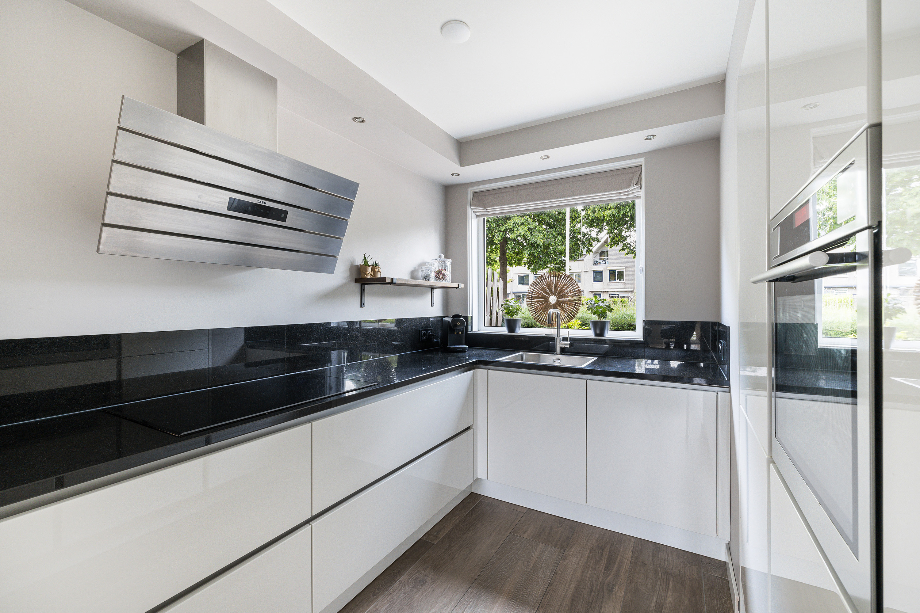 We komen binnen in de hal met meterkast, toegang tot de garage en een modern toilet met hangend closet, fontein, plafondspots en een nette betegeling tot aan het plafond. De royale woon- en eetkamer is heerlijk licht door de grote raampartijen en heeft openslaande deuren (met voorzethor) naar de zonnige achtertuin. De vloer is afgewerkt met een plavuis in houtlook, voorzien van vloerverwarming en de wanden zijn strak gestuct. De spiltrap naar de verdieping geeft de ruimte extra karakter. De moderne open keuken staat in een L-opstelling met daarnaast ook nog een praktische ingebouwde wandkast. De keuken is compleet uitgerust met een inductiekookplaat, wandschouw afzuigkap, koel-/vriescombinatie, oven en een vaatwasser. Onder het granieten aanrechtblad is sier led verlichting aangebracht.