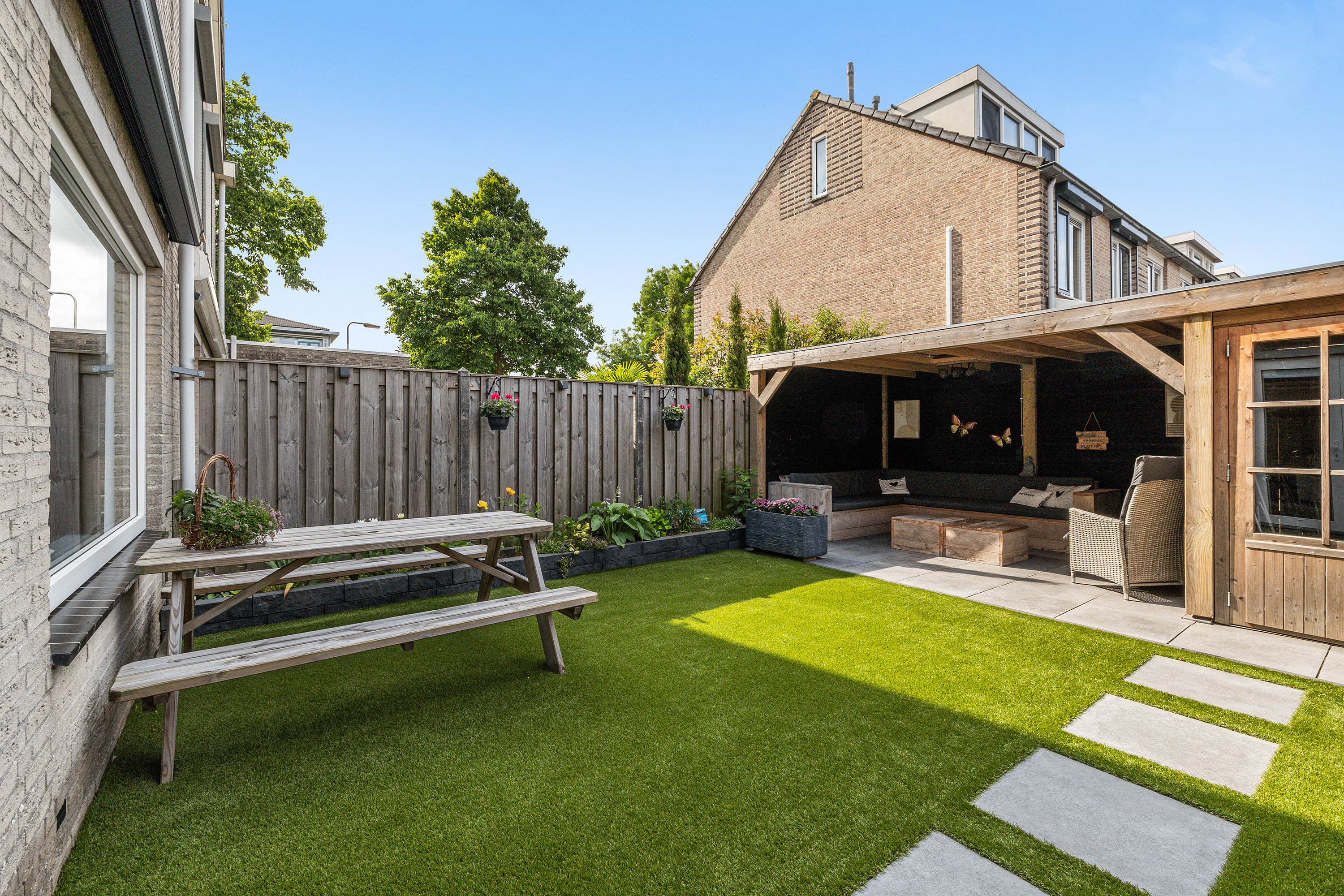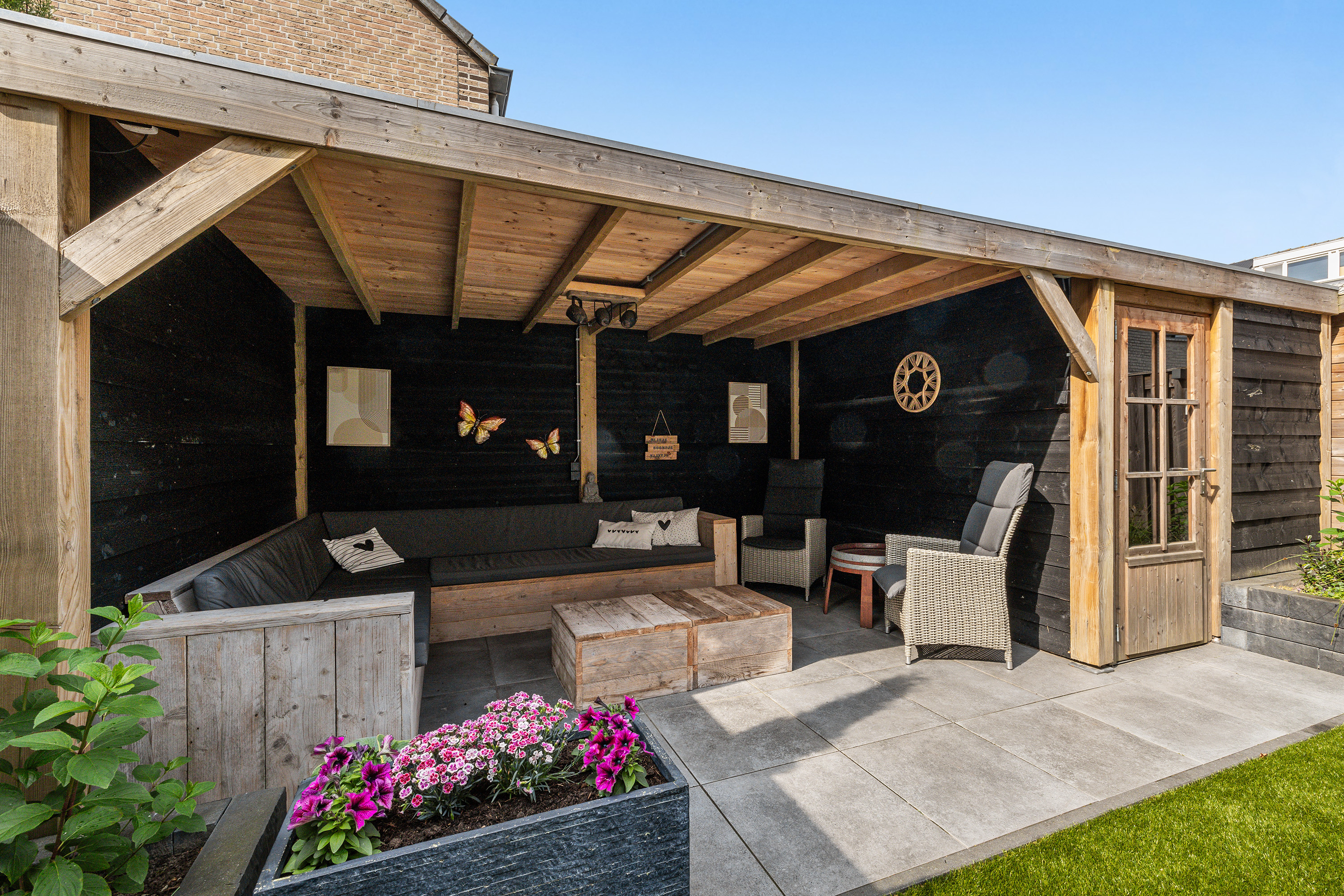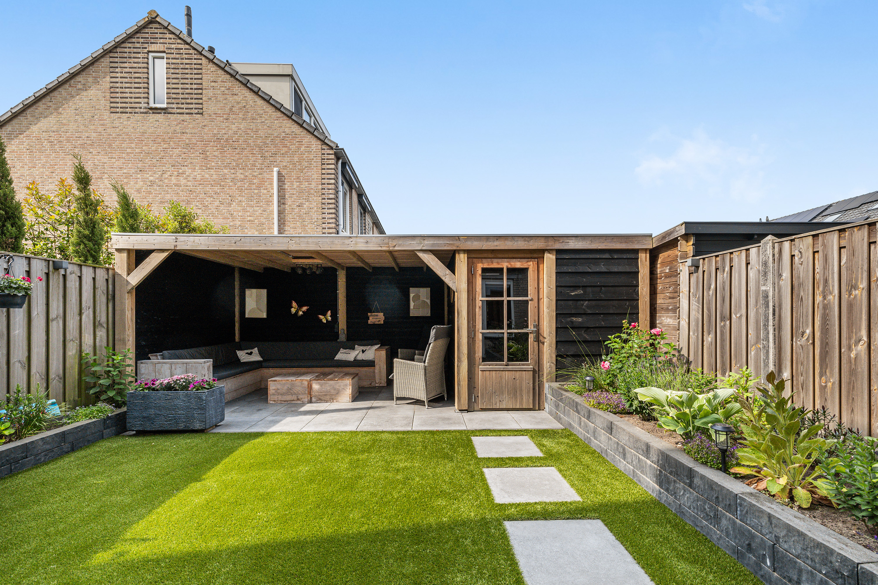 In de voortuin een oprit met ruimte is voor 2 auto’s. De achtertuin is gelegen op het zuidwesten en is verzorgd aangelegd met kunstgras, plantenborders en houten schuttingen. De sfeervolle overkapping uit 2021 met berging (voorzien van een deur naar het achterpad) maakt het plaatje compleet. Verder is er nog een zonnescherm (2022) en buitenkraan op de achtergevel aanwezig.