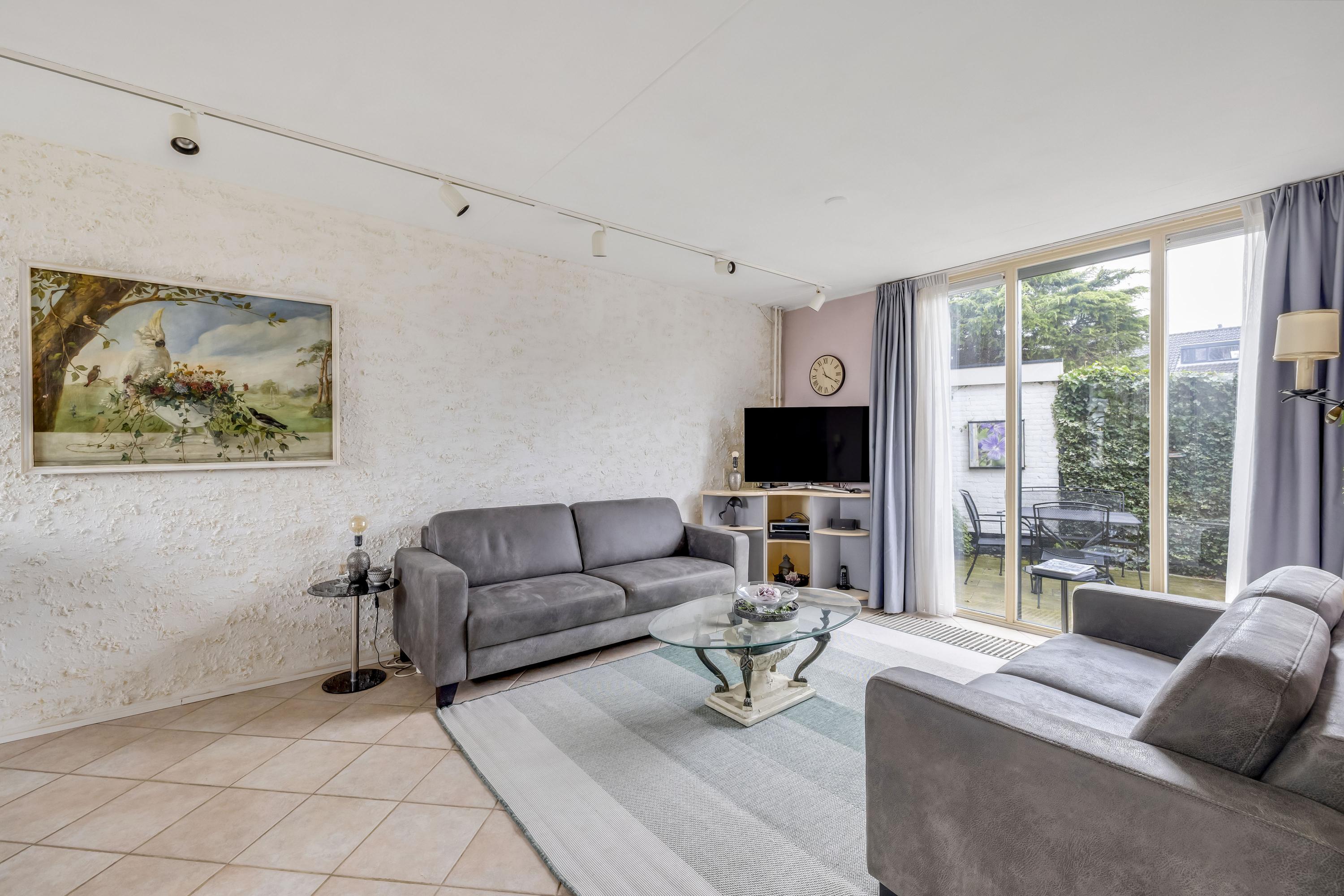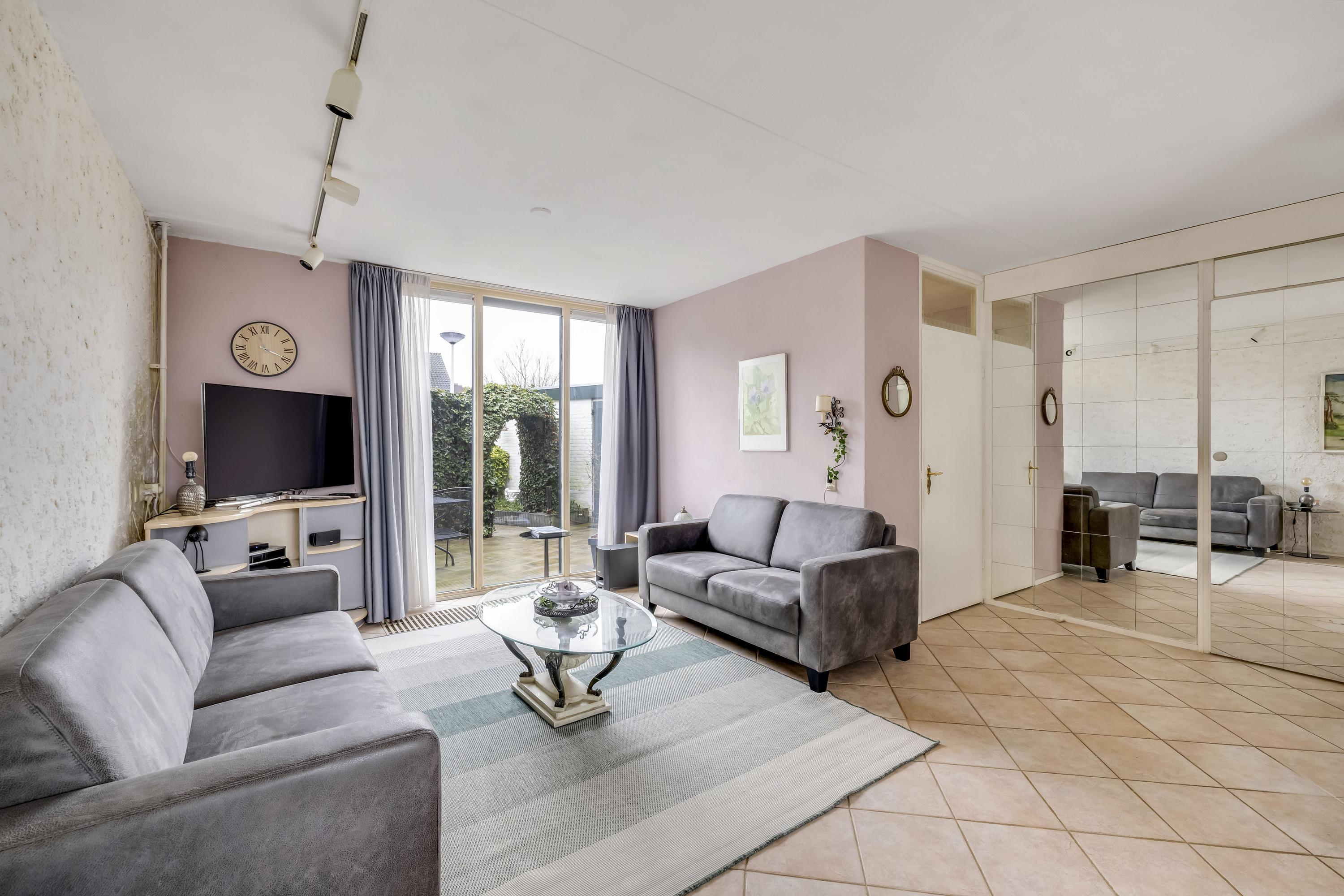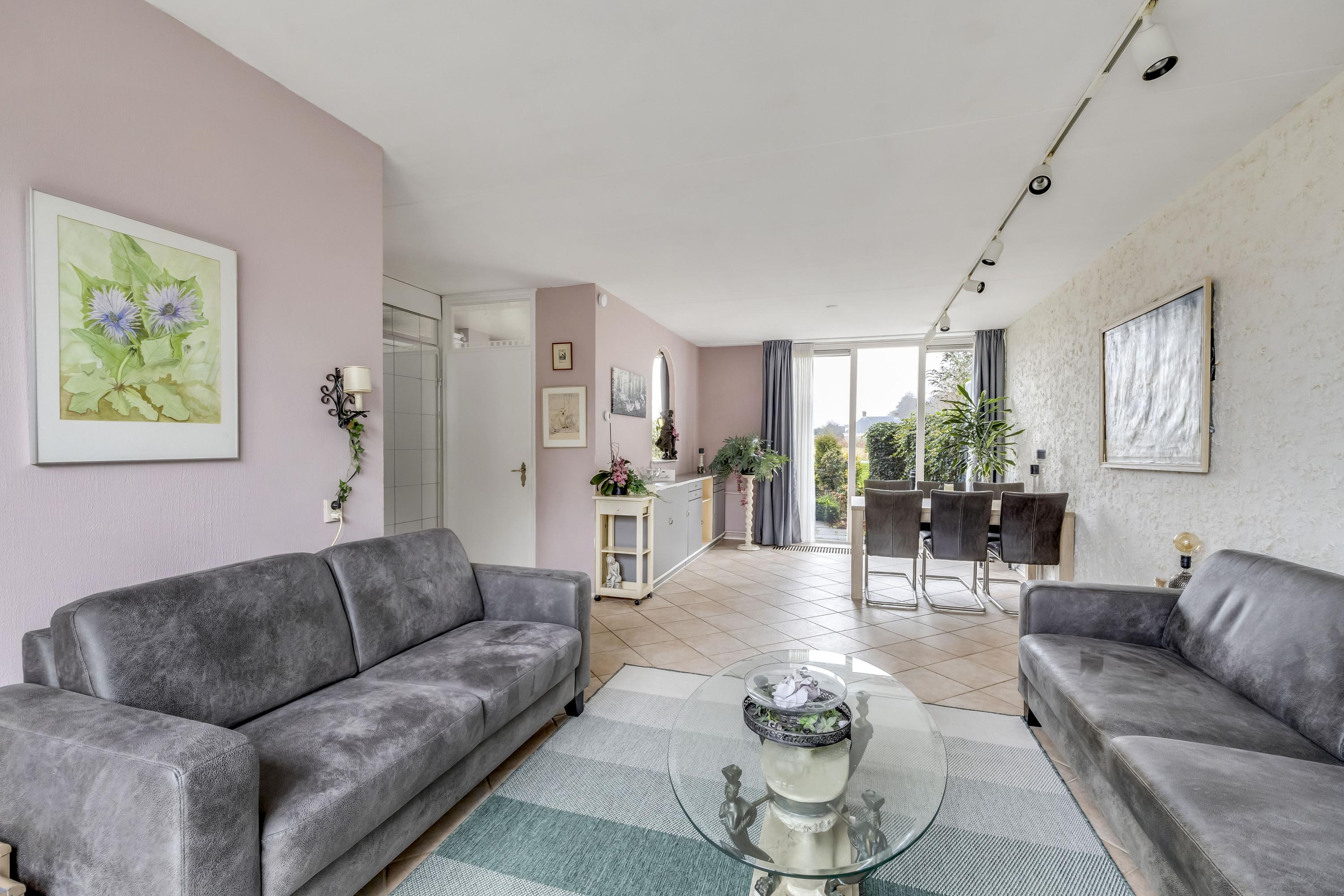 De woonkamer heeft aan zowel de voor- als achterzijde een grote kunststof pui v.v HR++ glas waardoor de woonkamer heerlijk licht is. De vloer is v.v. plavuizen. Aan de voorgevel hangt een screen. Er is een mogelijkheid voor een schuifpui.