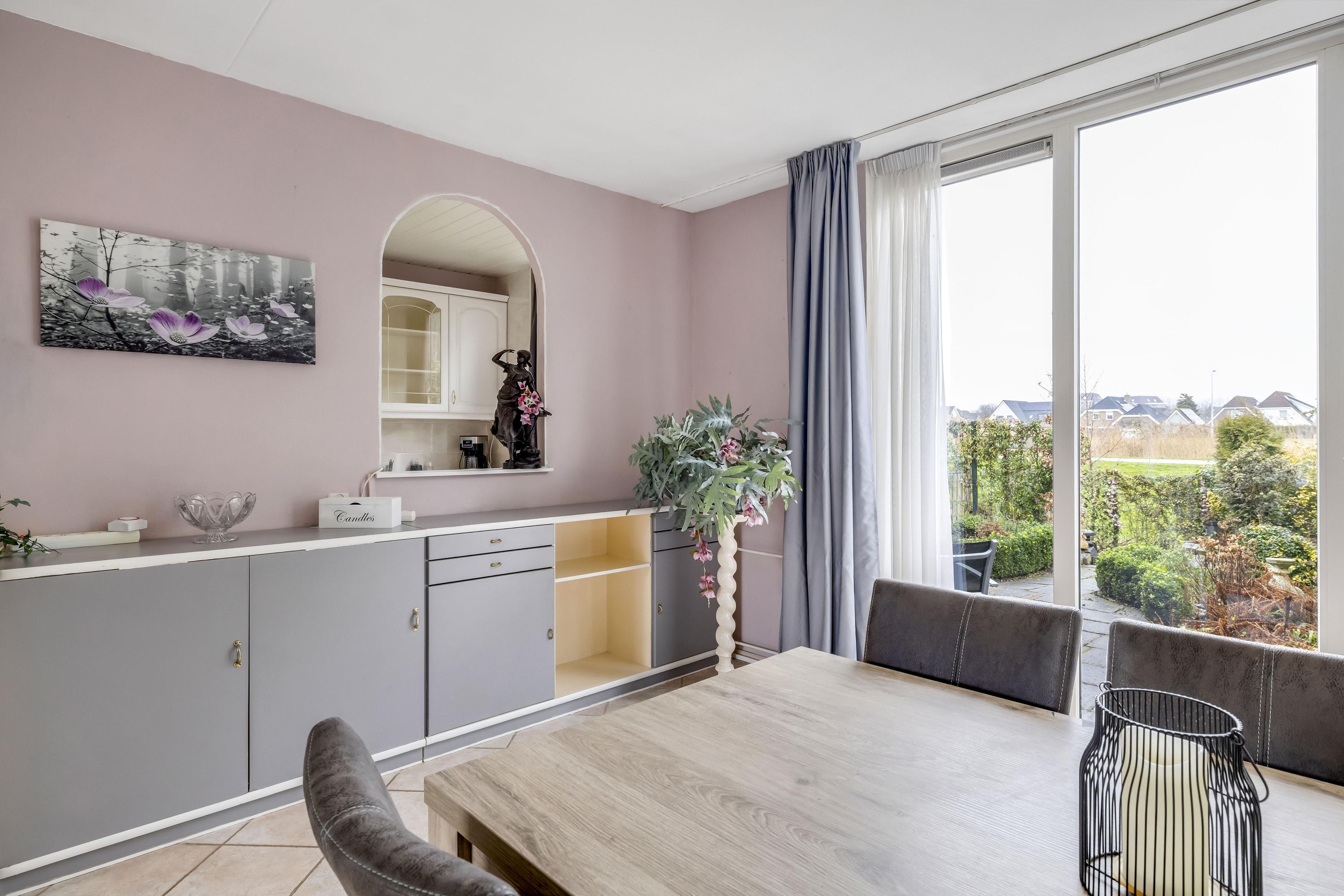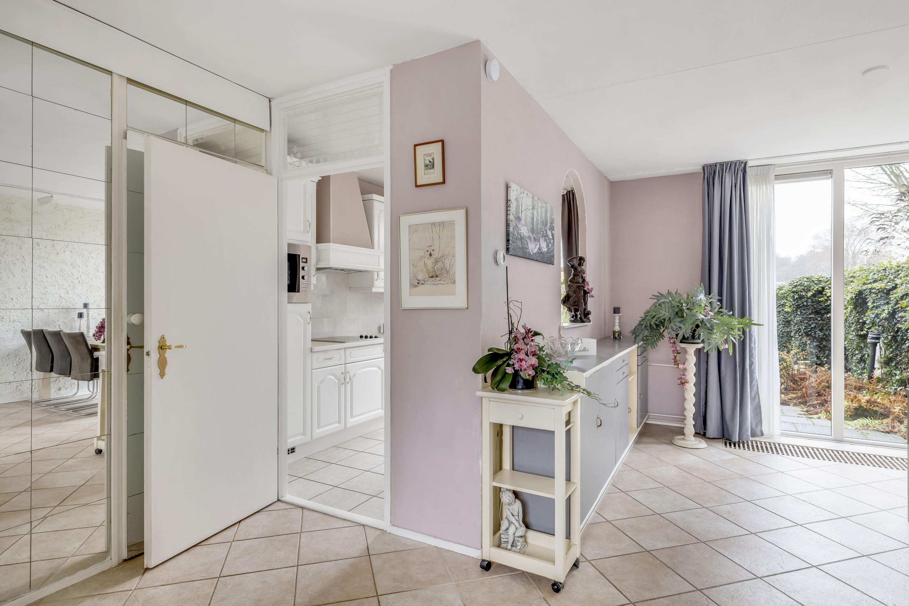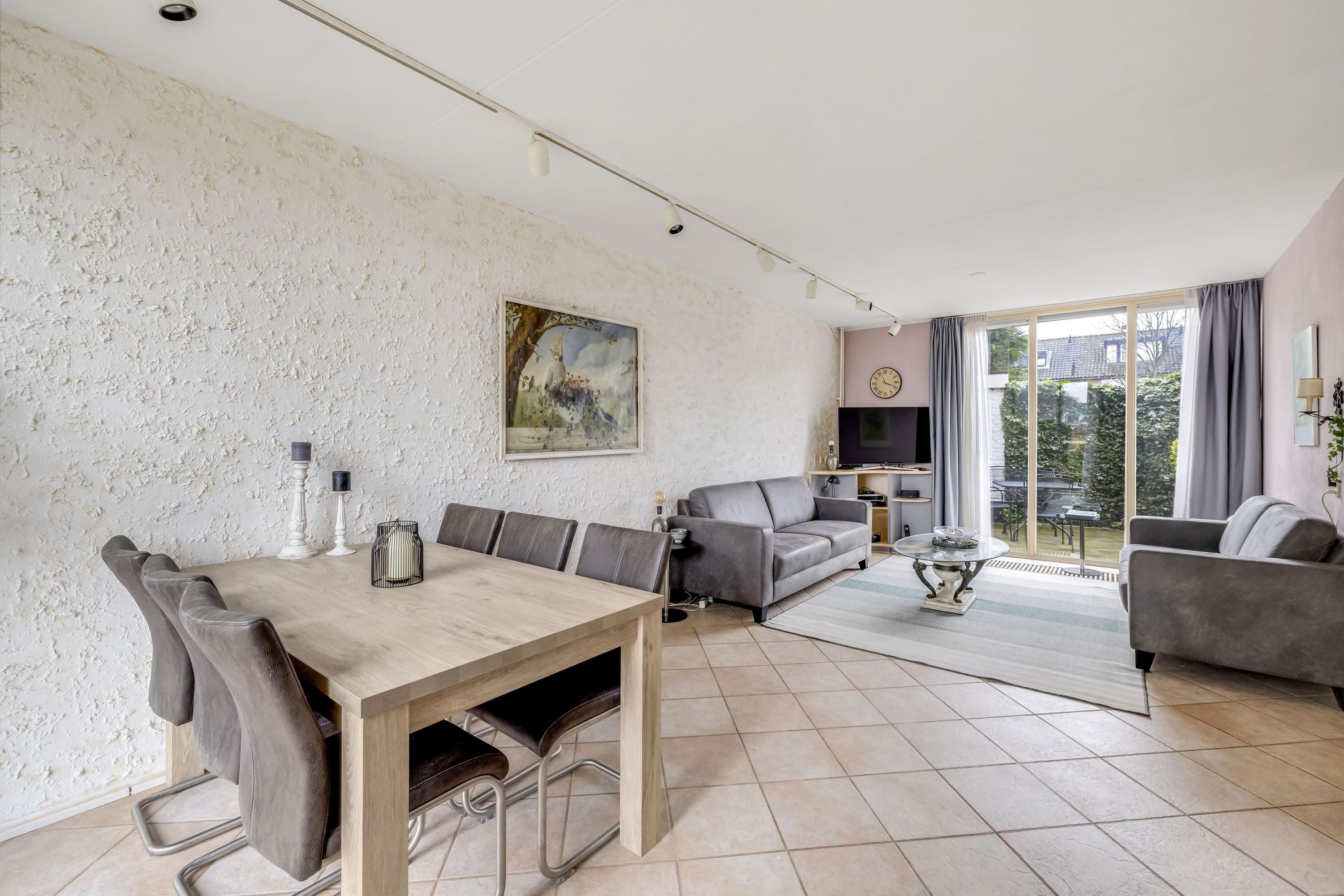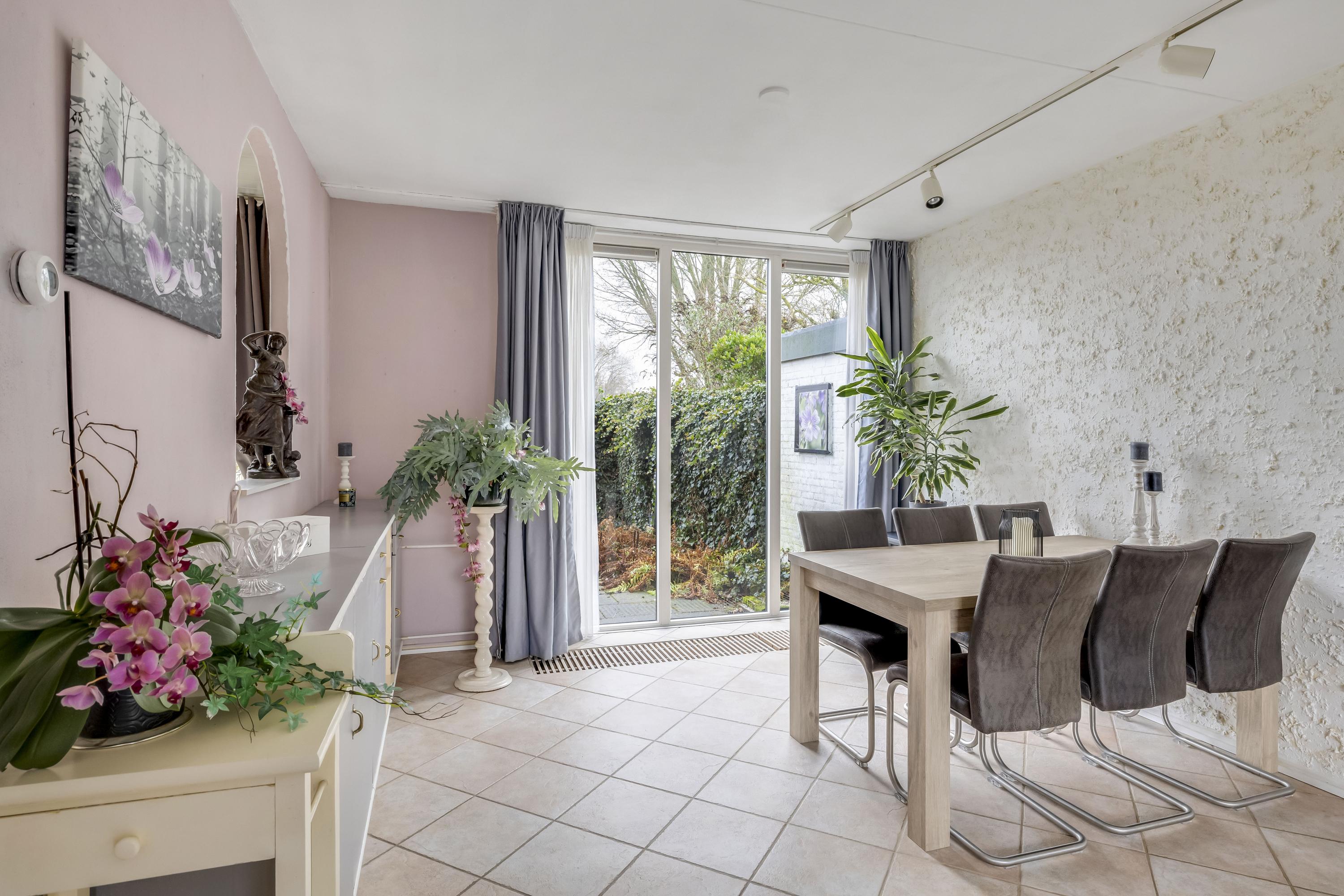 De woonkamer heeft aan zowel de voor- als achterzijde een grote kunststof pui v.v HR++ glas waardoor de woonkamer heerlijk licht is. De vloer is v.v. plavuizen. Aan de voorgevel hangt een screen. Er is een mogelijkheid voor een schuifpui.