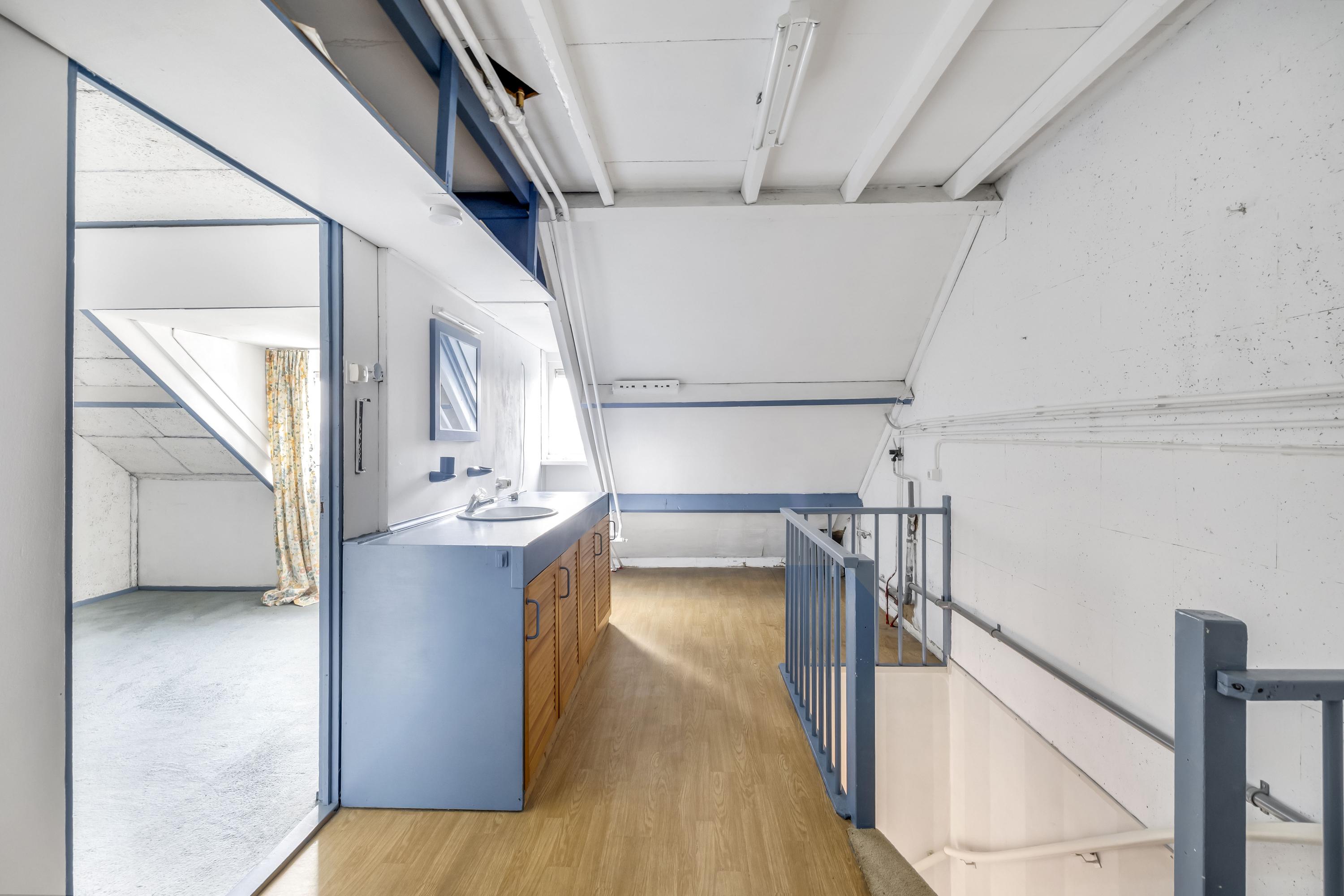 Overloop/ voorzolder met opstelplaats voor de wasmachine en de CV ketel (Remeha). De ruimte is v.v. een werkblad met kasten en spoelunit. De vloer is v.v. zeil.