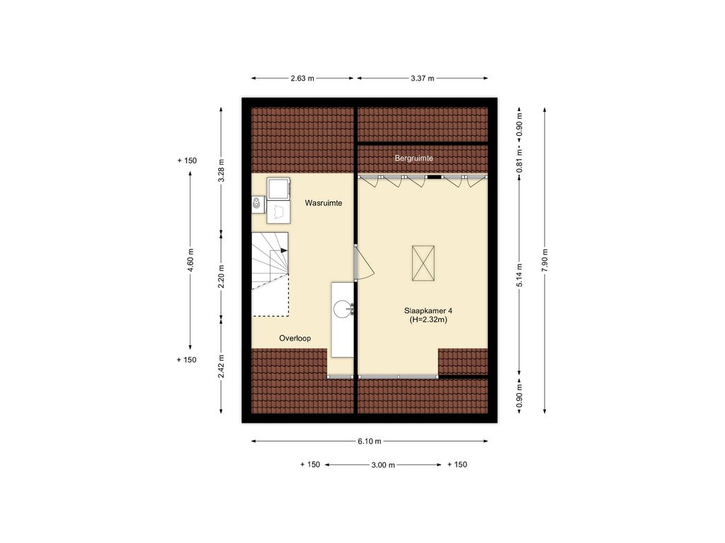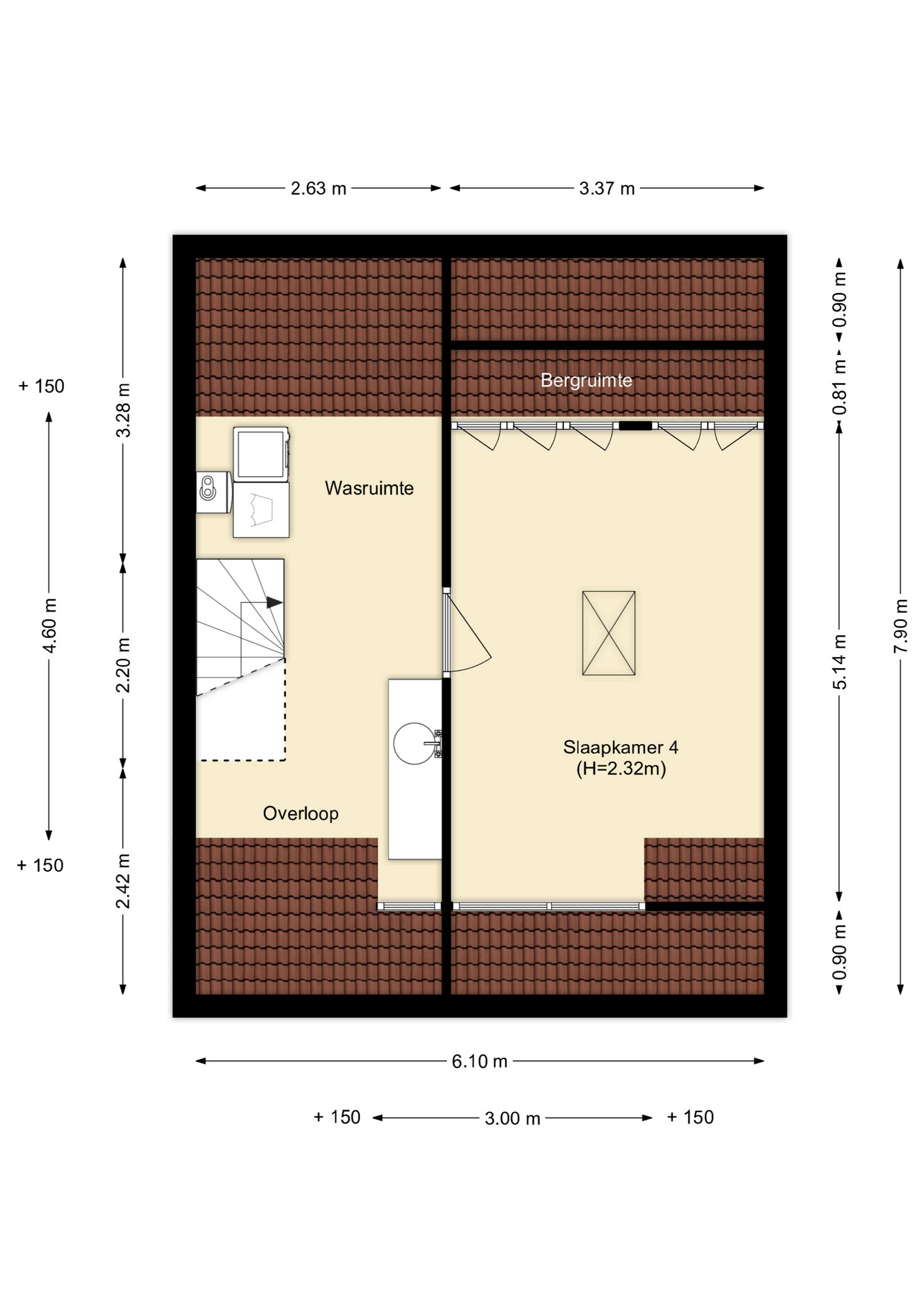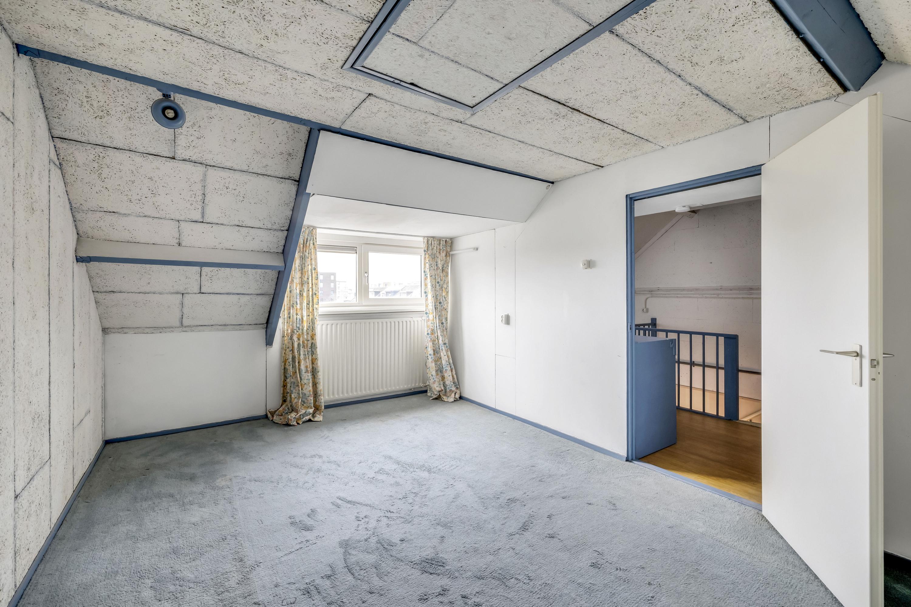 Royale slaapkamer met dakkapel. Achter de knieschotten is voldoende bergruimte. Via het luik is een bergvliering bereikbaar.