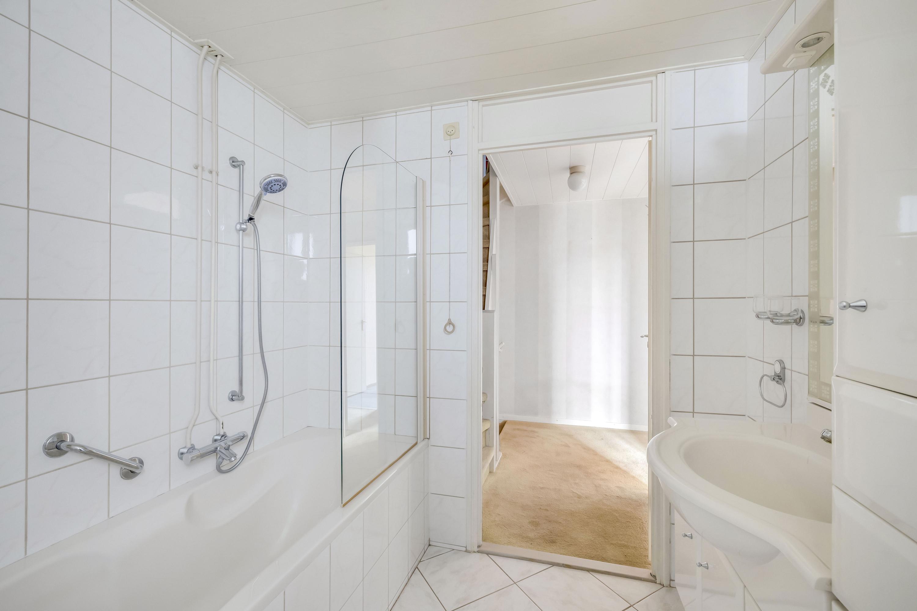 De eenvoudige badkamer aan de voorzijde van de woning beschikt over een ligbad met douche, wastafelmeubel, 2e toilet en designradiator.