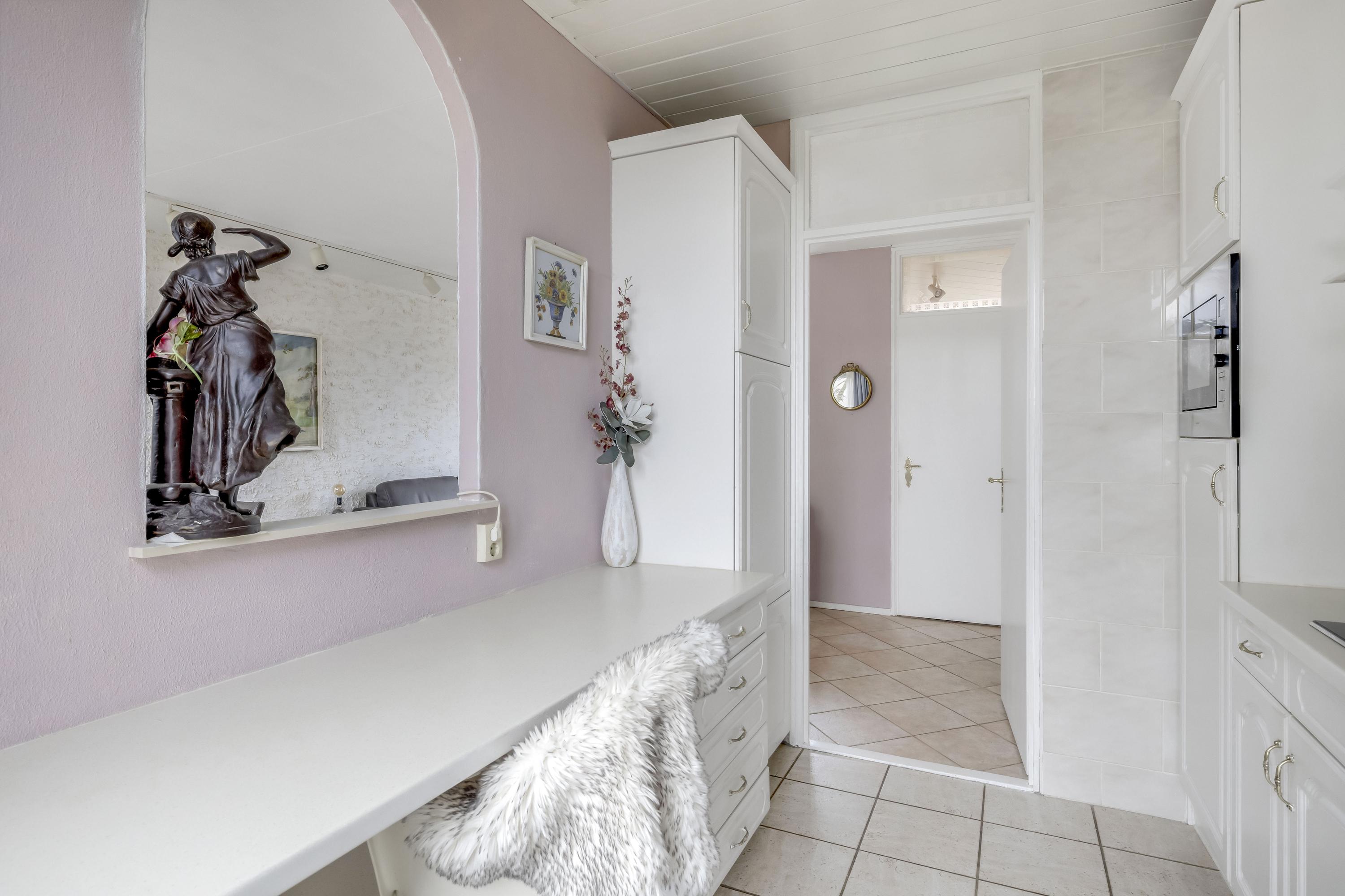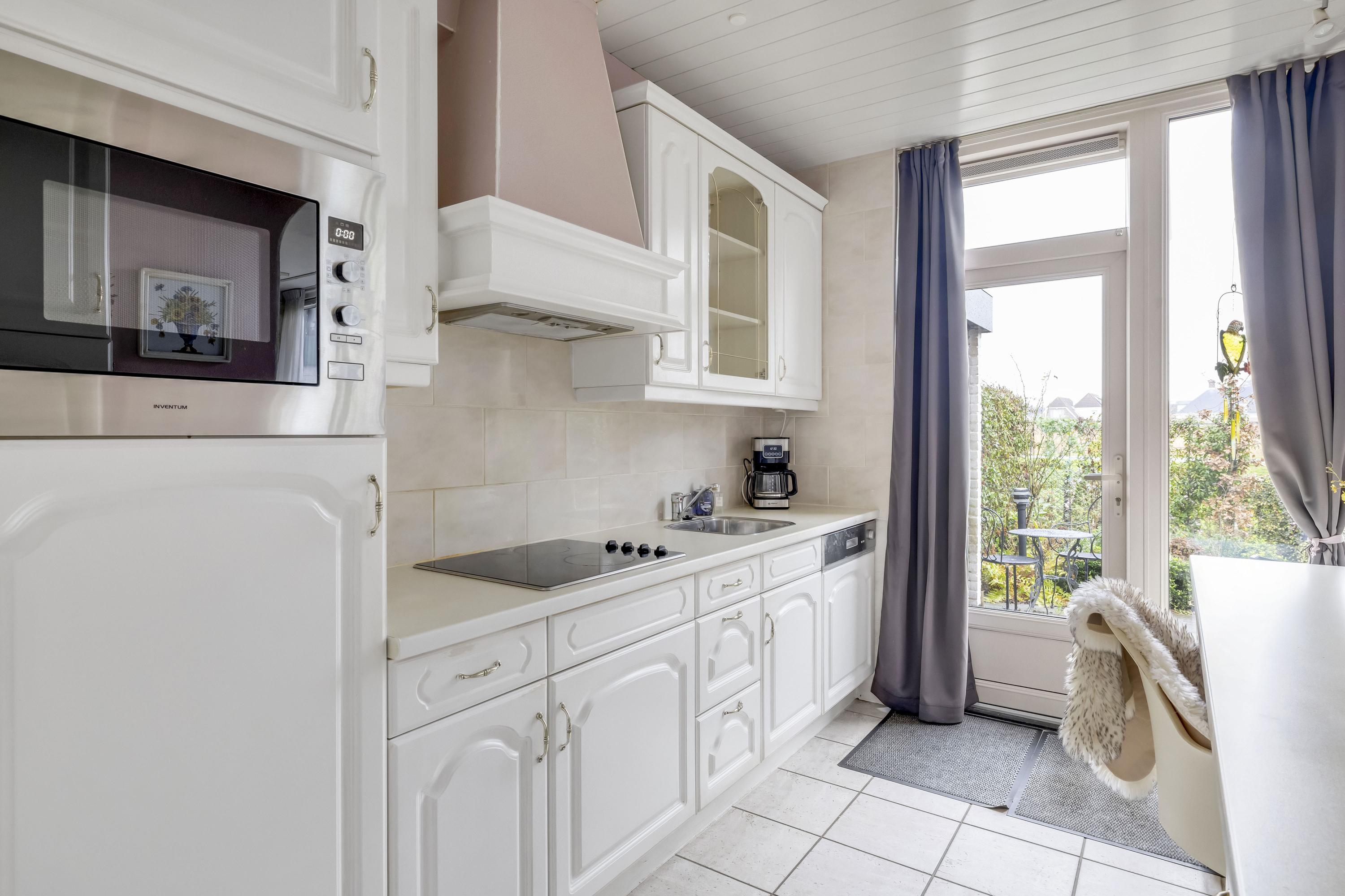 De dichte witte keuken grenst aan de achtertuin. Deze is geplaatst in een dubbele wandopstelling, waardoor er voldoende opberg-/ werkruimte is. De keuken is uitgevoerd met een spoelunit, kookplaat, afzuigkap, koelkast, magnetron en vaatwasmachine. Via de deur is de achtertuin bereikbaar.