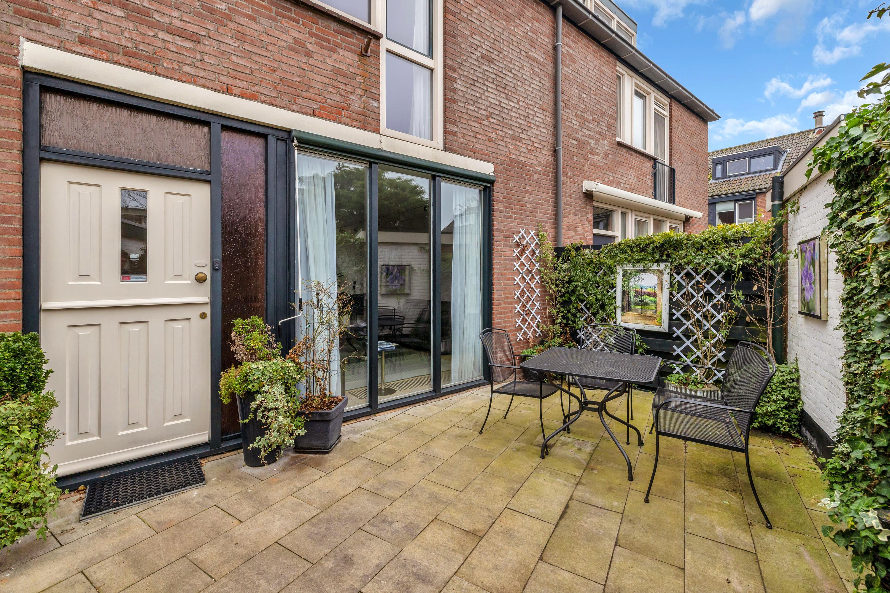 De tuin is bestraat en biedt plaats aan een auto op eigen oprit. Vanwege de pergola met klimop biedt de voortuin voldoende privacy om ook hier lekker van de zon te genieten. Hier is tevens de stenen berging.