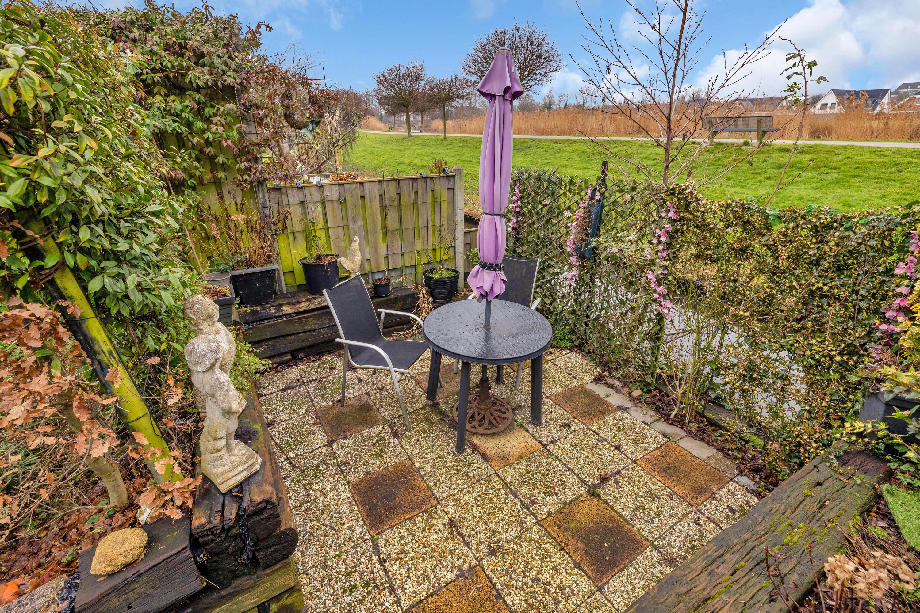 Middels een trapje bereikt u het lager gelegen terras aan de waterkant. Deze biedt vanwege de groene haag volop privacy.