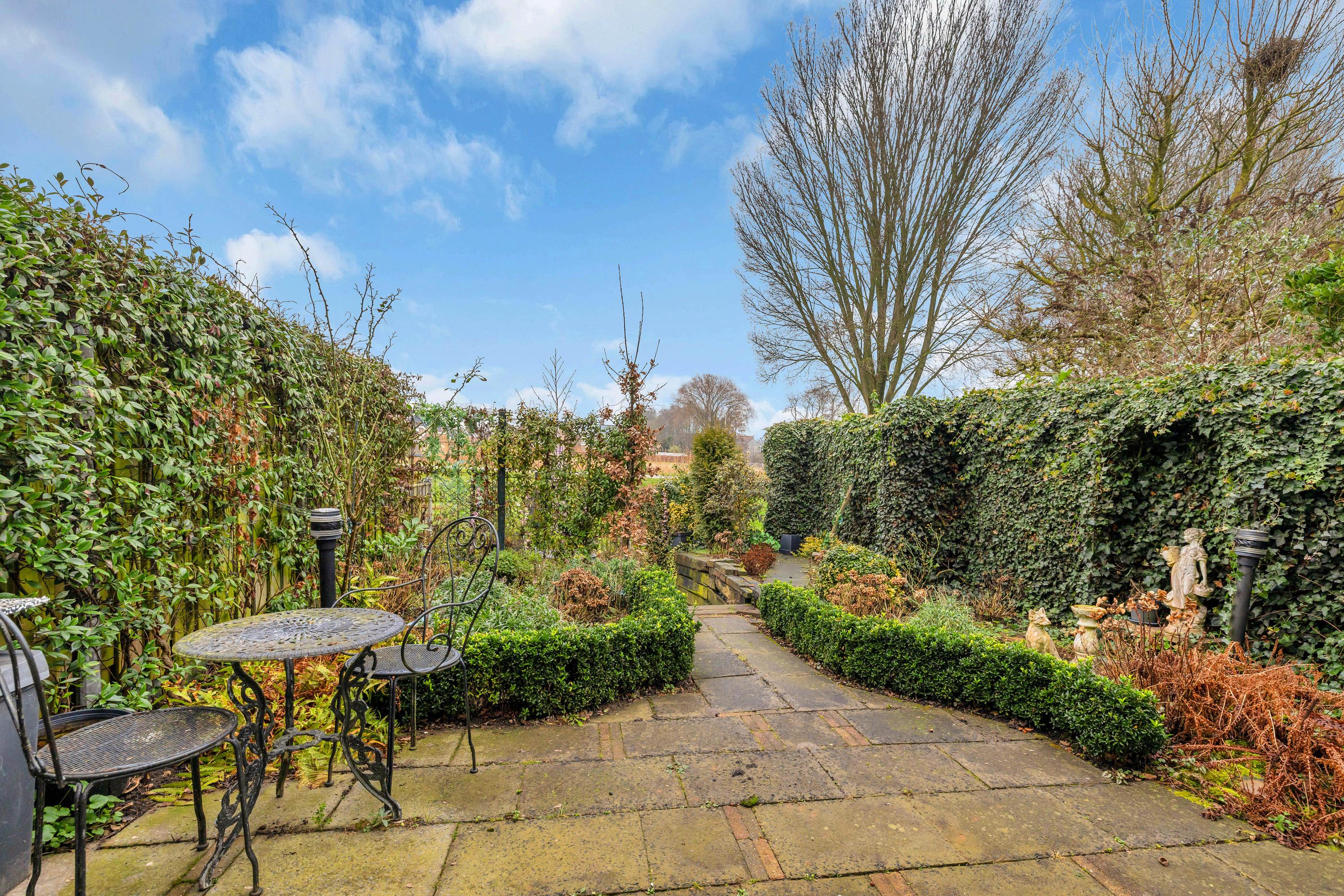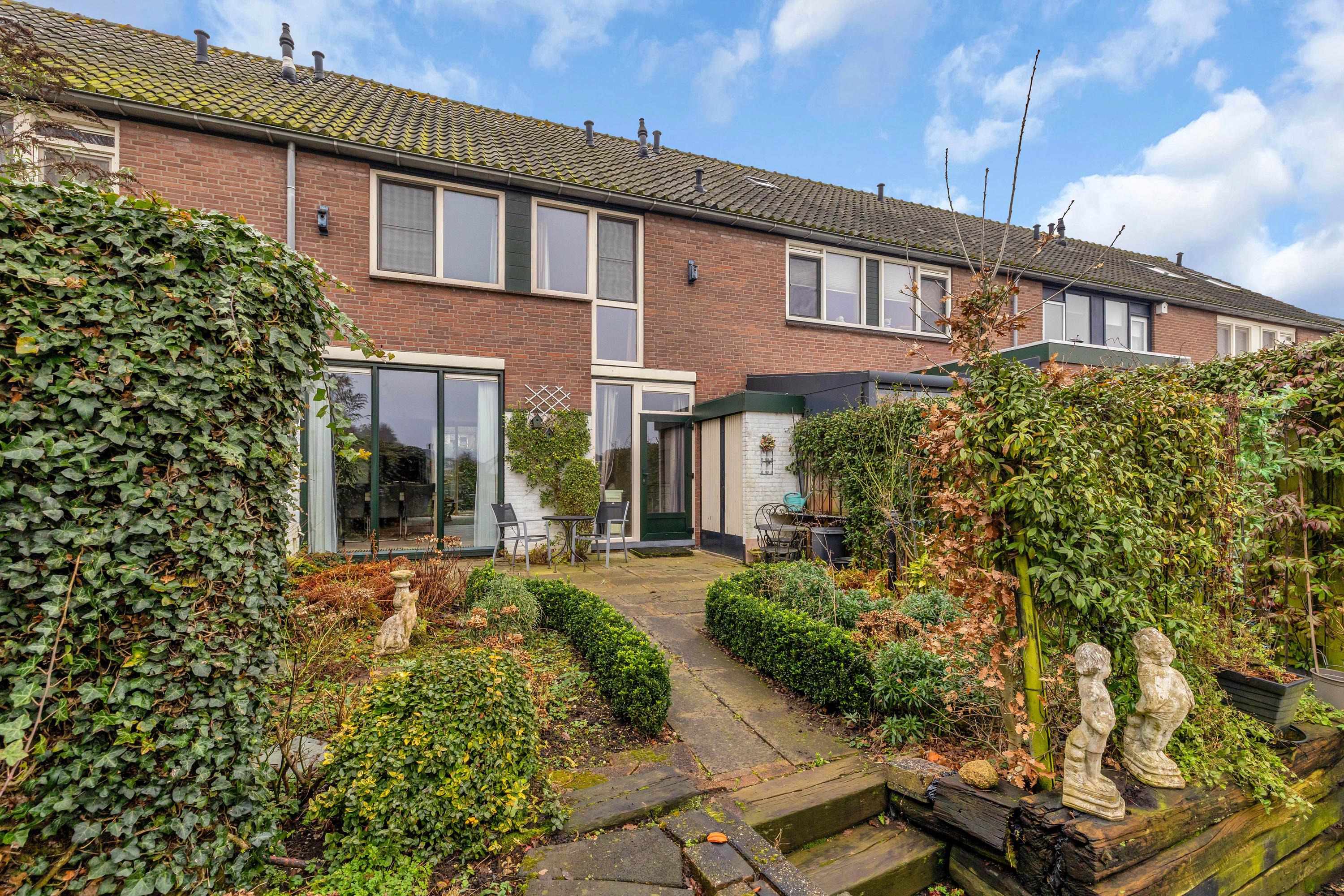 Achter de woning is het hoofdterras welke beschikt over diverse borders, hagen en vaste planten.