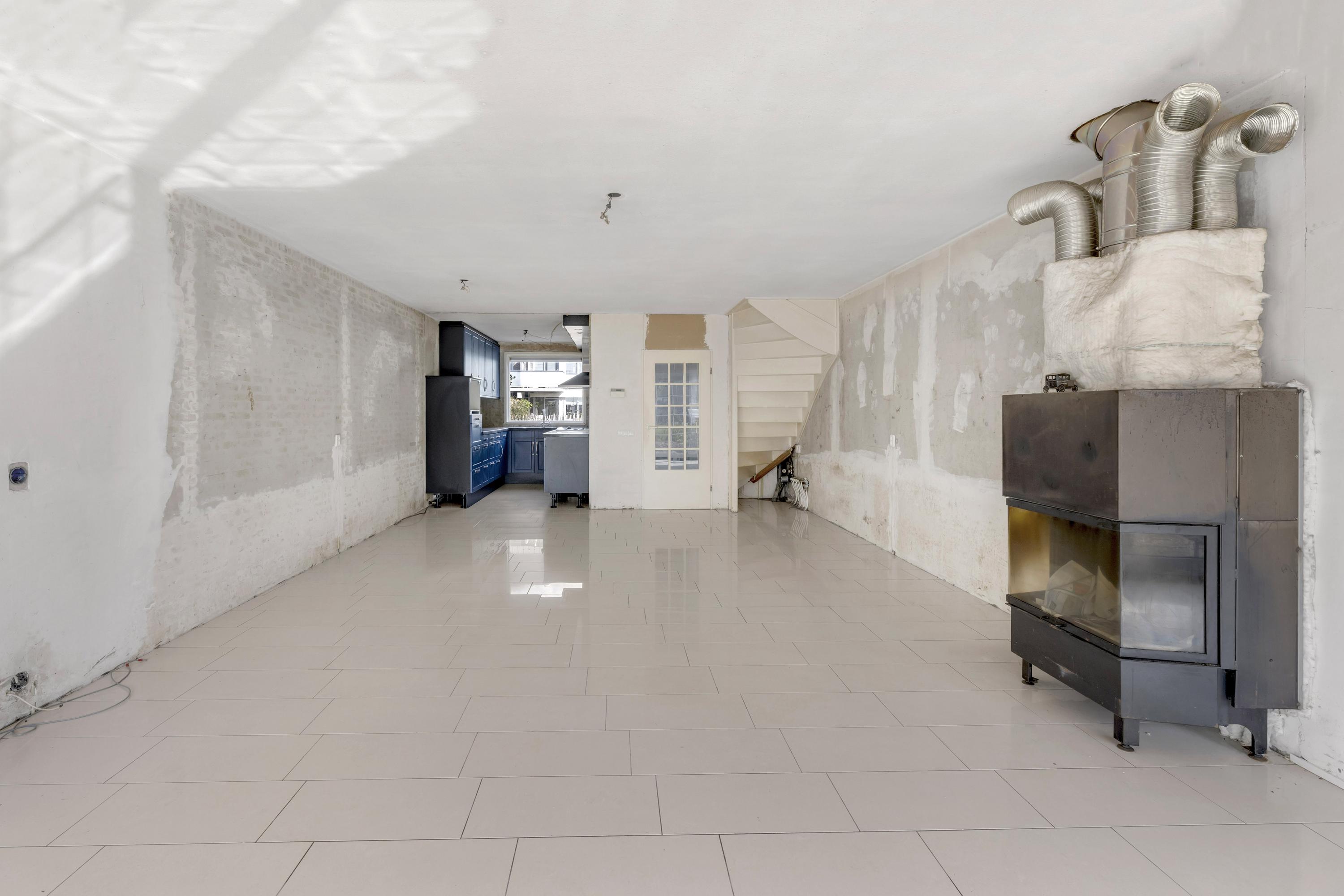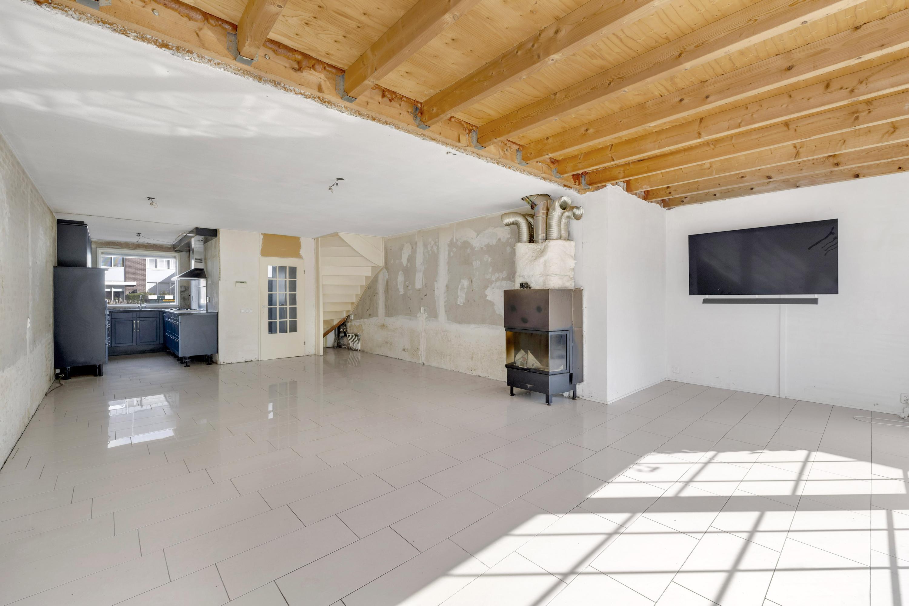 Lichte woonkamer met grote uitbouw en schuifpui naar de tuin. De woonkamer is v.v. plavuizen met vloerverwarming en houtkachel.