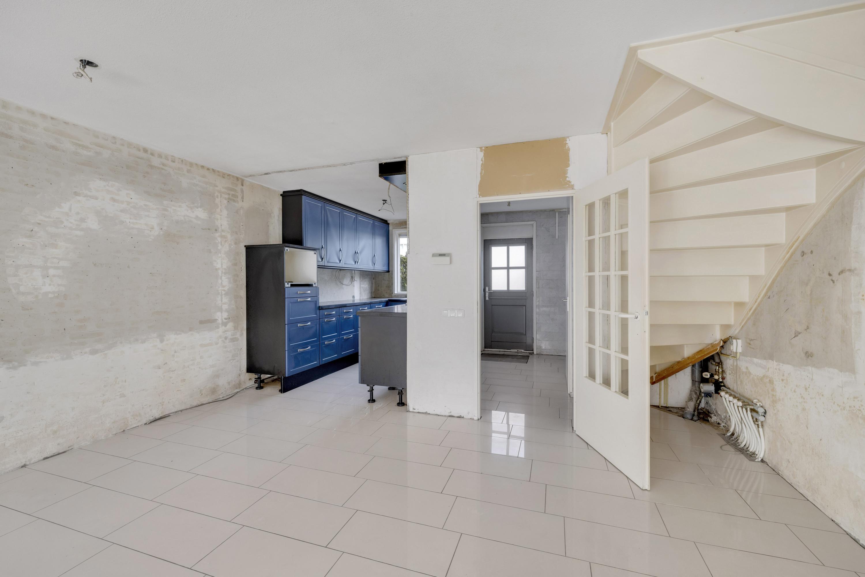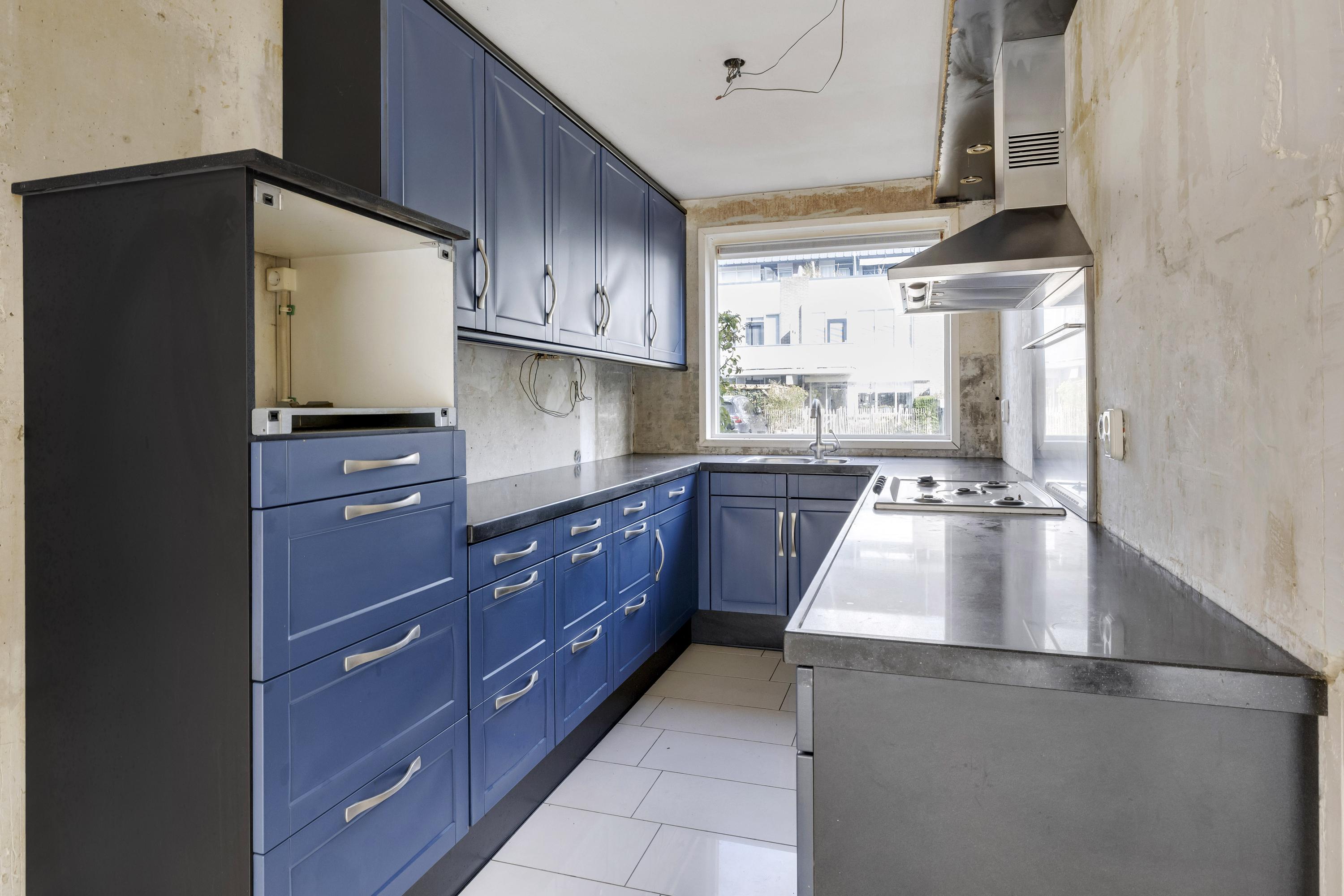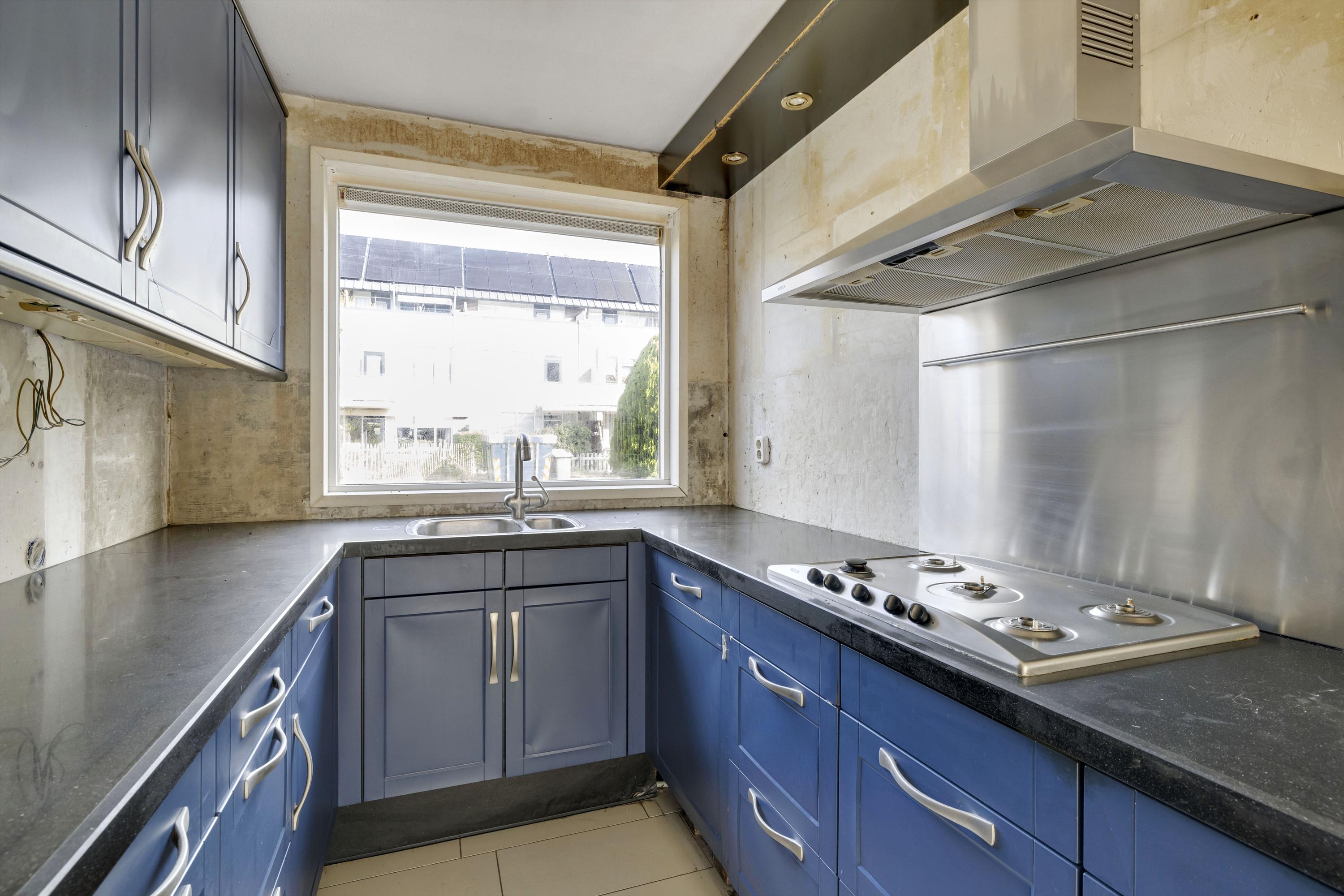 De open keuken bevindt zich aan de voorzijde van de woning. De eenvoudige U-opstelling is voorzien van spoelunit, vaatwasser, afzuigkap en gaskookplaat.