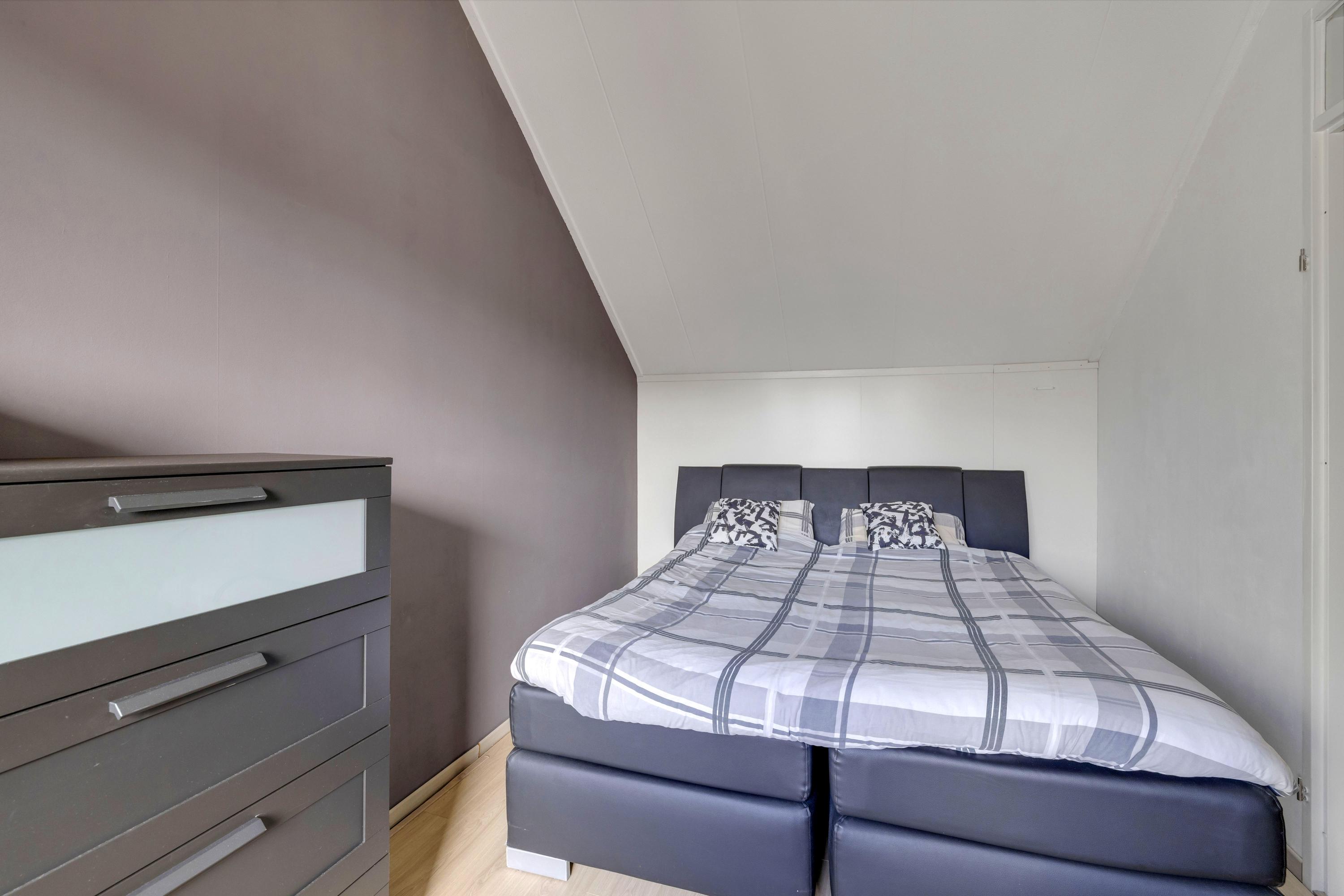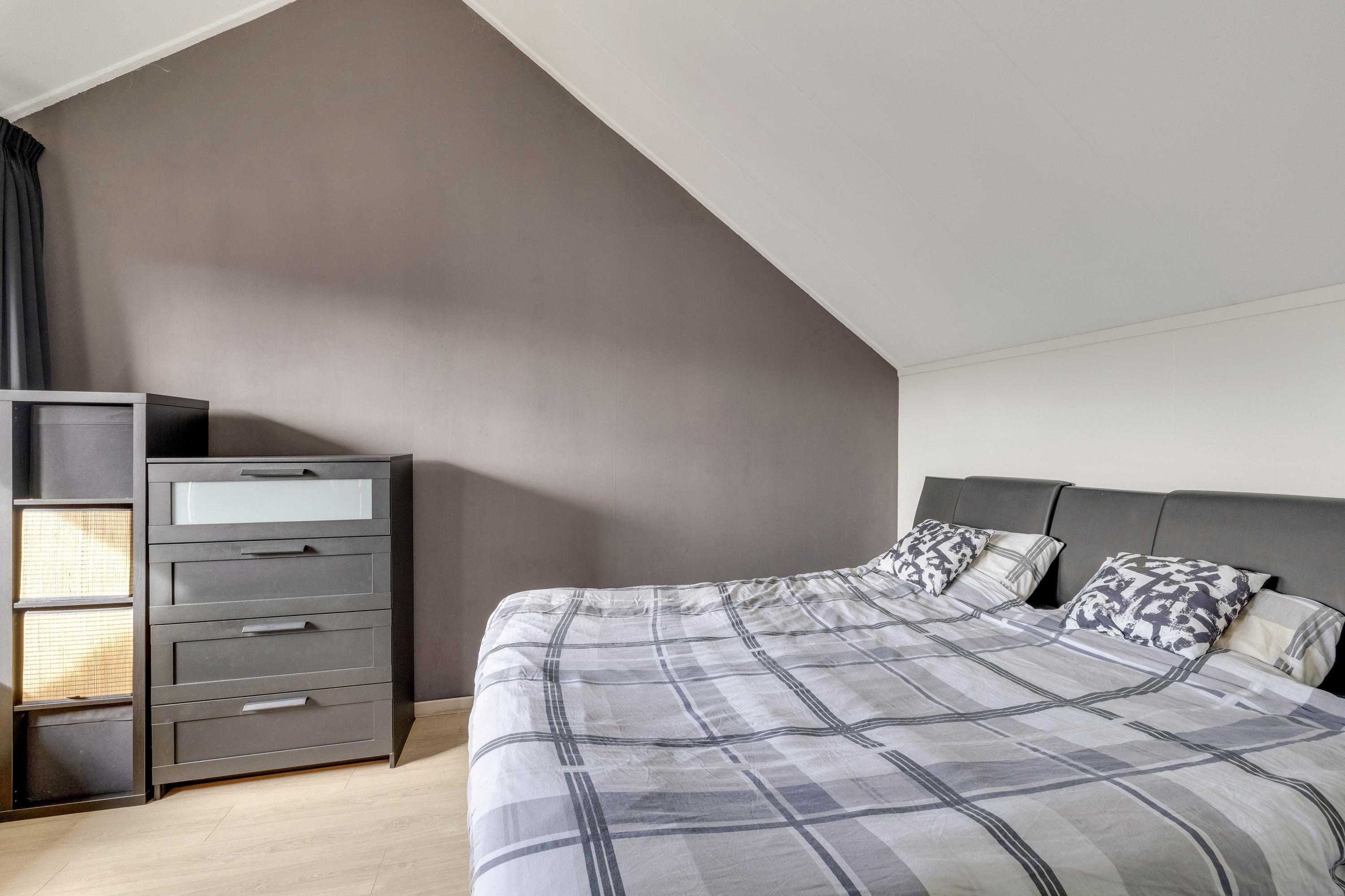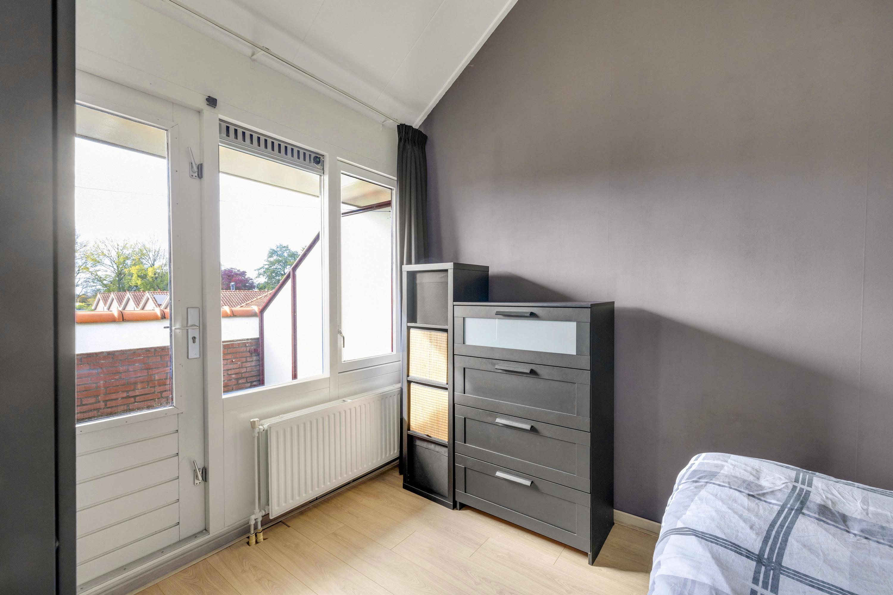 De ruime slaapkamer heeft toegang tot het fijne balkon. De kamer heeft een hoog plafond en er is bergruimte.