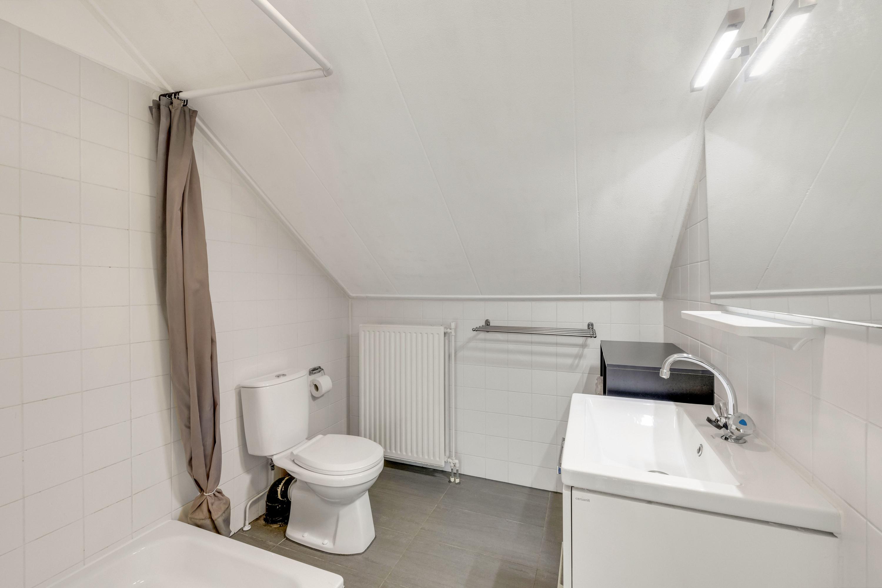 De betegelde badkamer is uitgevoerd met douche, 2e toilet, wastafelmeubel en verwarming.