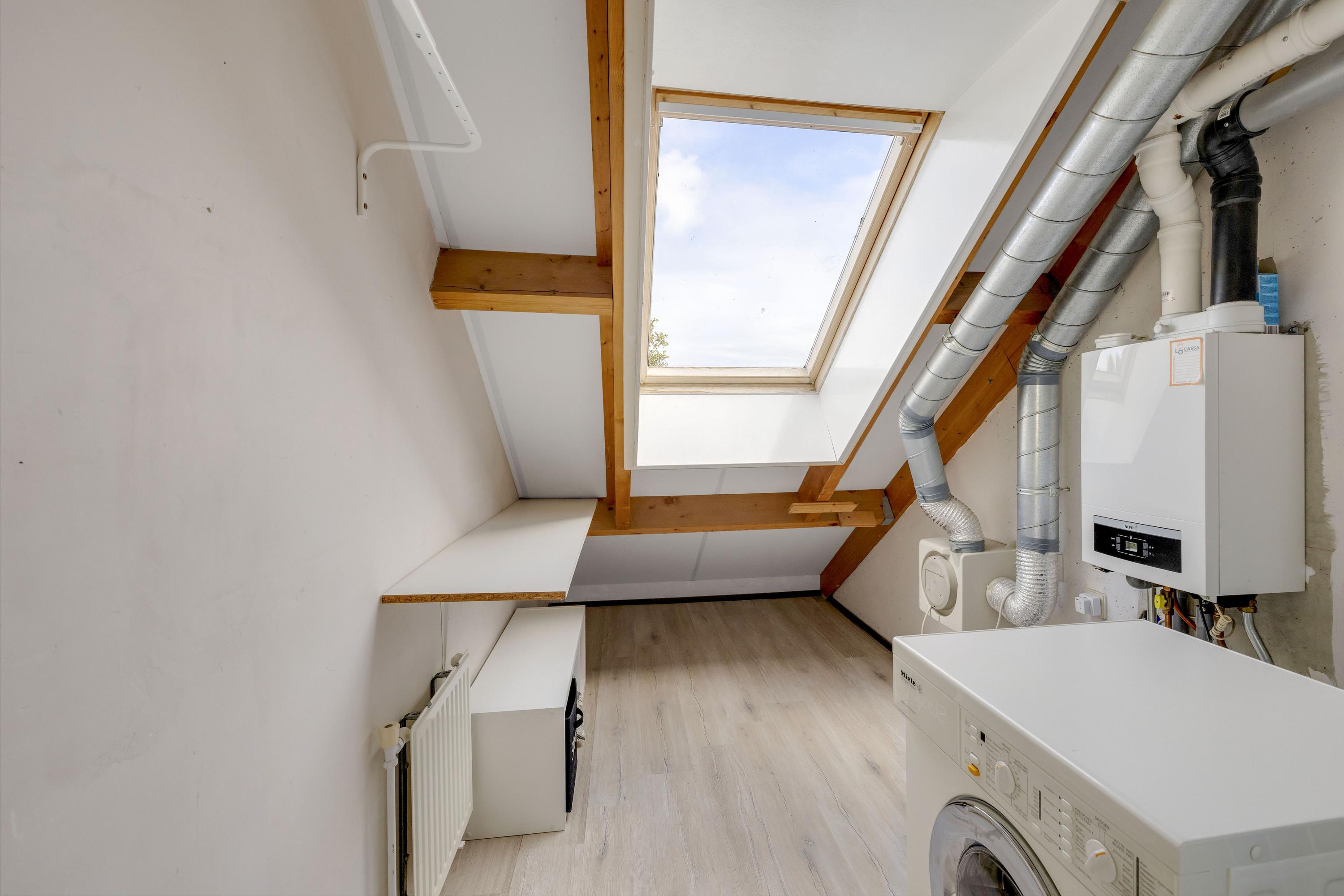 Wasruimte (mogelijk werkkamer) met dakraam, radiator en de opstelplaats van de cv-ketel en de wasmachine.