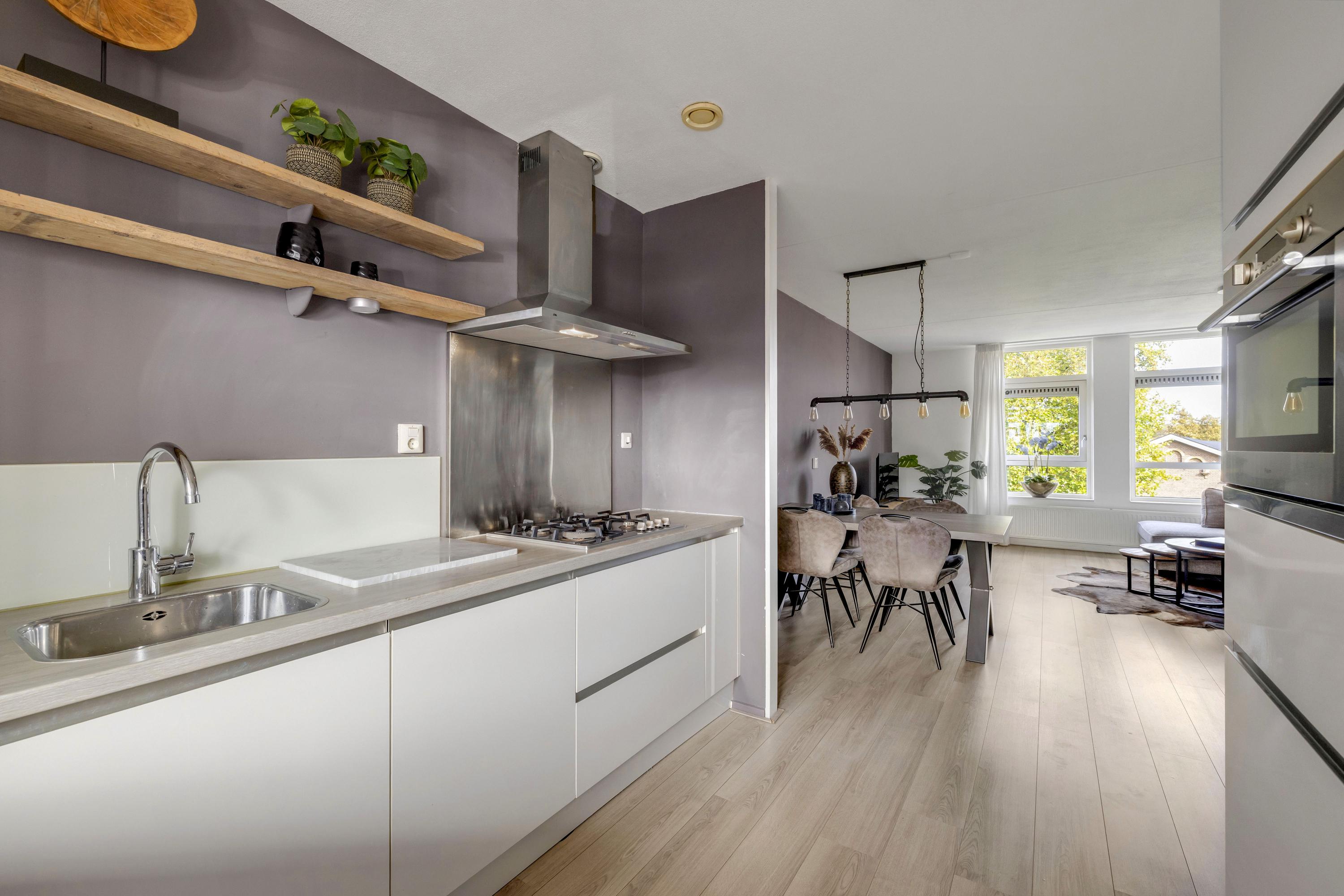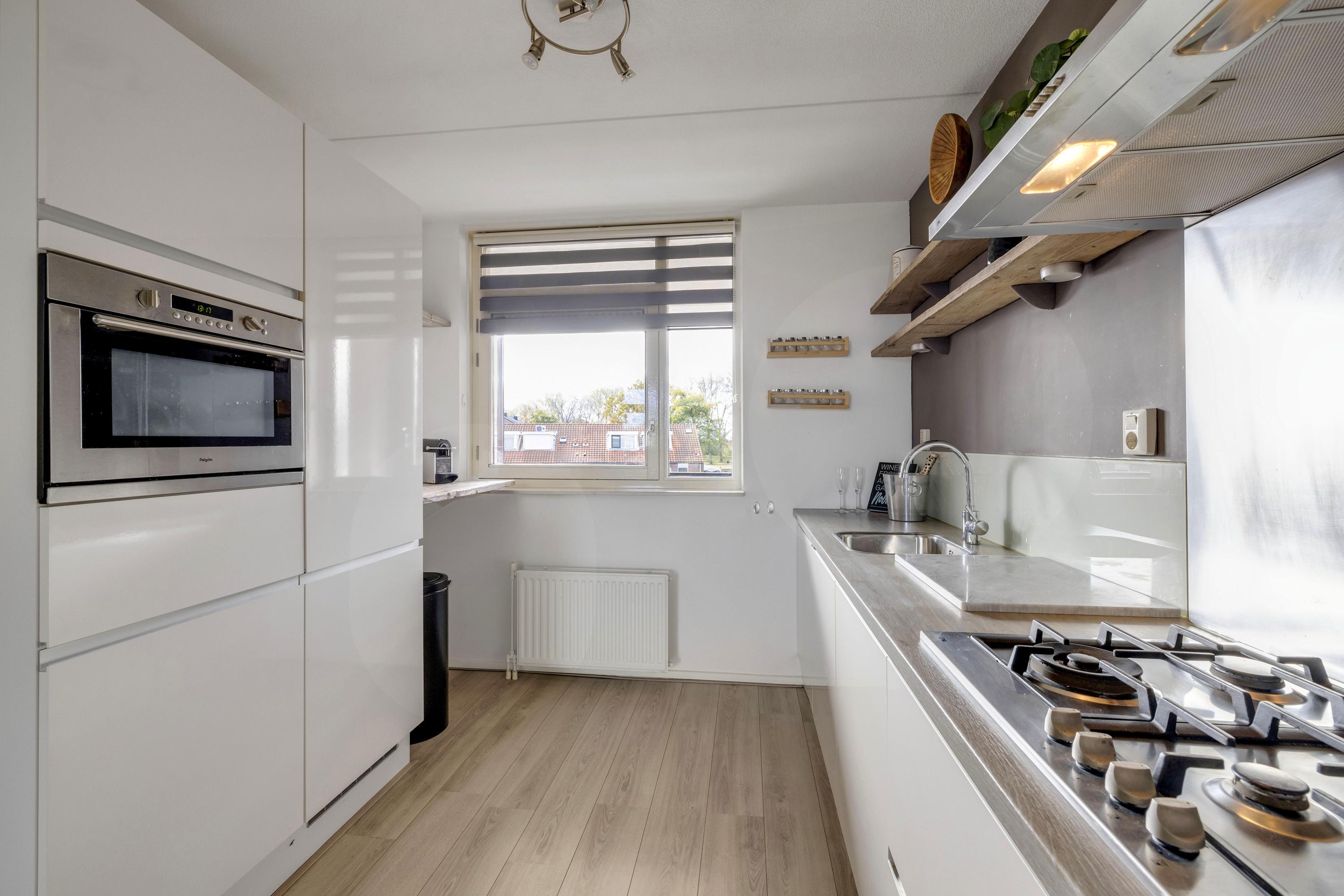 De moderne open keuken is van alle gemakken voorzien. De keuken is uitgerust met een combi-oven, 4-pits gaskookplaat afzuigkap, koel-/vriescombinatie en vaatwasmachine.