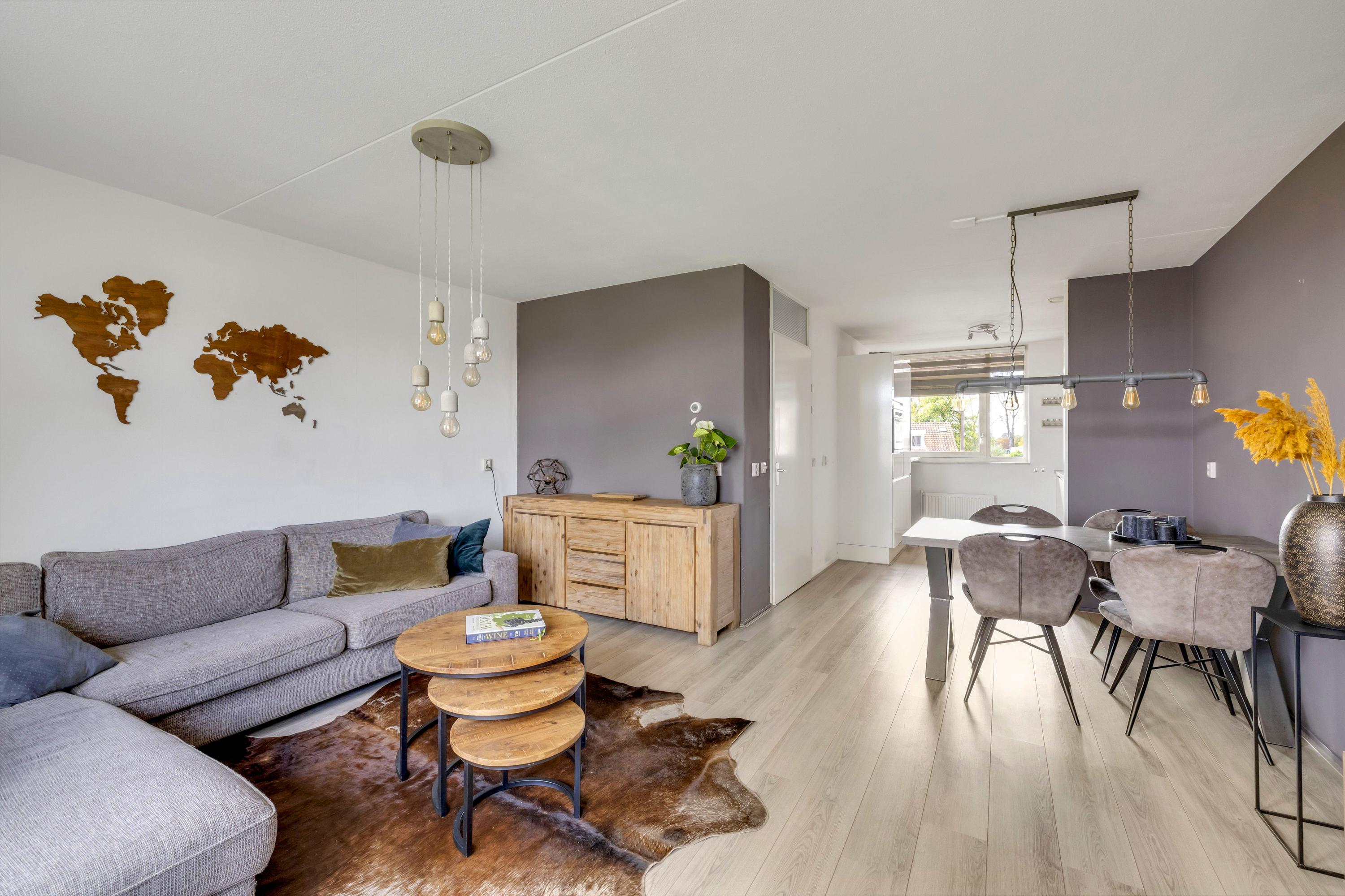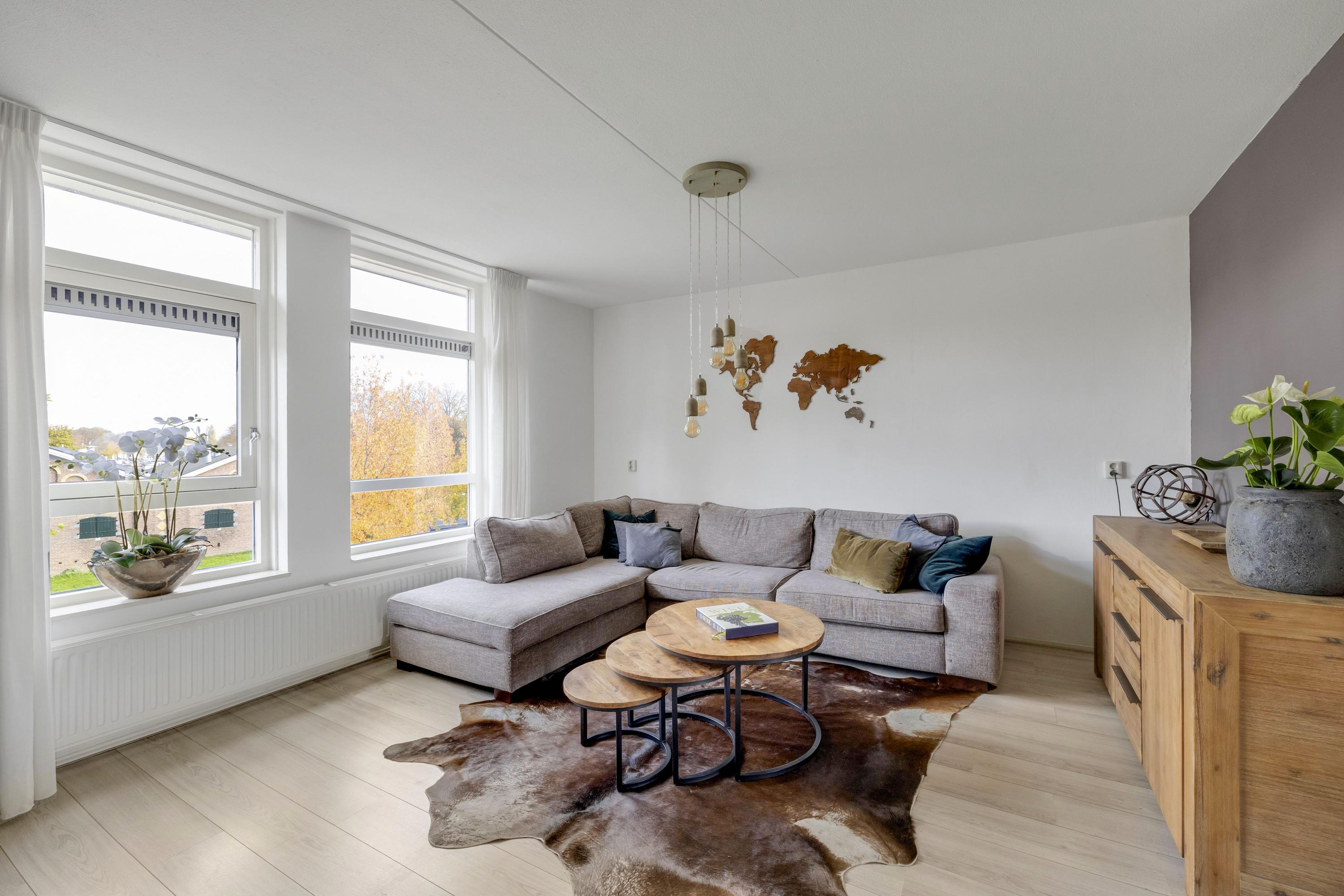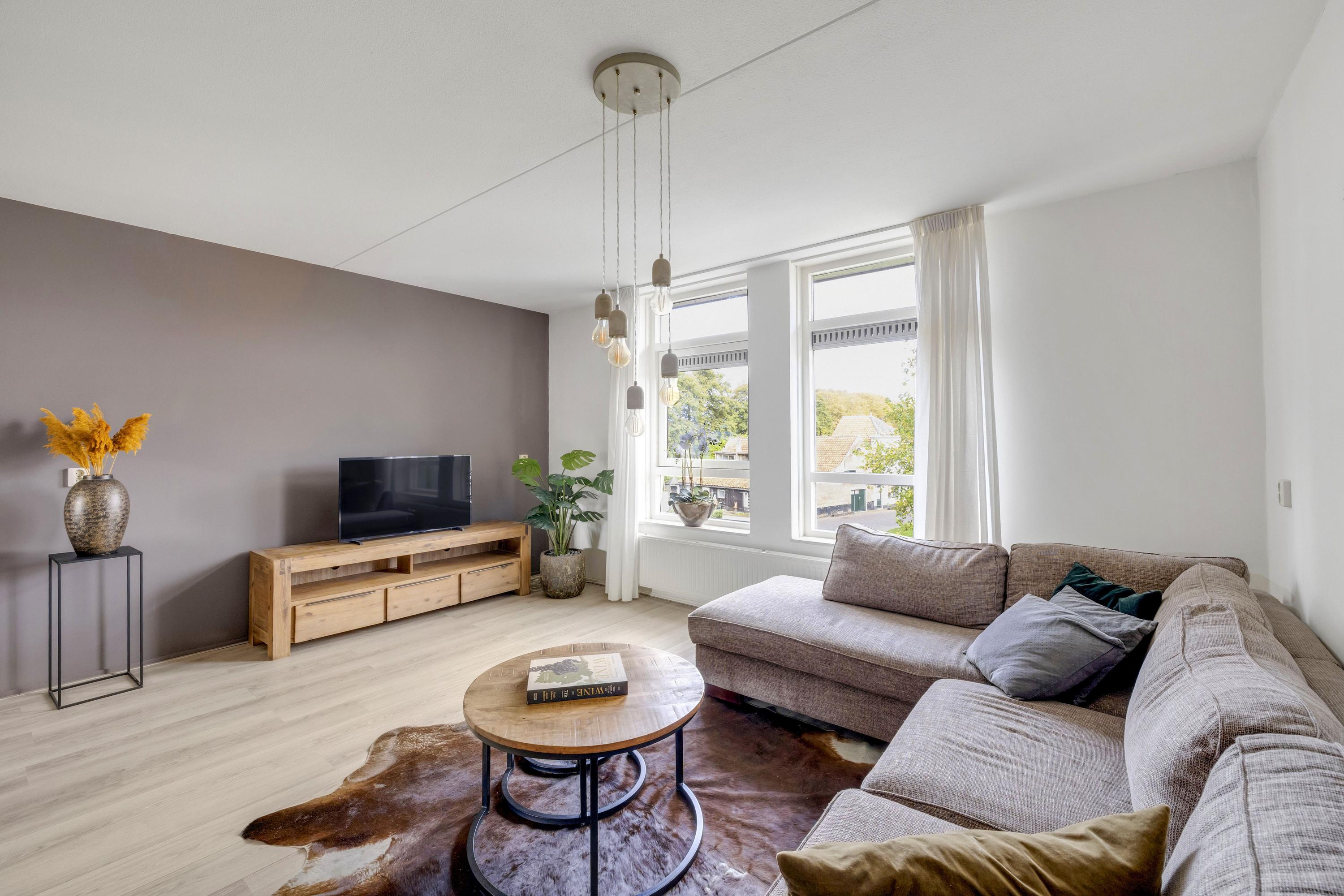 De gezellige woonkamer is een fijne lichte ruimte met uitzicht over de sloepenloods aan het Maarland.