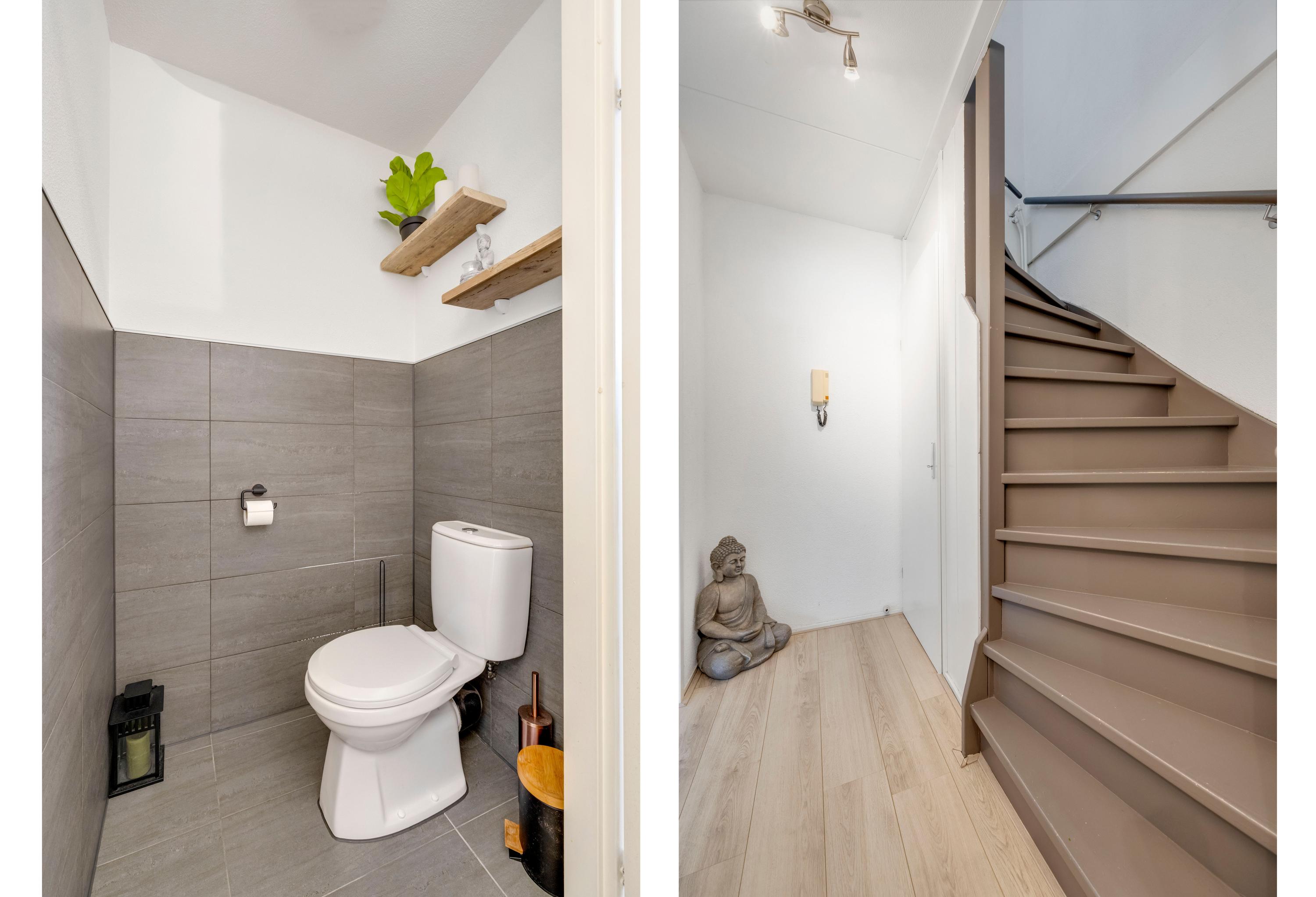 Hal met het modern toilet, meterkast, trapopgang naar de slaapverdieping en toegang tot de woonkamer.
