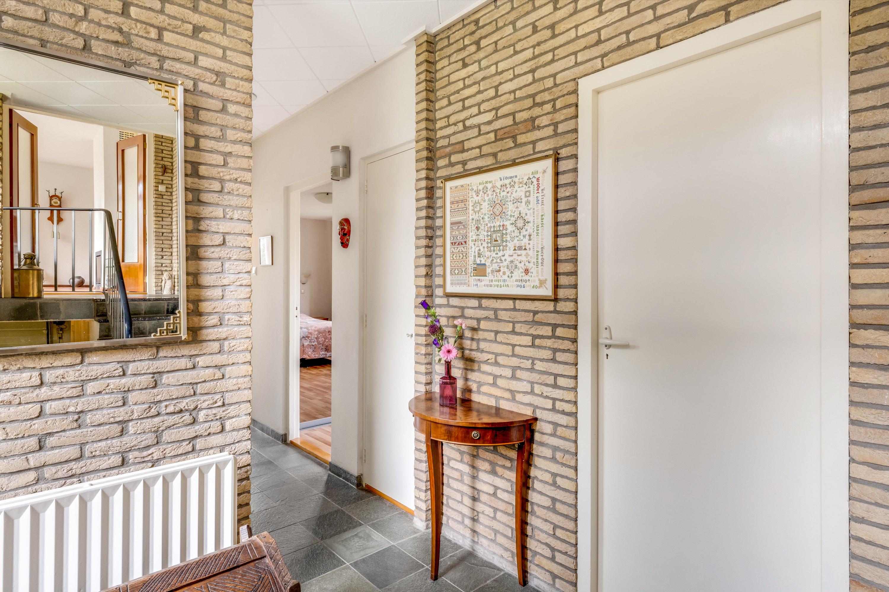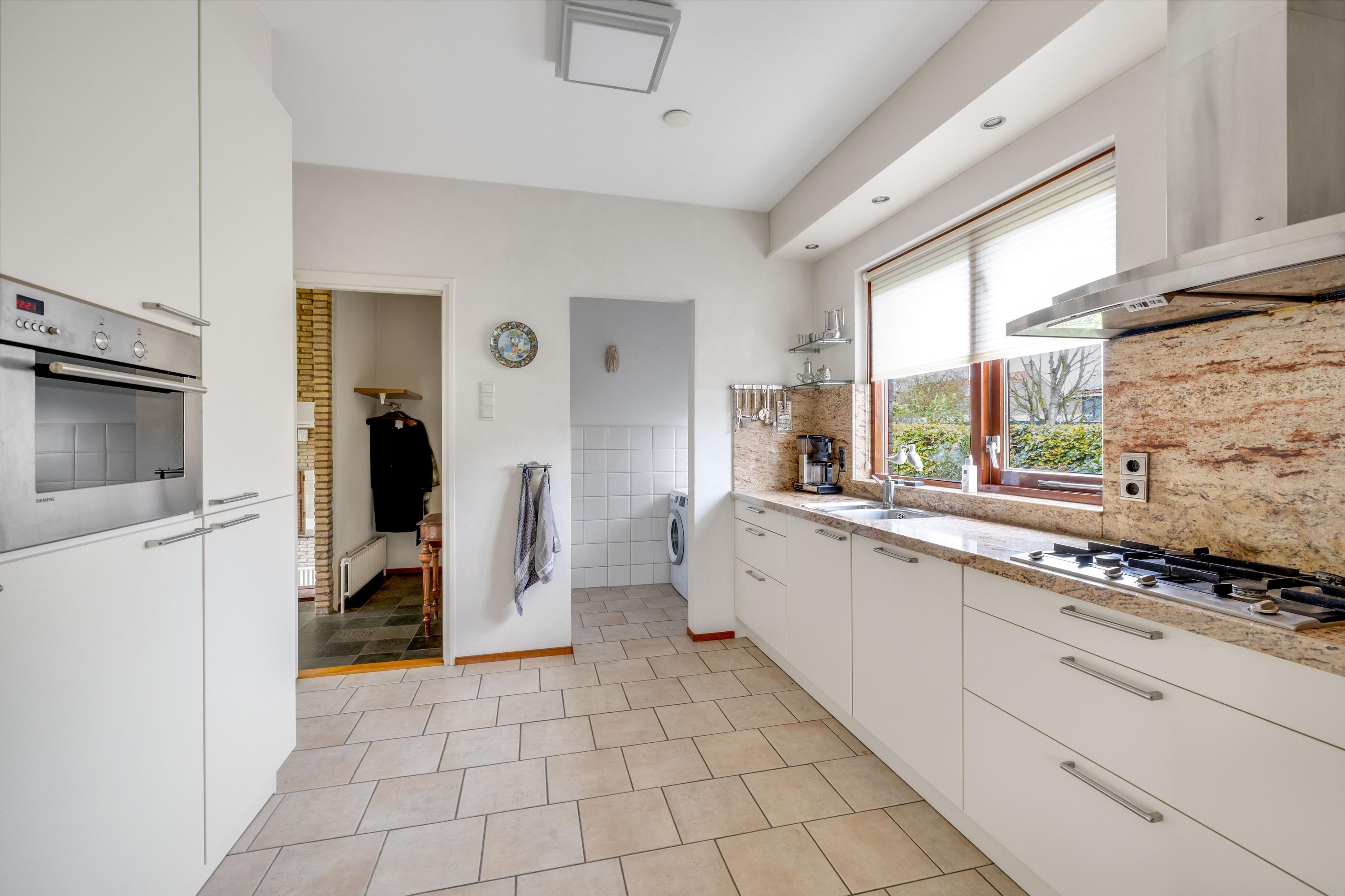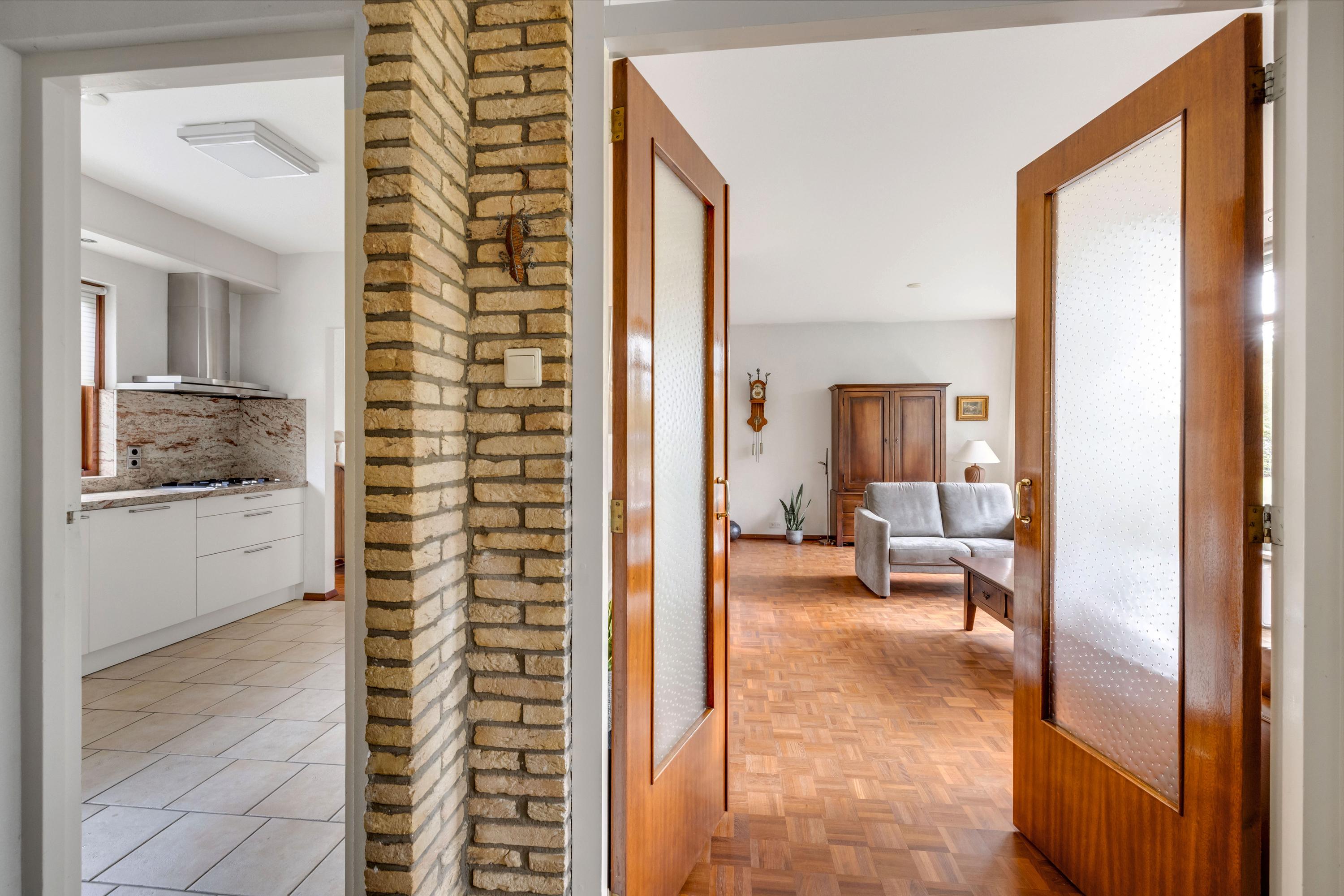 De entree van de woning bevindt zich aan de zijkant. Je stapt binnen in een ruime hal met een plavuizen vloer. Via een klein niveauverschil (+1,2 meter) komen we op de overloop die toegang biedt tot de woonkamer, de werkkamer, de keuken en het toilet met fontein. De woonkamer is bereikbaar via dubbele openslaande deuren en vormt samen met de eethoek een sfeervolle leefruimte. Dankzij de grote raampartijen en het Franse balkon is deze ruimte heerlijk licht, terwijl de parketvloer en de gashaard zorgen voor warmte en karakter. De keuken sluit direct aan op de woonkamer en is uitgevoerd in twee rechte opstellingen met een natuurstenen aanrechtblad. De keuken is uitgerust met een gaskookplaat, afzuigkap, oven, koelkast en vaatwasser. Aangrenzend bevindt zich de praktische bijkeuken met aansluiting voor wasmachine en droger. De vloer in de keuken en bijkeuken zijn voorzien van plavuizen. Terug in de entreehal vind je halverwege de woning de eerste royale slaapkamer met laminaatvloer en een vaste schuifwandkast. Aan de achterzijde ligt de tweede slaapkamer, eveneens voorzien van laminaat en met een deur naar de tuin. De badkamer is praktisch ingedeeld en voorzien van een douche, hangend closet, wastafel en designradiator.