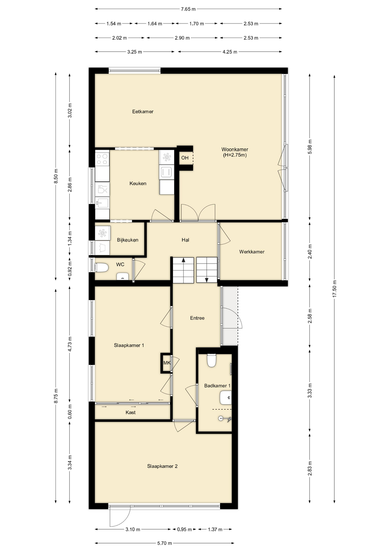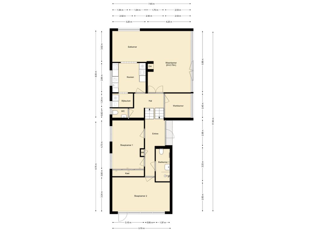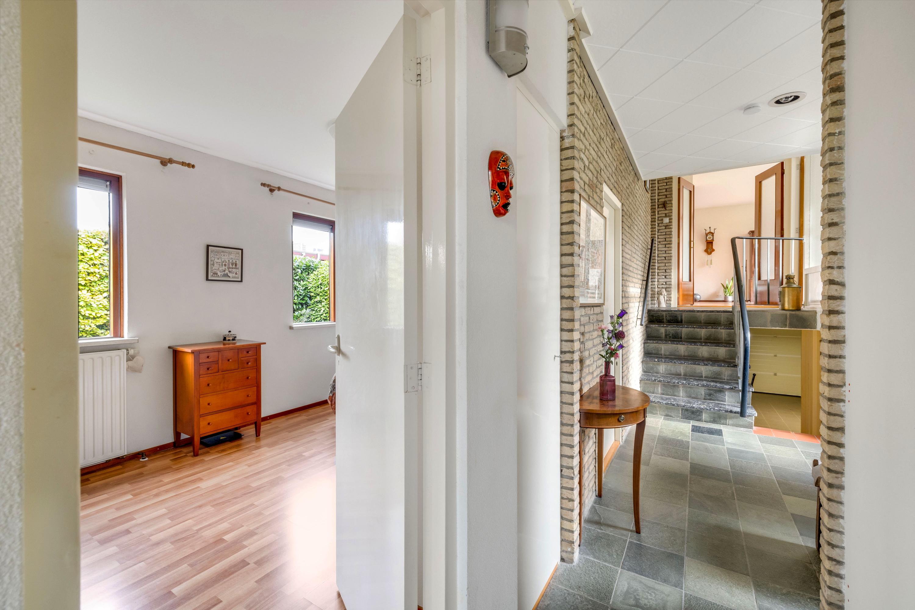 De entree van de woning bevindt zich aan de zijkant. Je stapt binnen in een ruime hal met een plavuizen vloer. Via een klein niveauverschil (+1,2 meter) komen we op de overloop die toegang biedt tot de woonkamer, de werkkamer, de keuken en het toilet met fontein. De woonkamer is bereikbaar via dubbele openslaande deuren en vormt samen met de eethoek een sfeervolle leefruimte. Dankzij de grote raampartijen en het Franse balkon is deze ruimte heerlijk licht, terwijl de parketvloer en de gashaard zorgen voor warmte en karakter. De keuken sluit direct aan op de woonkamer en is uitgevoerd in twee rechte opstellingen met een natuurstenen aanrechtblad. De keuken is uitgerust met een gaskookplaat, afzuigkap, oven, koelkast en vaatwasser. Aangrenzend bevindt zich de praktische bijkeuken met aansluiting voor wasmachine en droger. De vloer in de keuken en bijkeuken zijn voorzien van plavuizen. Terug in de entreehal vind je halverwege de woning de eerste royale slaapkamer met laminaatvloer en een vaste schuifwandkast. Aan de achterzijde ligt de tweede slaapkamer, eveneens voorzien van laminaat en met een deur naar de tuin. De badkamer is praktisch ingedeeld en voorzien van een douche, hangend closet, wastafel en designradiator.
