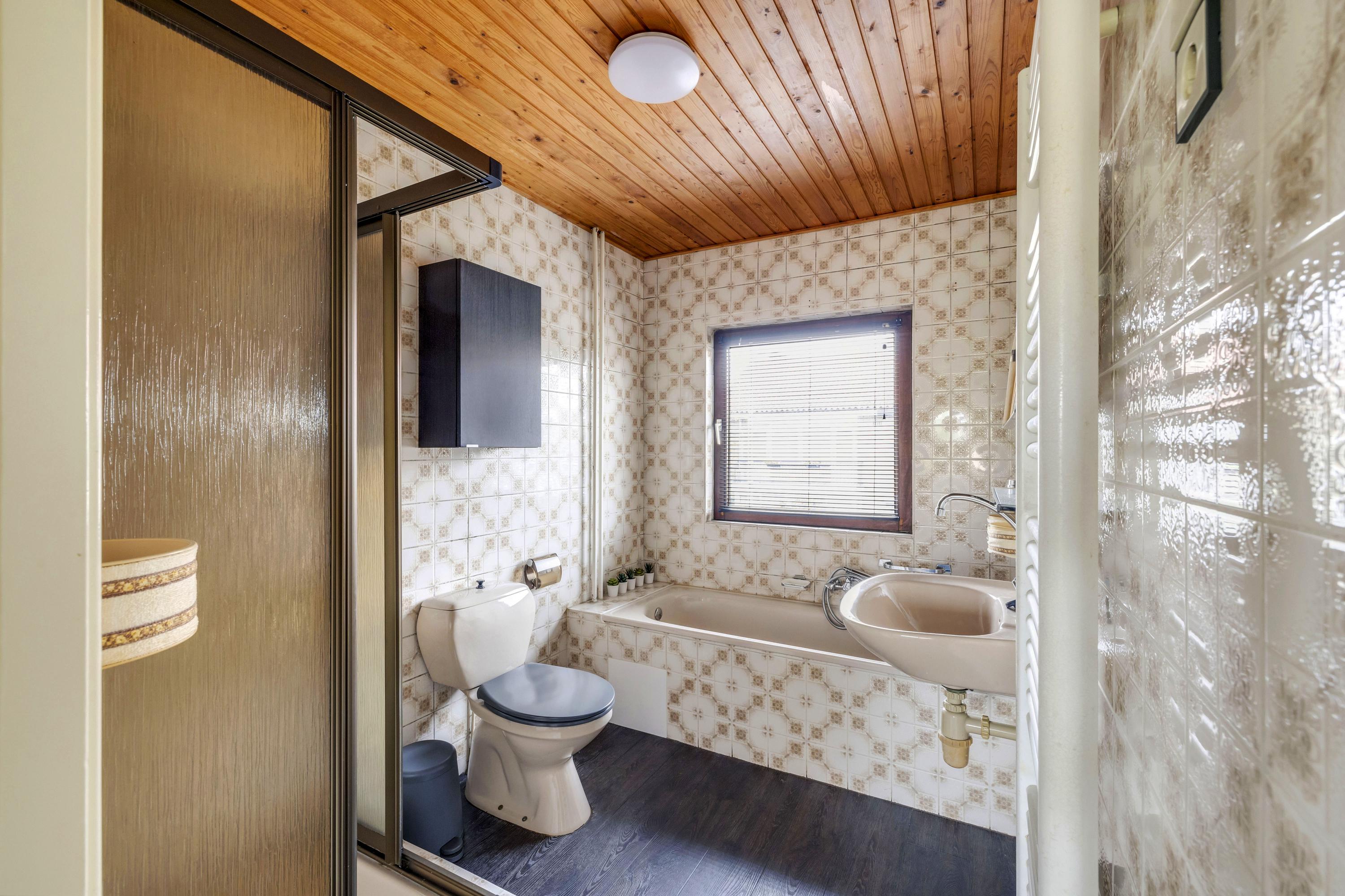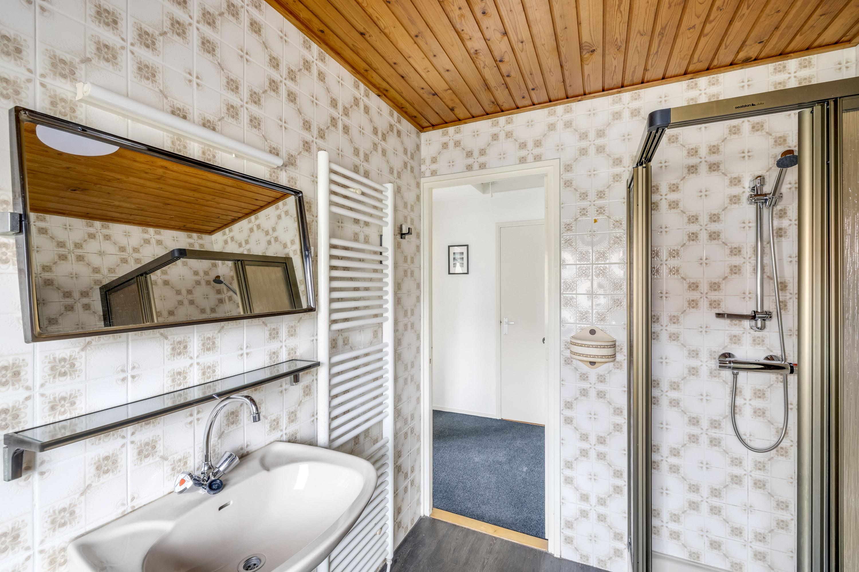 De badkamer is eenvoudig betegeld en uitgevoerd met wastafel, douchecabine, ligbad en radiator. De vloer is v.v pvc.