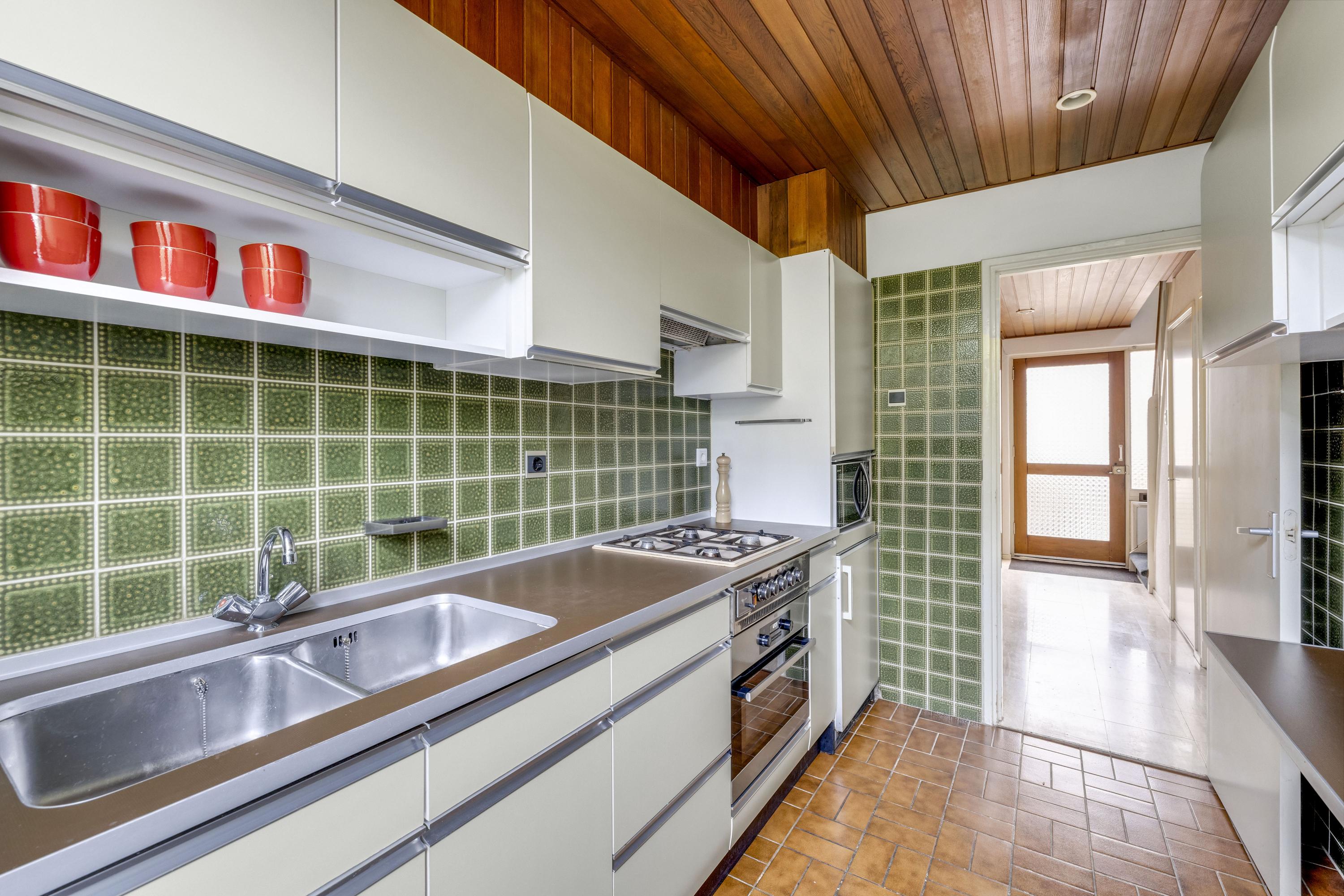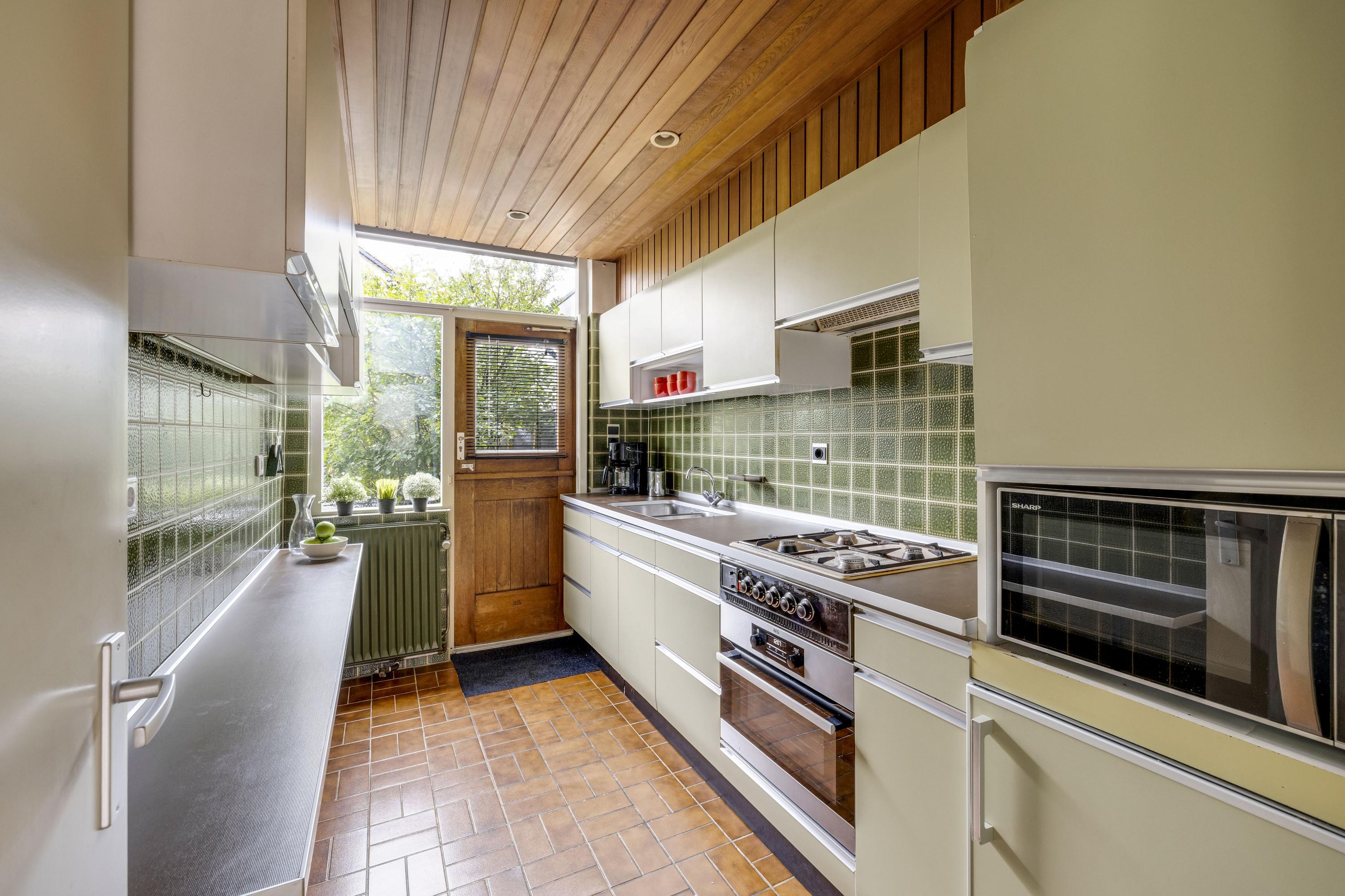 De eenvoudige dichte keuken is gelegen aan de tuinzijde van de woning. De keuken met eenvoudige wandopstelling is v.v. een spoelunit, oven, 4 pits gaskookplaat, afzuigkap, koelkast met vriesvak en close-in boiler. Via de deur is de tuin bereikbaar.