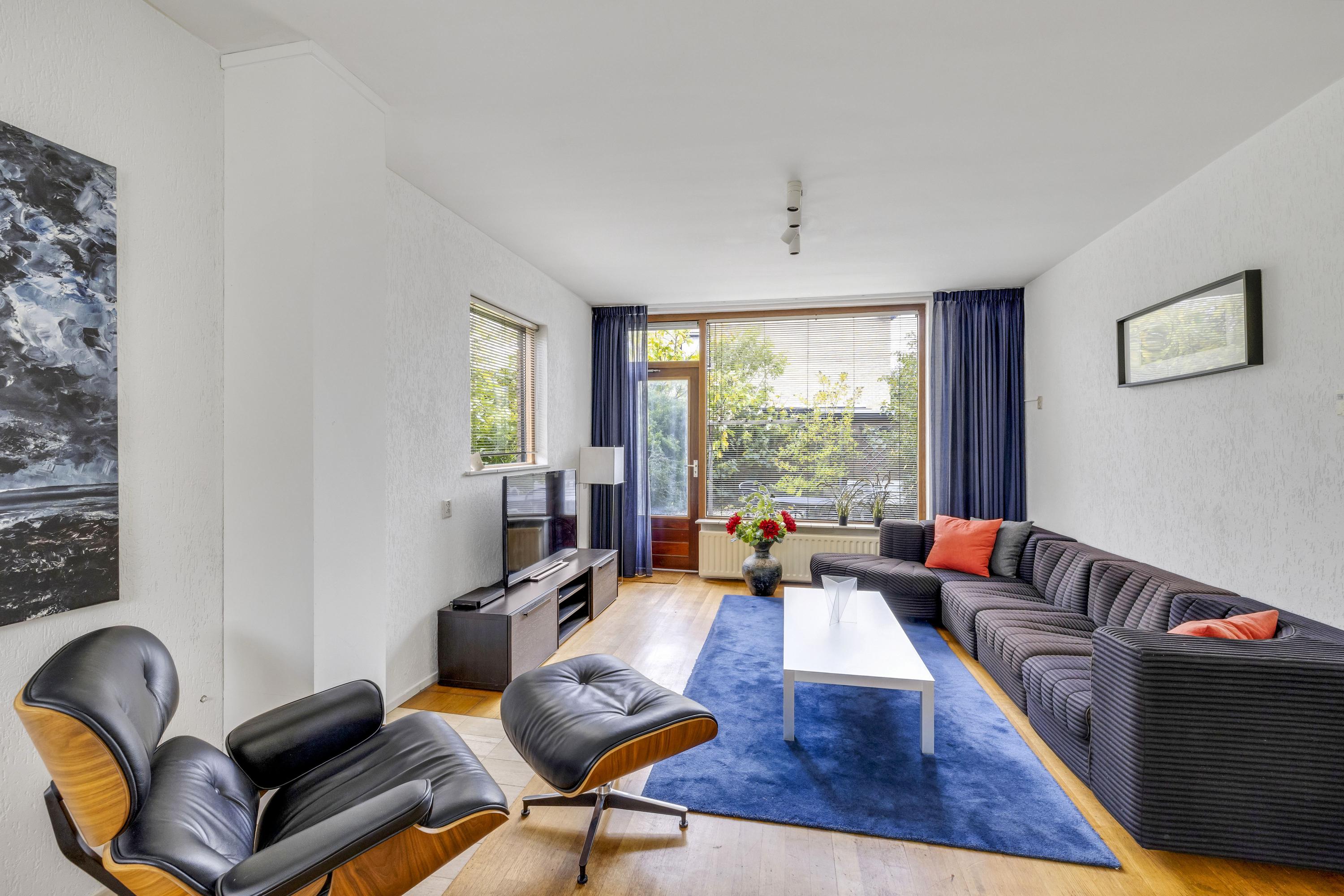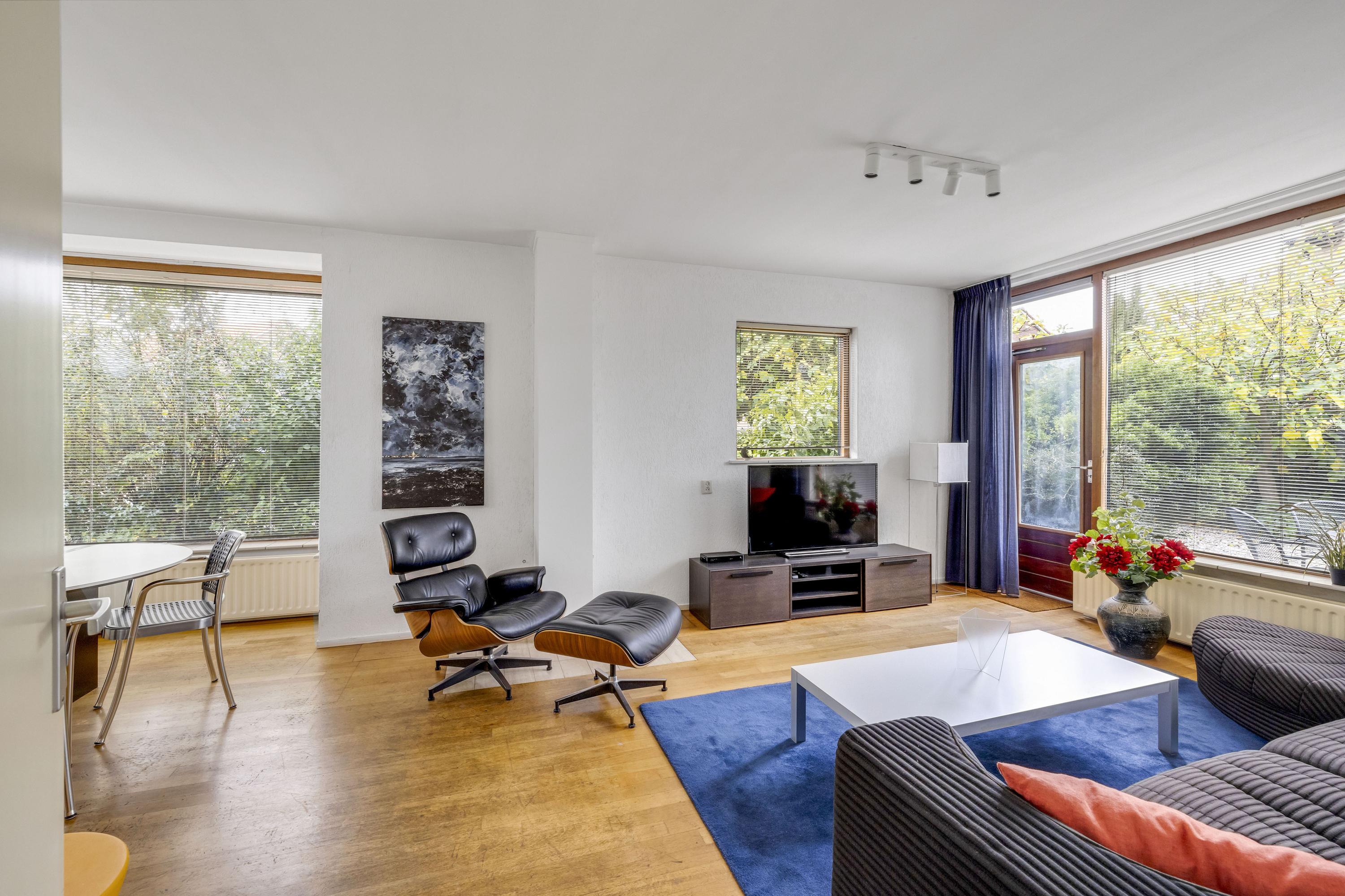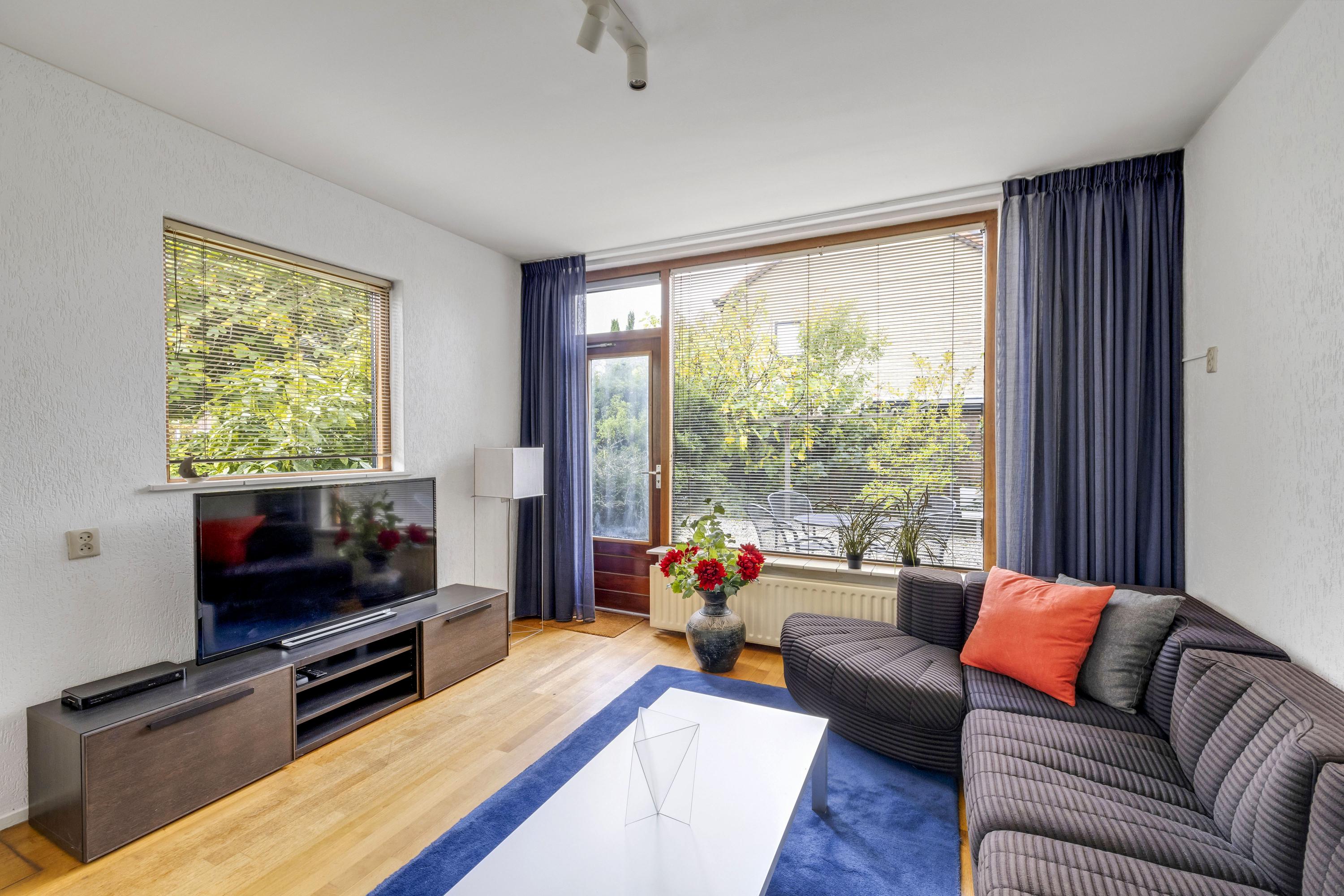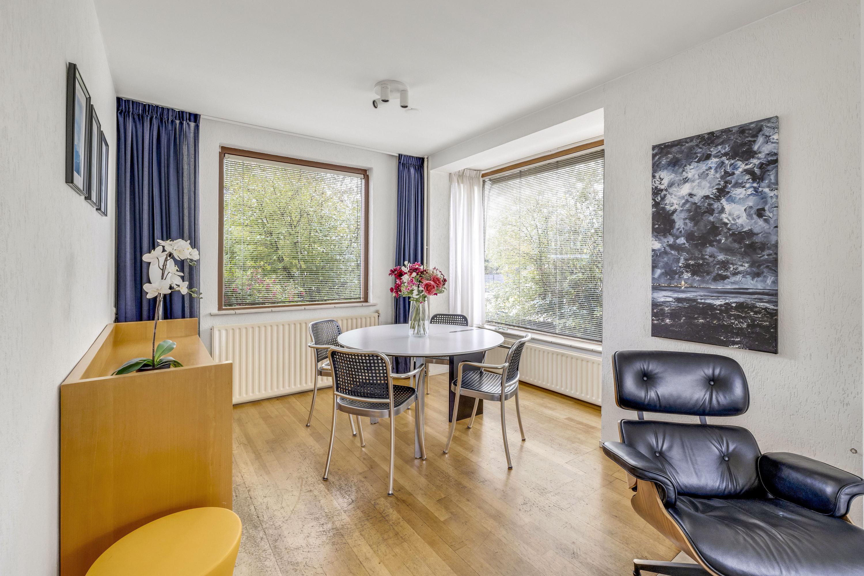 De zonnige woonkamer met erker heeft royale raampartijen aan de voor-, achterzijde en zijgevel. Verder beschikt de kamer over een deur naar de tuin. De vloer is v.v. eikenhout.