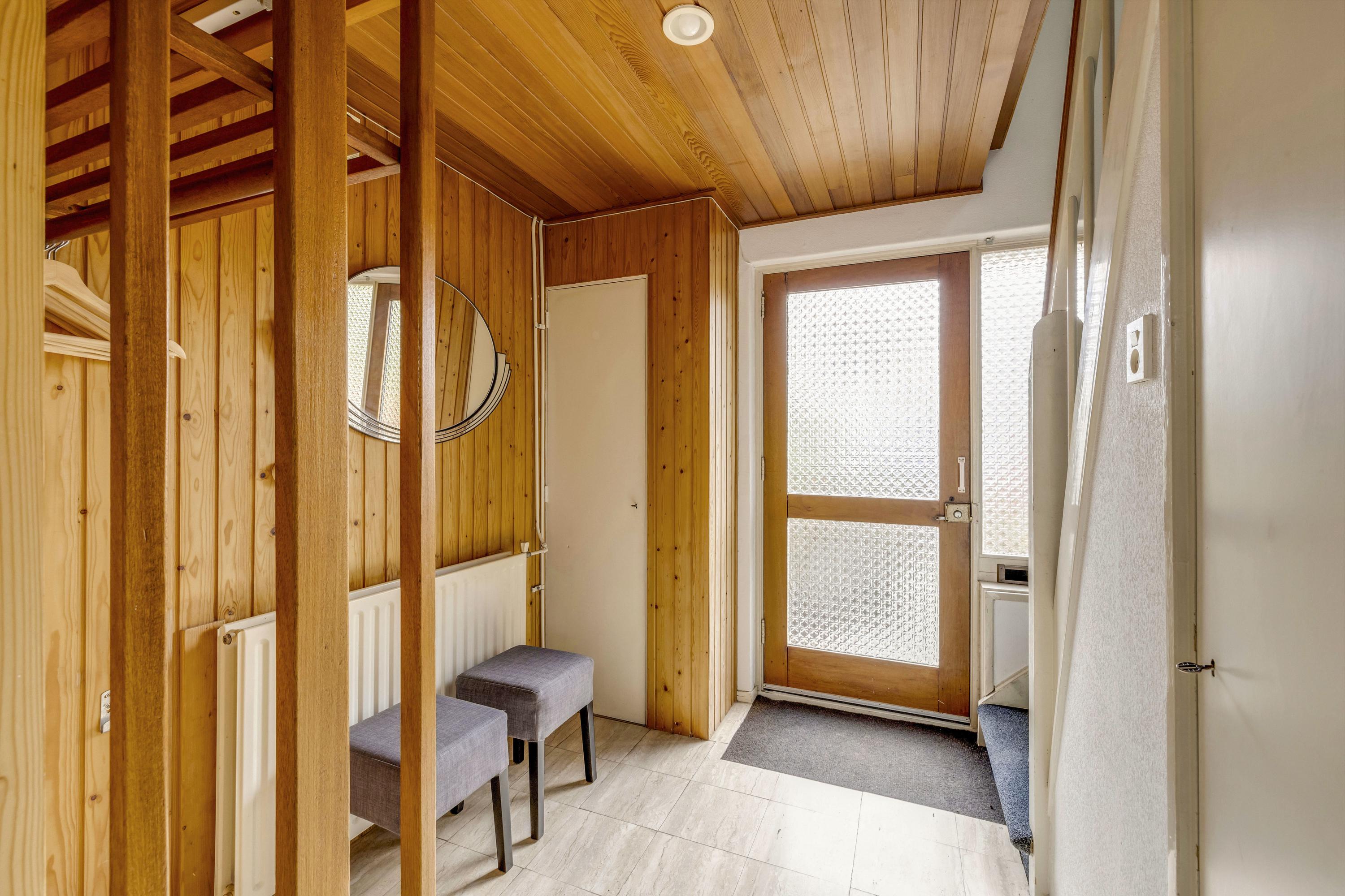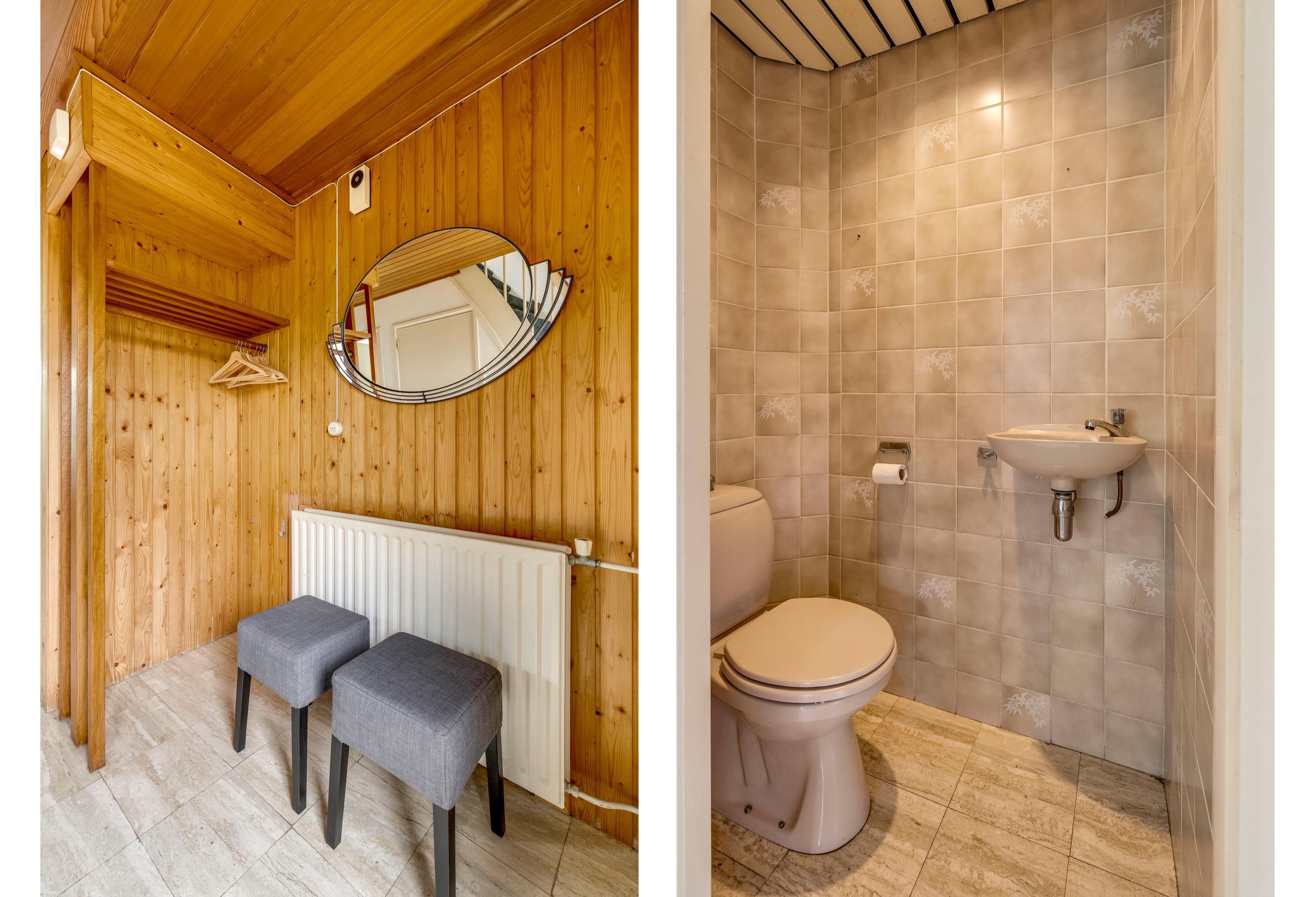 Ruime entree/ hal met garderobe, trapkast, meterkast, trapopgang naar 1e verdieping en betegeld toilet met fonteintje. Vanuit de hal is er toegang tot de woonkamer en de keuken.