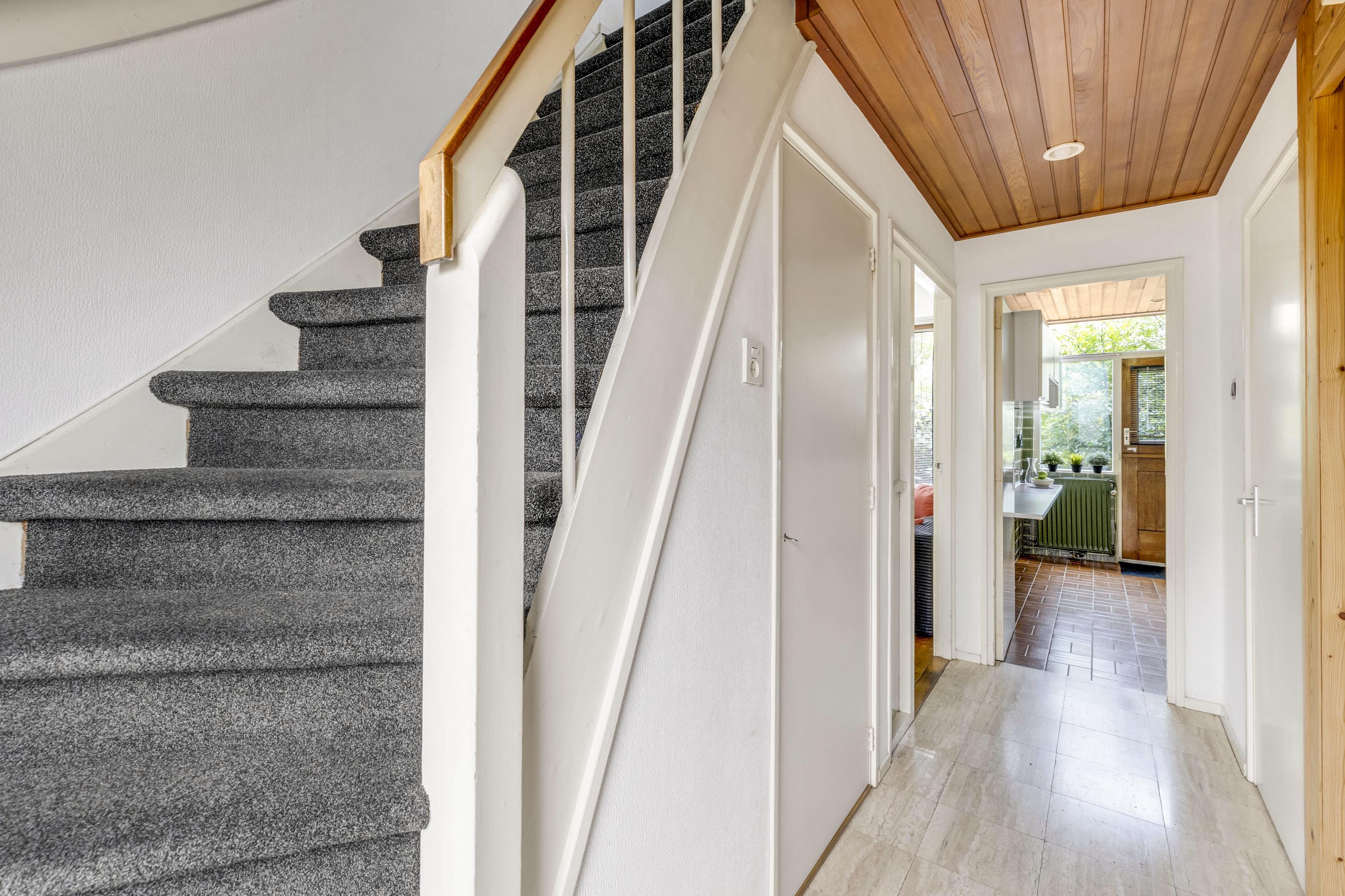 Overloop met vlizotrap naar de tweede verdieping. De gehele verdieping is v.v. tapijt.
