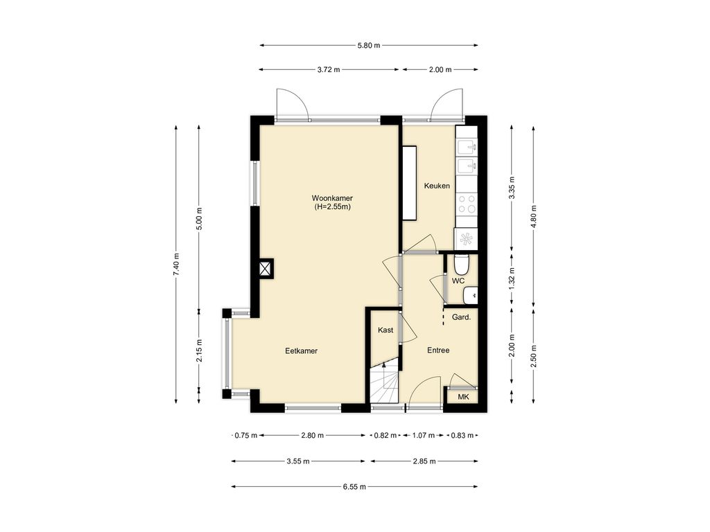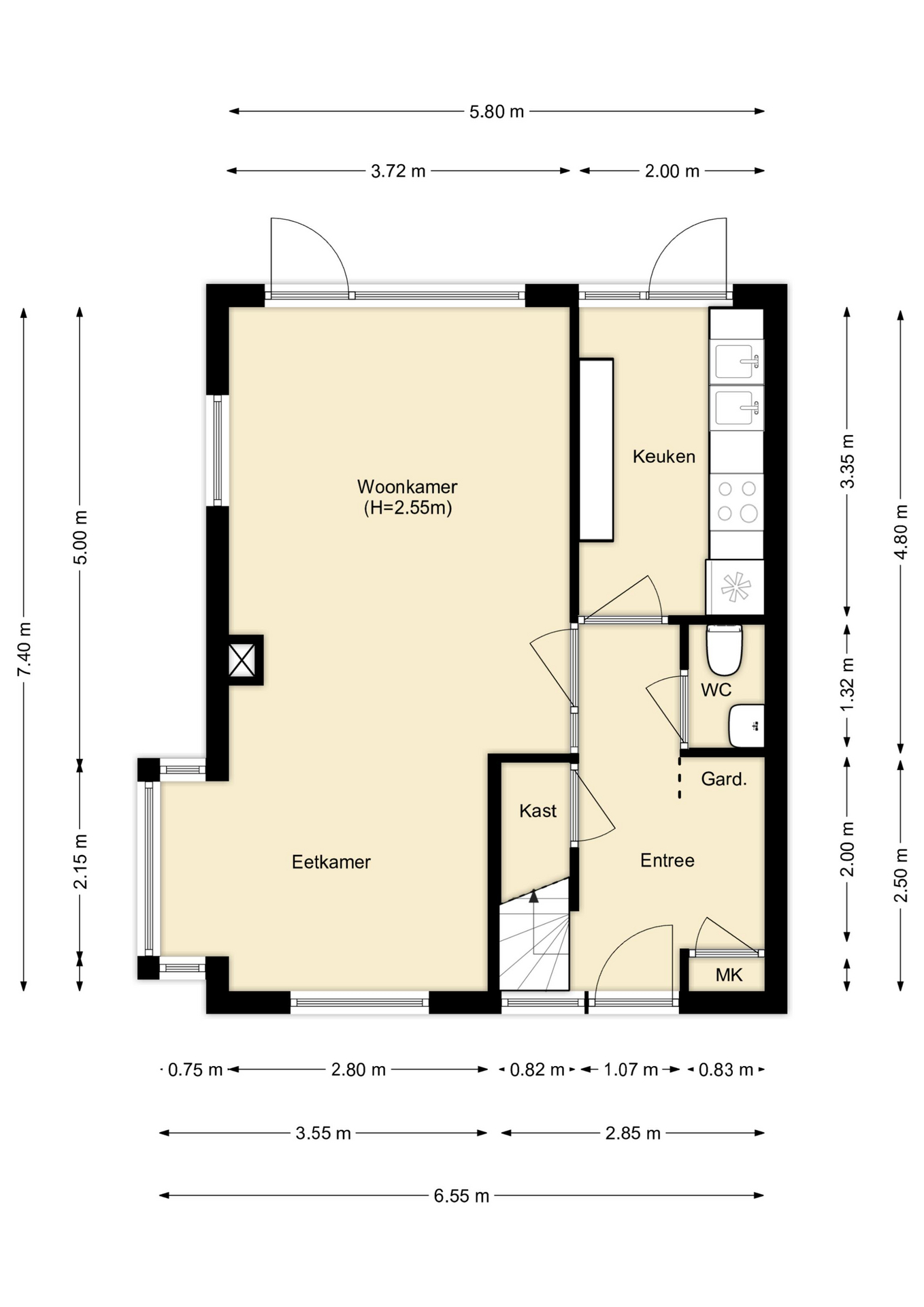 Woonkamer - ca. 7.40 x 3.72/ 2.80 m