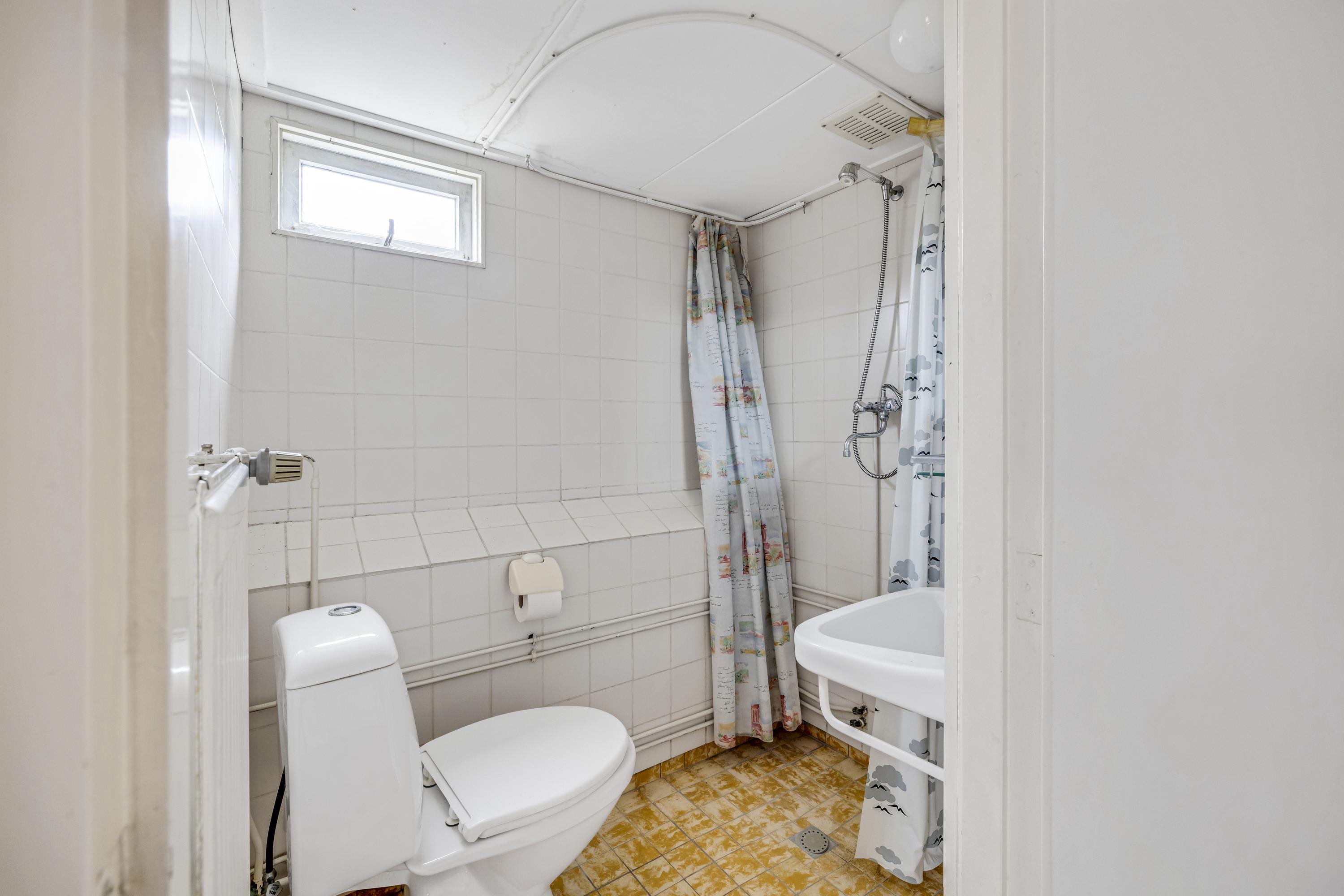 De eenvoudige badkamer is uitgevoerd met douche, wastafel en toilet.
