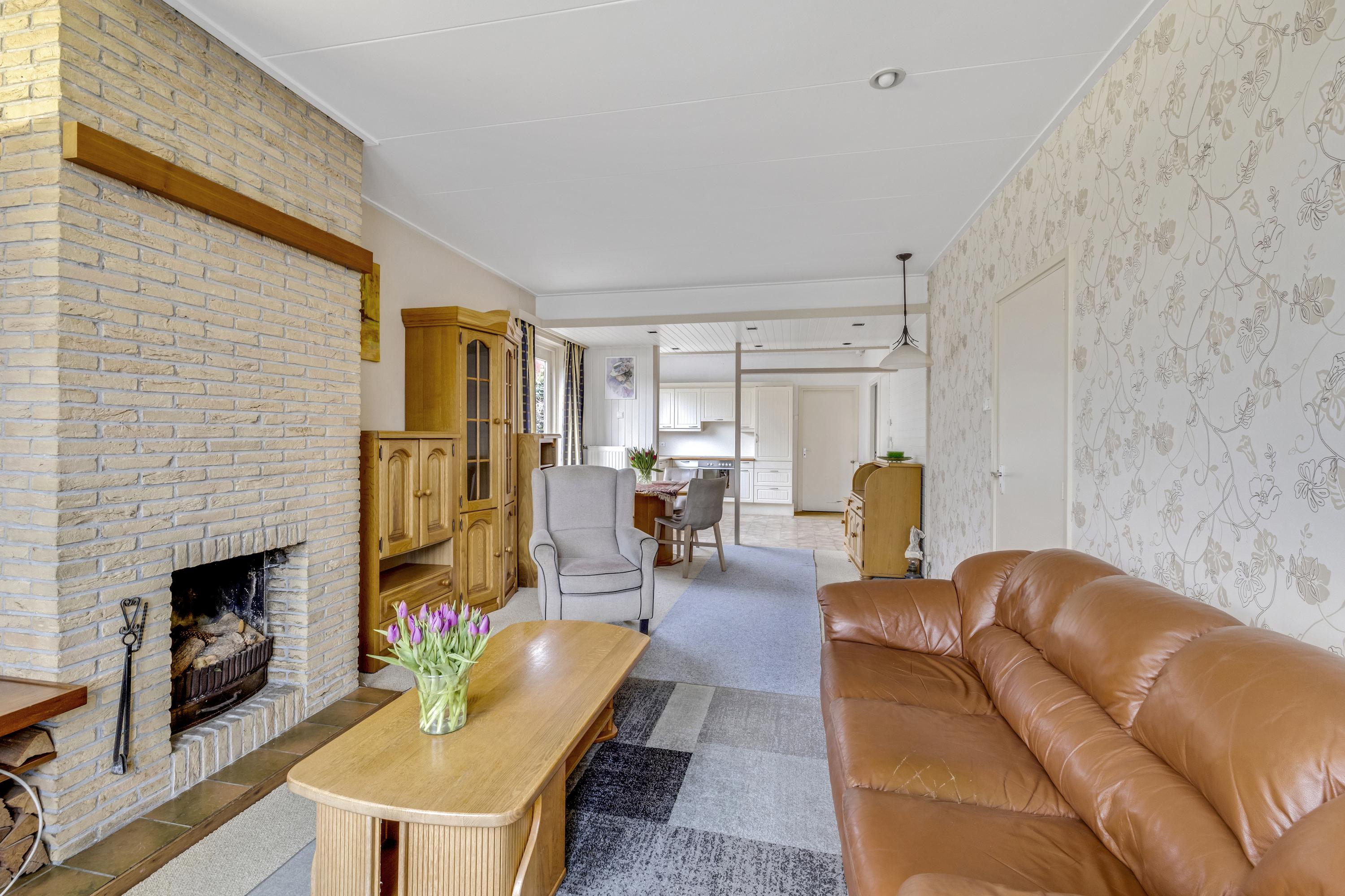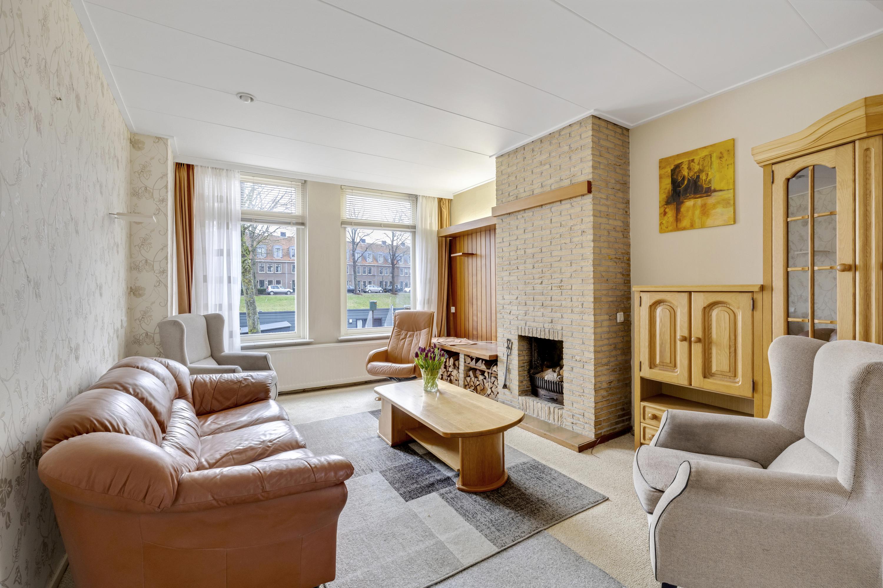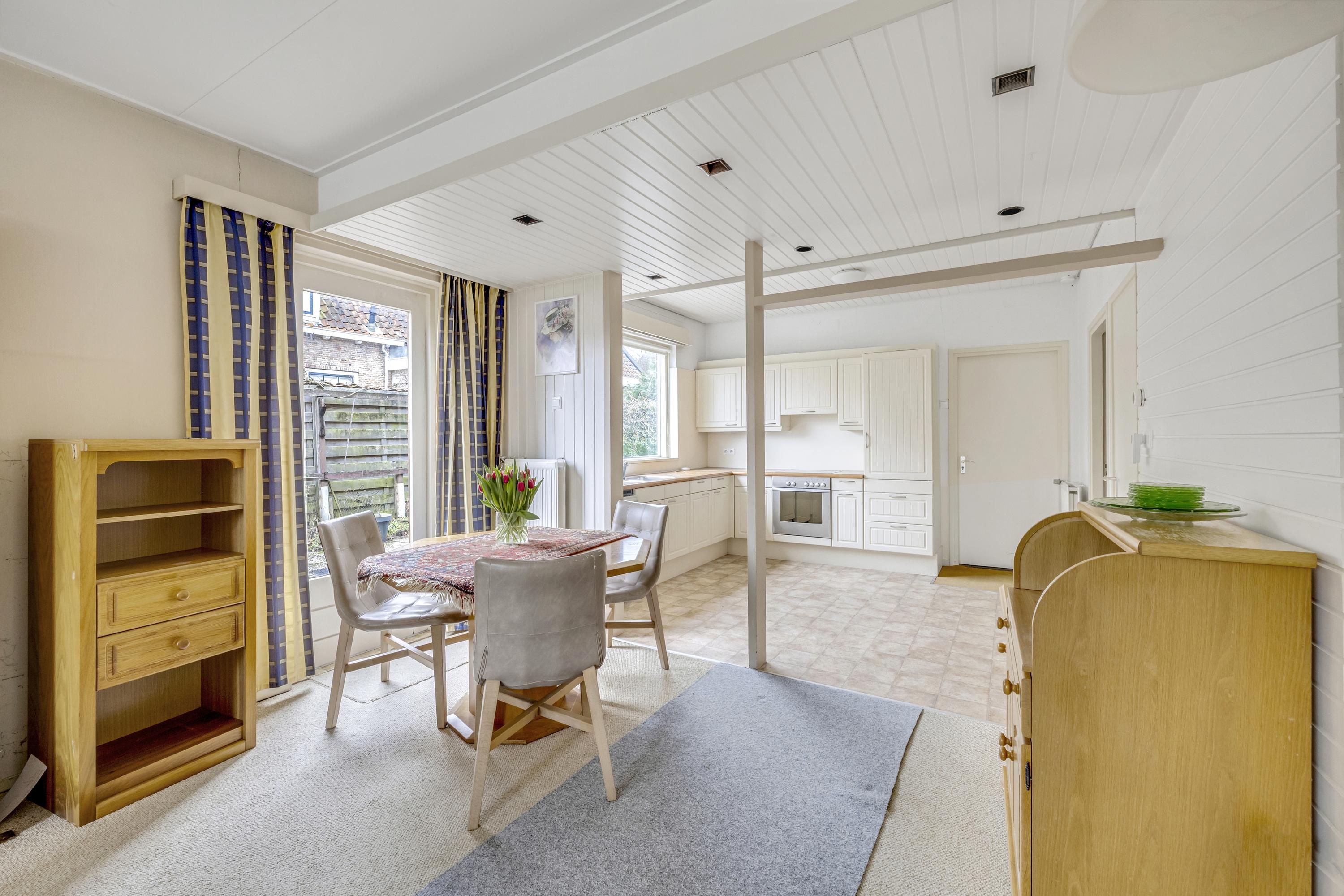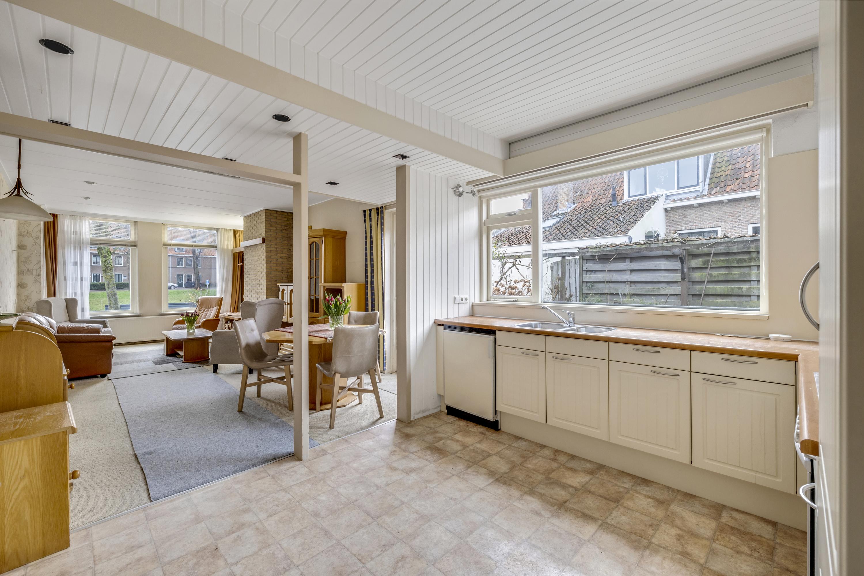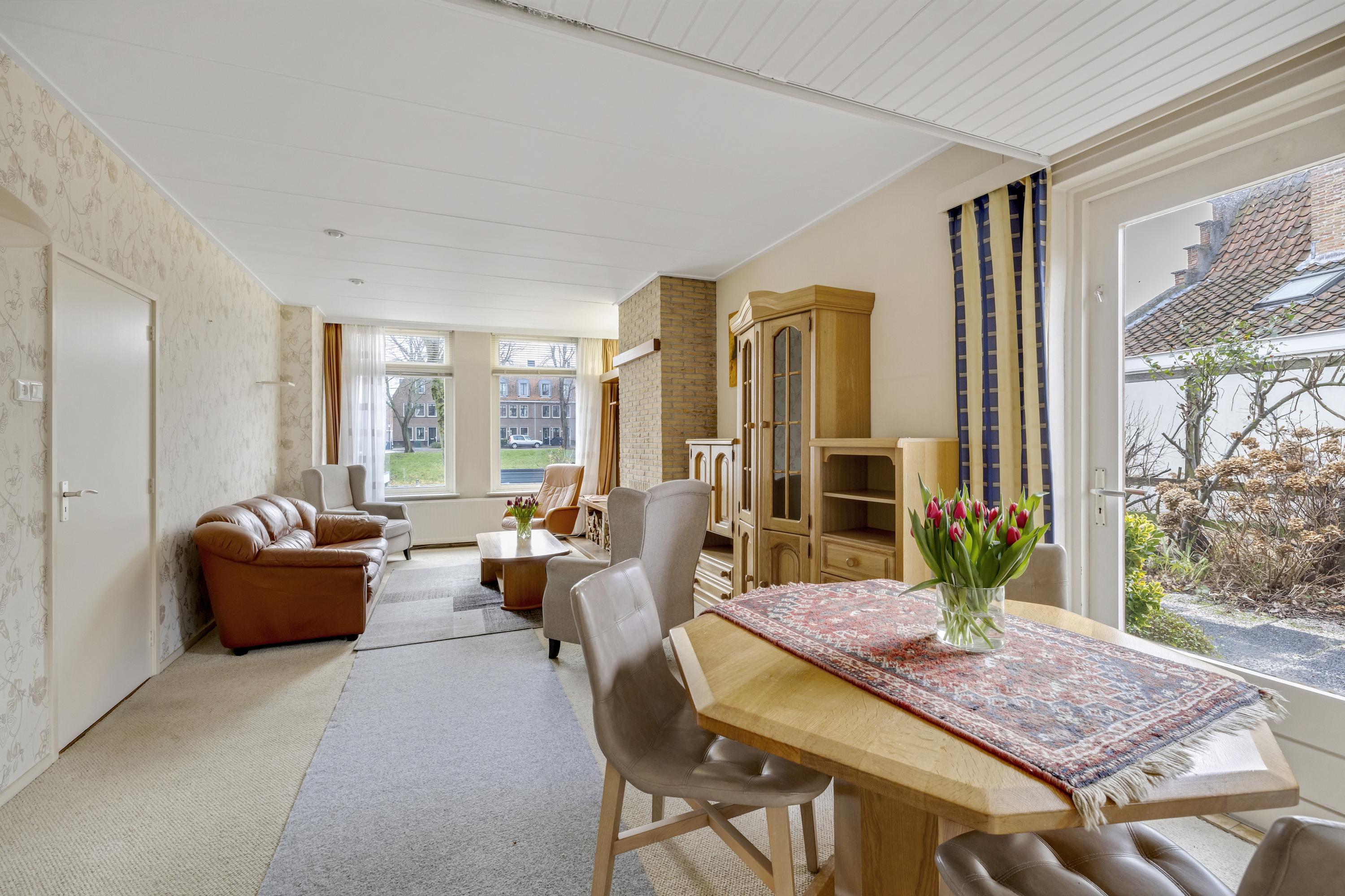 De woonkamer aan de havenzijde, met sfeervolle schouw, beschikt over een fraai uitzicht. Je kijkt zowel op de haven ÉN op de kerk. De vloer is v.v. tapijt. Via de deur is de zijtuin bereikbaar.