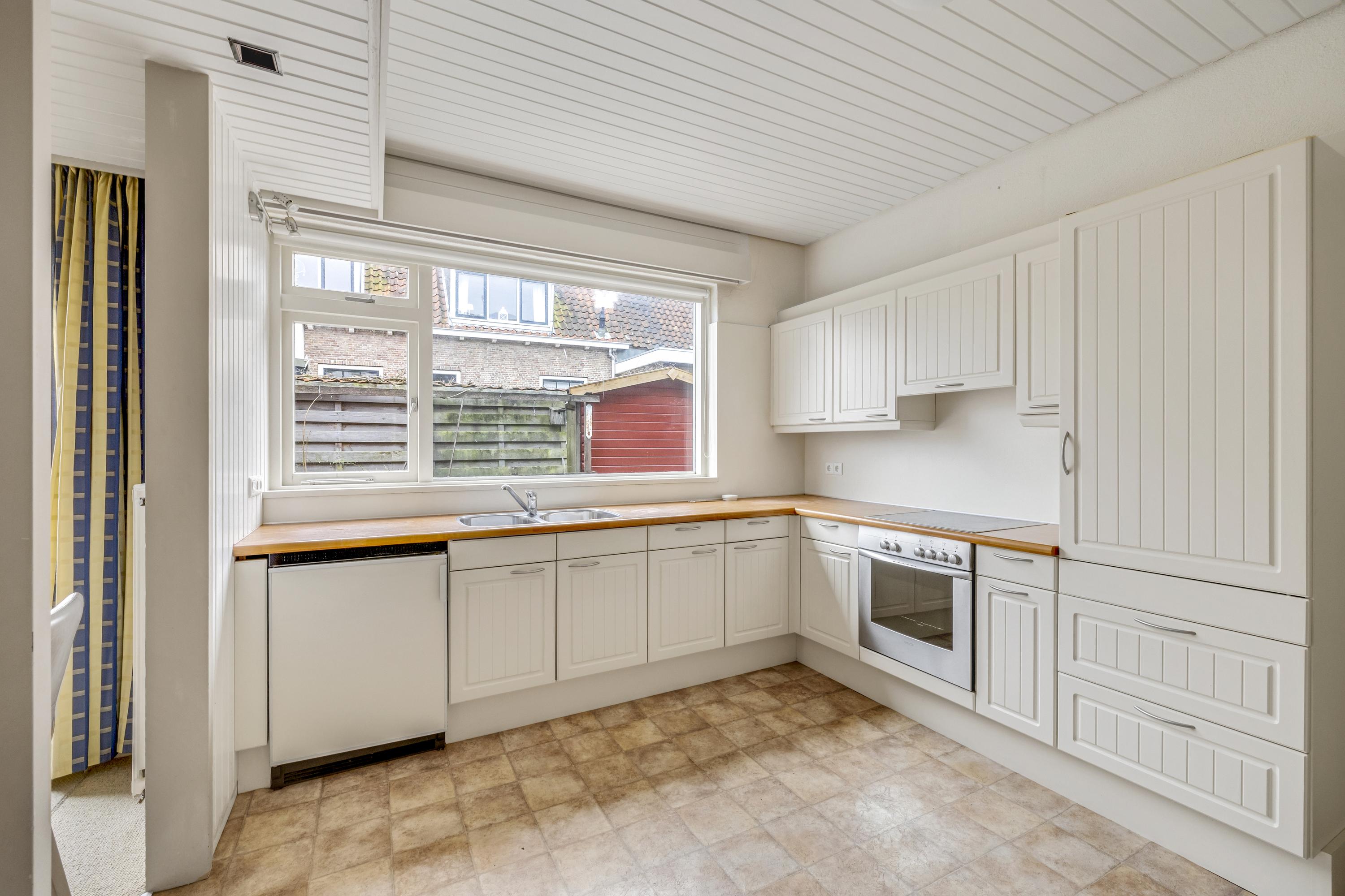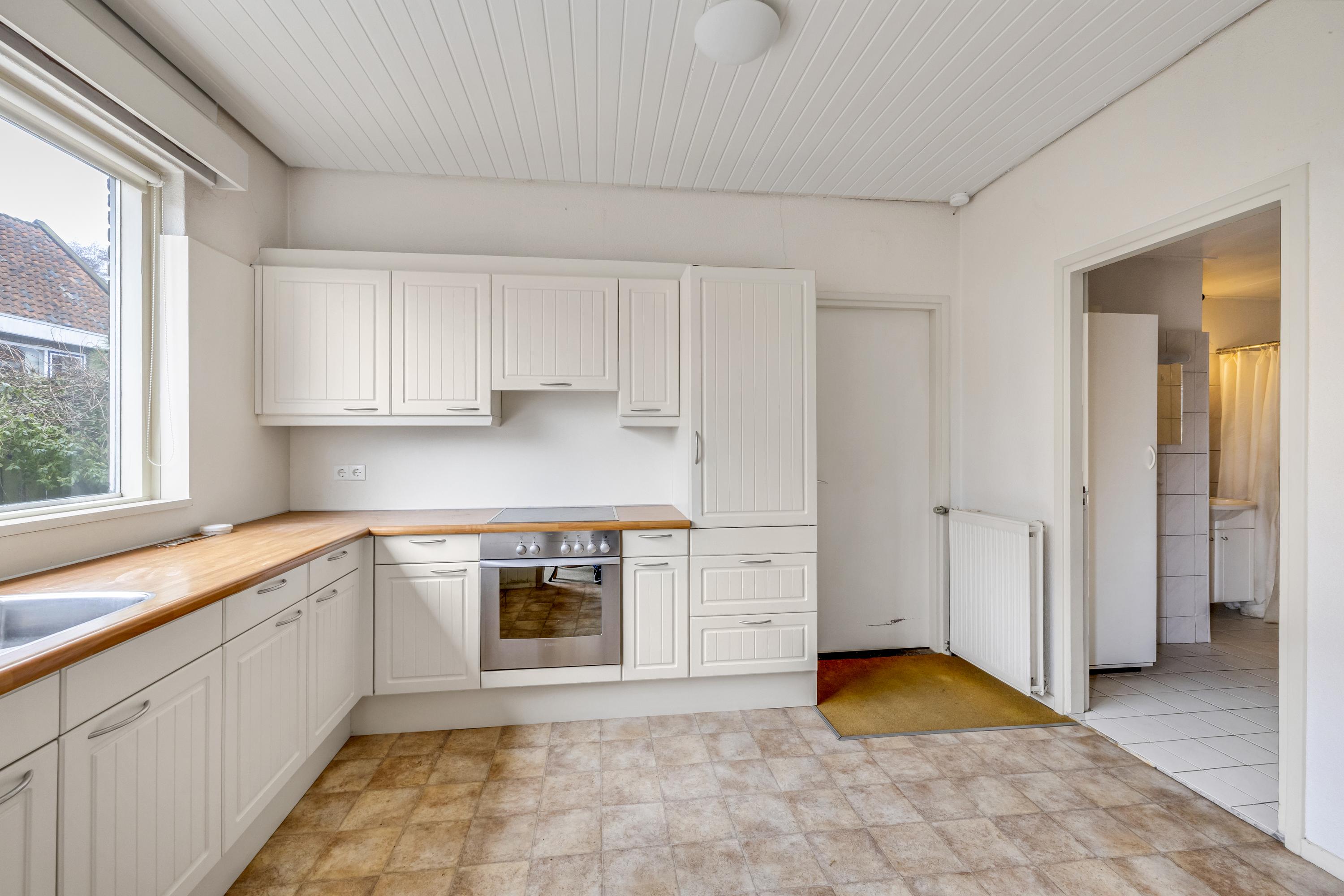 De open woonkeuken is uitgevoerd in een eenvoudige hoekopstelling en beschikt over een dubbele spoelunit, oven en afzuigkap. Tevens is er een vaste bergkast. De vloer is afgewerkt met zeil. Via de achterdeur in de keuken is de garage bereikbaar.
