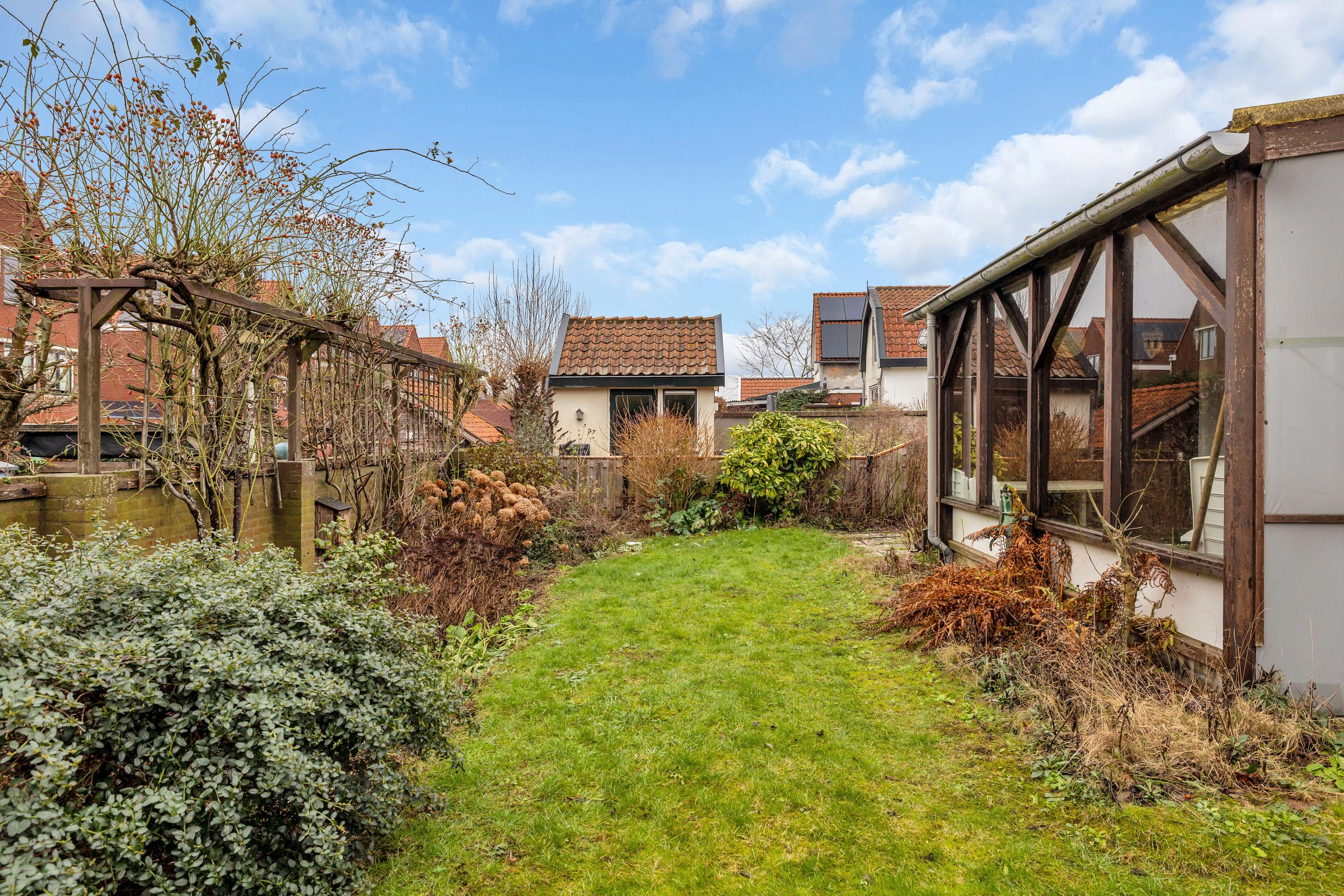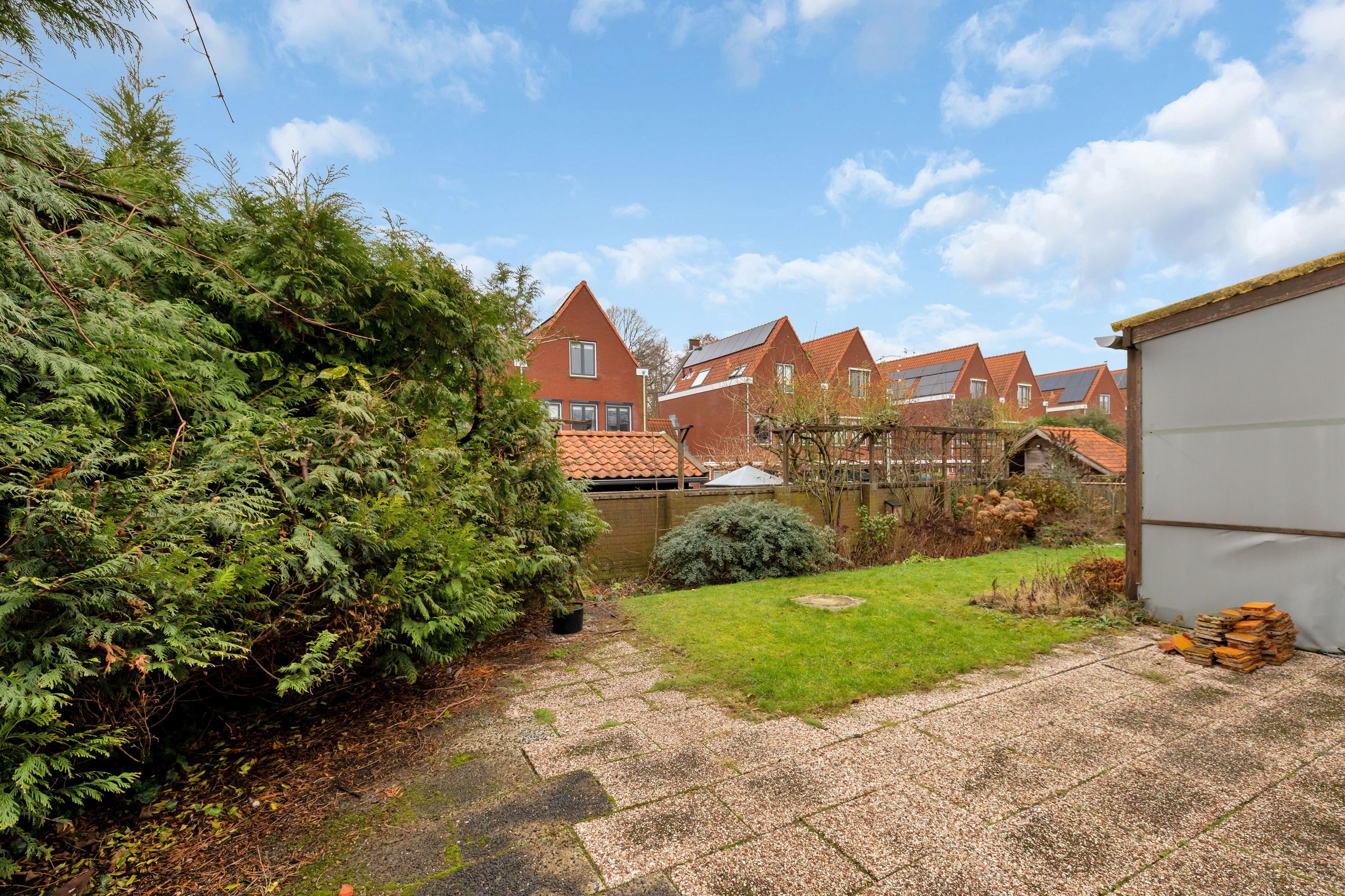 De tuin is gelegen naast en achter de woning. De zonnige tuin beschikt over een oprit, terras, gras, border en waterput. Achter de woning aan de garage is een eenvoudige terrasoverkapping.