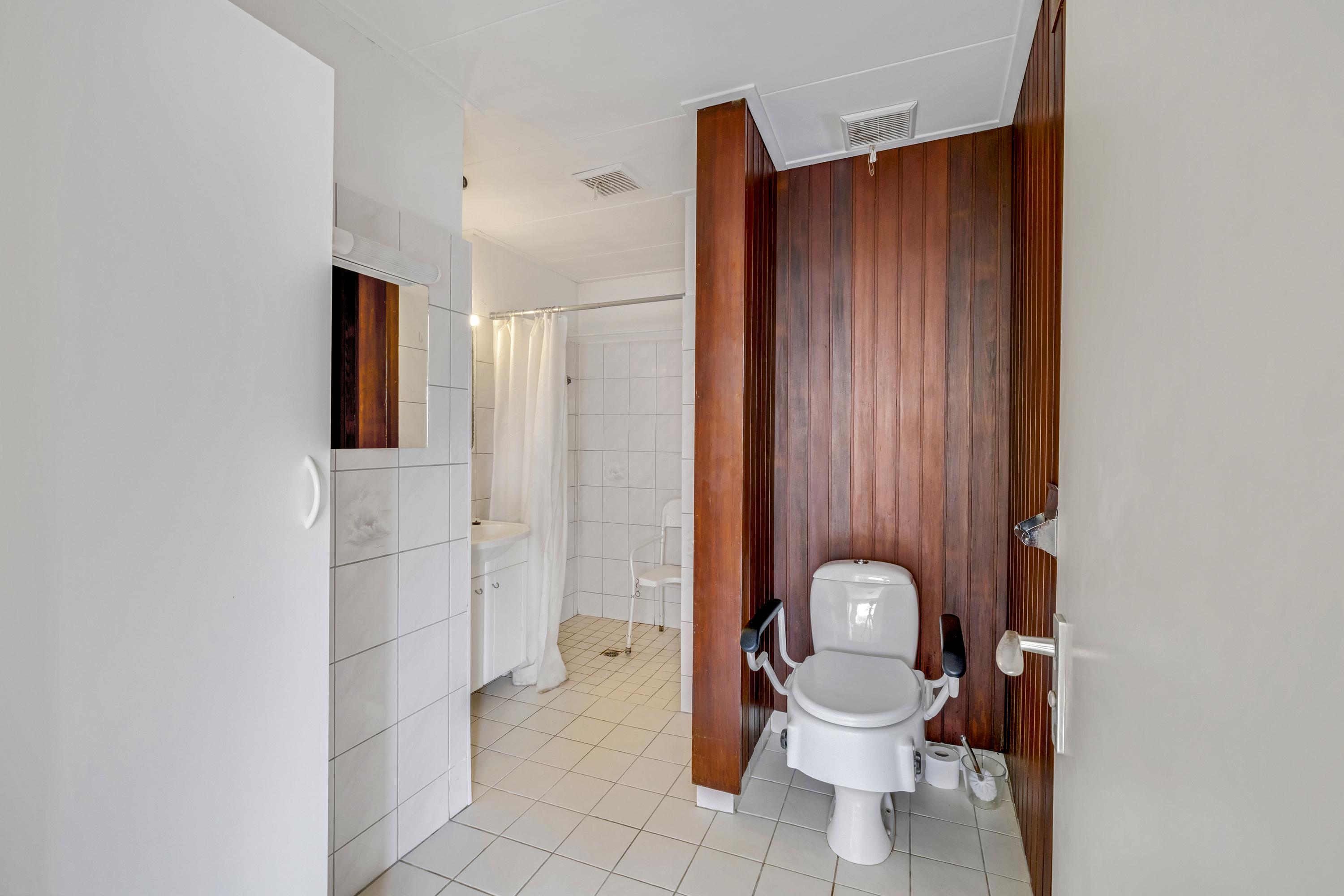 Vanuit de keuken is badkamer I bereikbaar. Deze is uitgevoerd met een douche, wastafelmeubel, toilet en radiator.