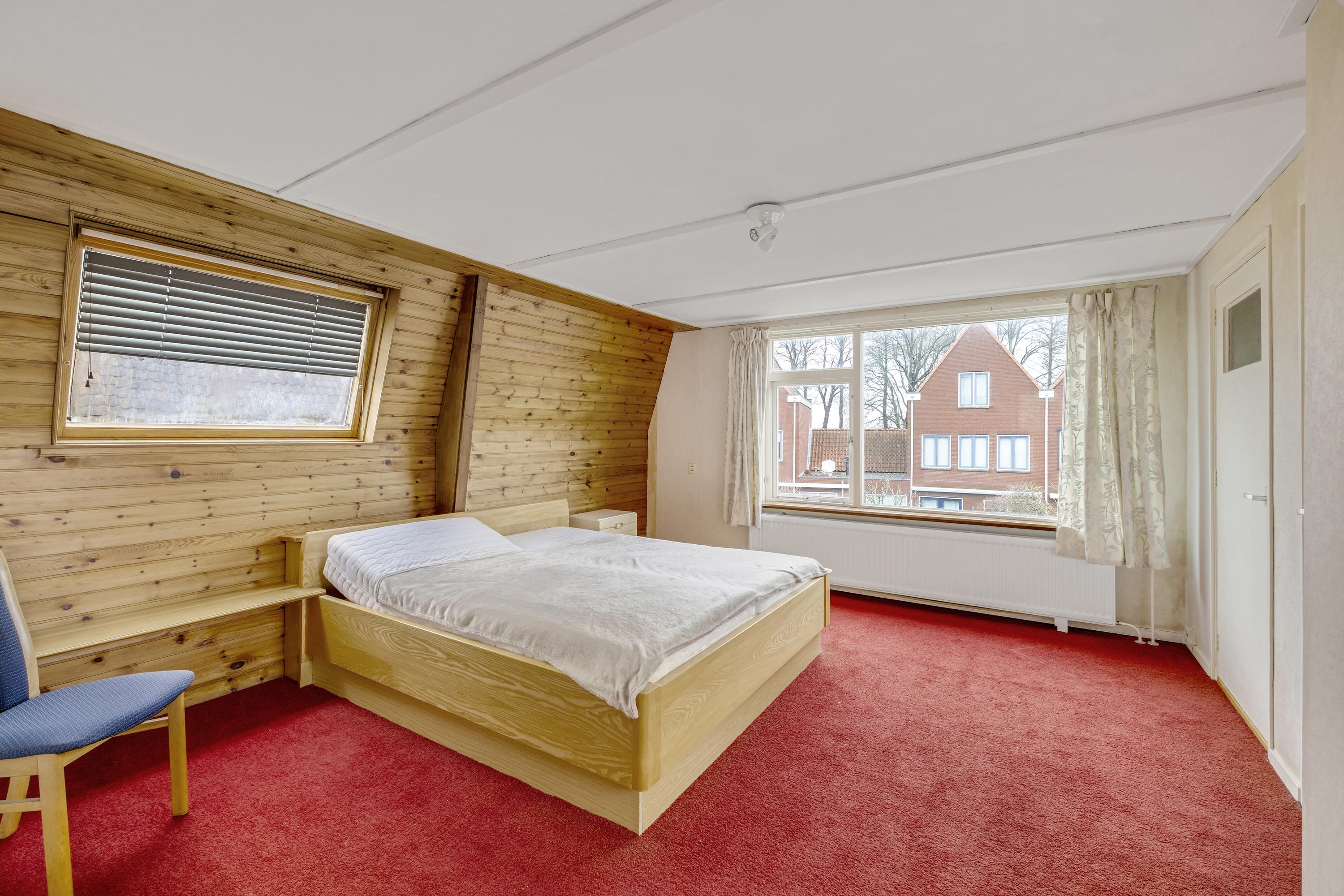 De slaapkamer met dakkapel is gelegen aan de zijkant van de woning.